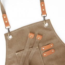 Promišljena konstrukcija s križnim naramenicama na leđima ravnomjerno raspoređuje težinu i drži pregaču sigurno na mjestu. Prednji dvostruki džep i manja pregrada primaju kuhinške i radne sitnice, dok su dvije petlje idealne za olovku ili alat.