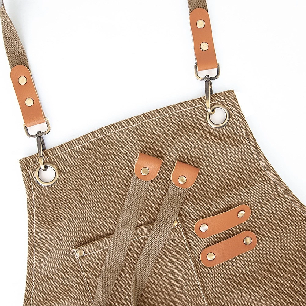 Čvrsto platno s pojačanim šavovima, metalne ušice i kožnati detalji za dug vijek u kuhinji i radionici.