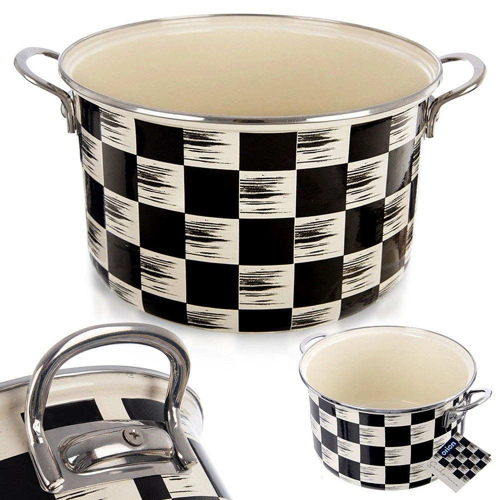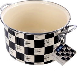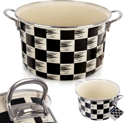 Stilski emajlirani lonac zapremine 6,5 l i promjera 26 cm u dizajnu crno-bež šahovnice. Izrađen od kvalitetnog emajliranog čelika s inox rubom i metalnim ručkama za siguran hvat. Pogodan za sve vrste štednjaka uključujući indukciju, za pećnicu i perilicu posuđa – idealan za kuhanje juha, umaka i variva.