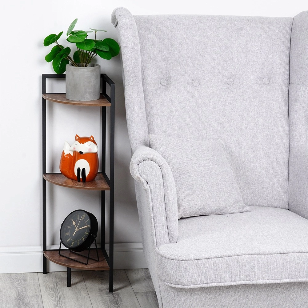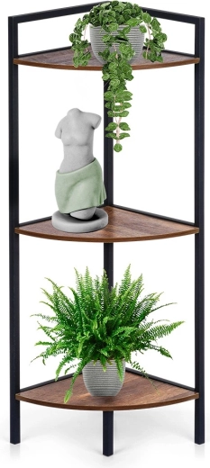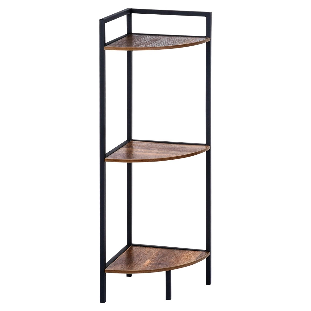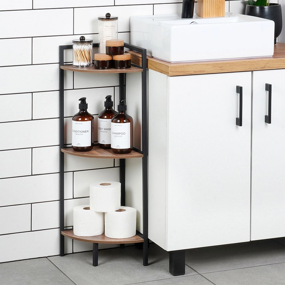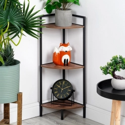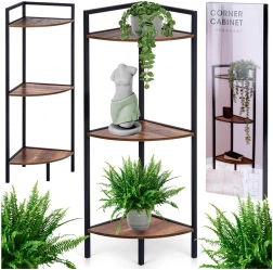 Kutna polica dimenzija 23,5 × 23,5 × 76 cm pametno je rješenje za male i veće prostore. Minimalistički dizajn u kombinaciji crnog metala i drvenog dekora djeluje prozračno i moderno, dok tri prostrane police osiguravaju pregledno odlaganje i stilsku prezentaciju vaših omiljenih predmeta.