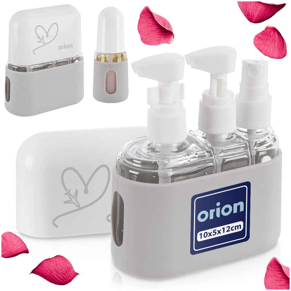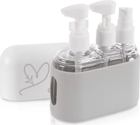 Ovaj kompaktan putni set bočica idealan je za avion, vikend-boravke, kampiranje i svakodnevno nošenje na posao ili u školu. Prozirno tijelo posudica omogućuje brzu provjeru sadržaja, bijeli čepovi čvrsto drže i štite od curenja. Izdržljivo etui sa silikonskim dnom drži bočice stabilno na mjestu i štiti ih od oštećenja i nečistoća.