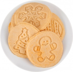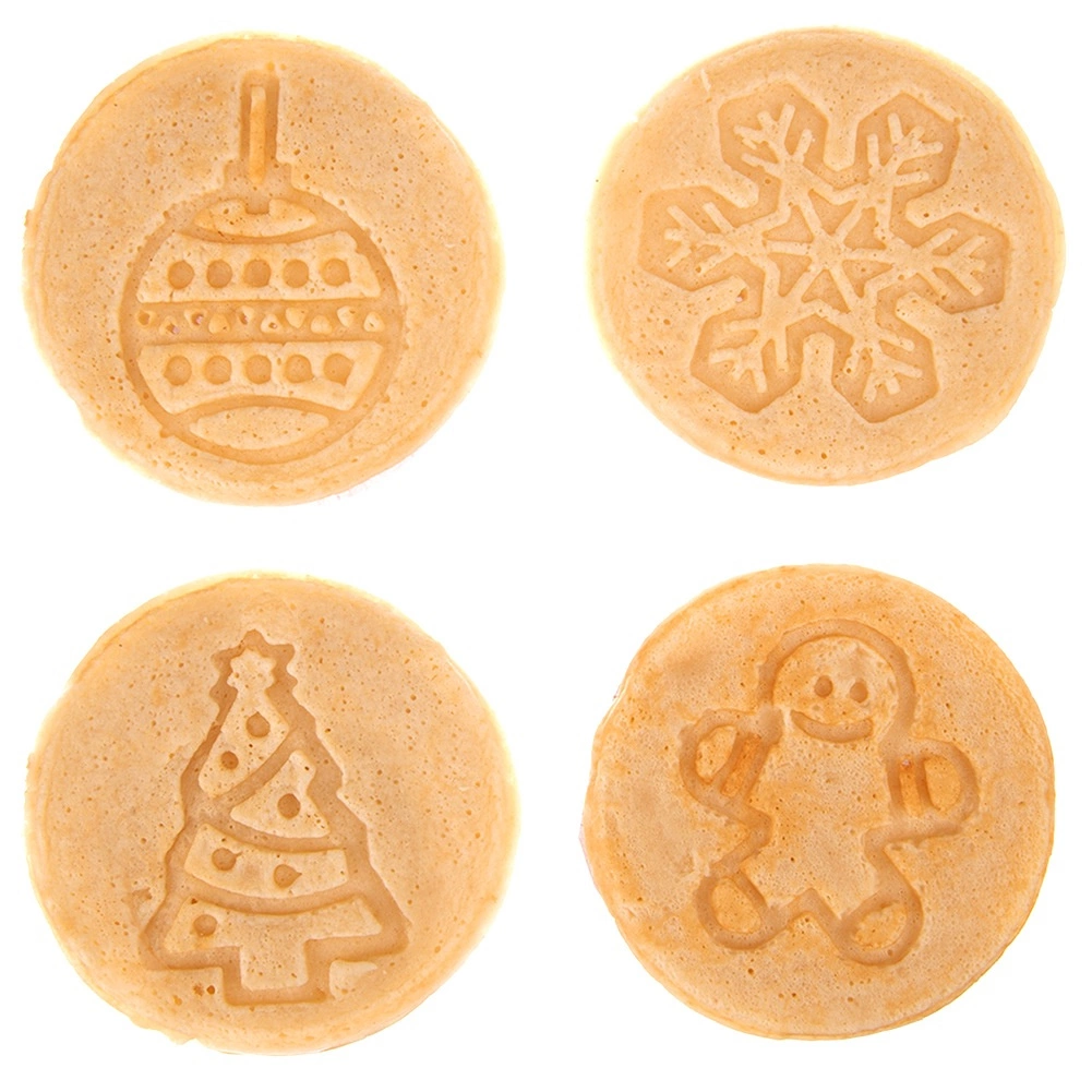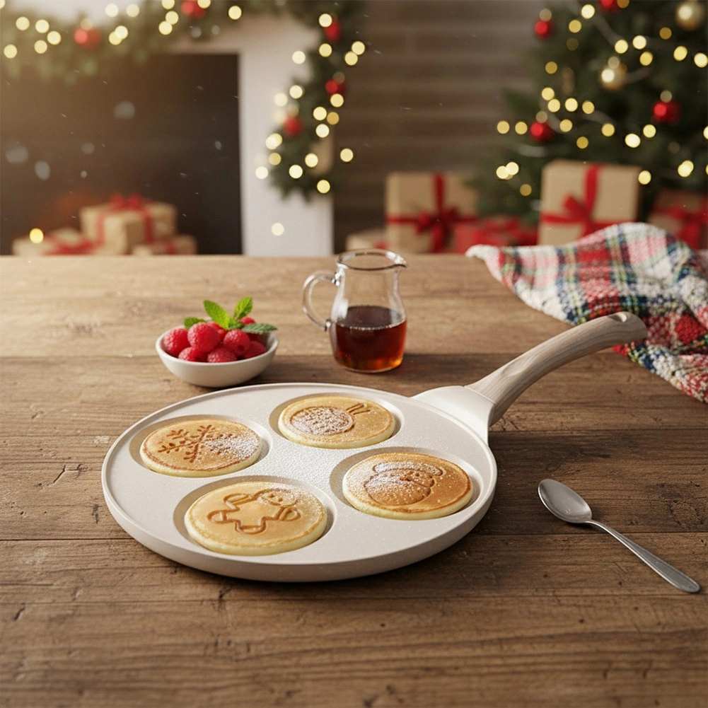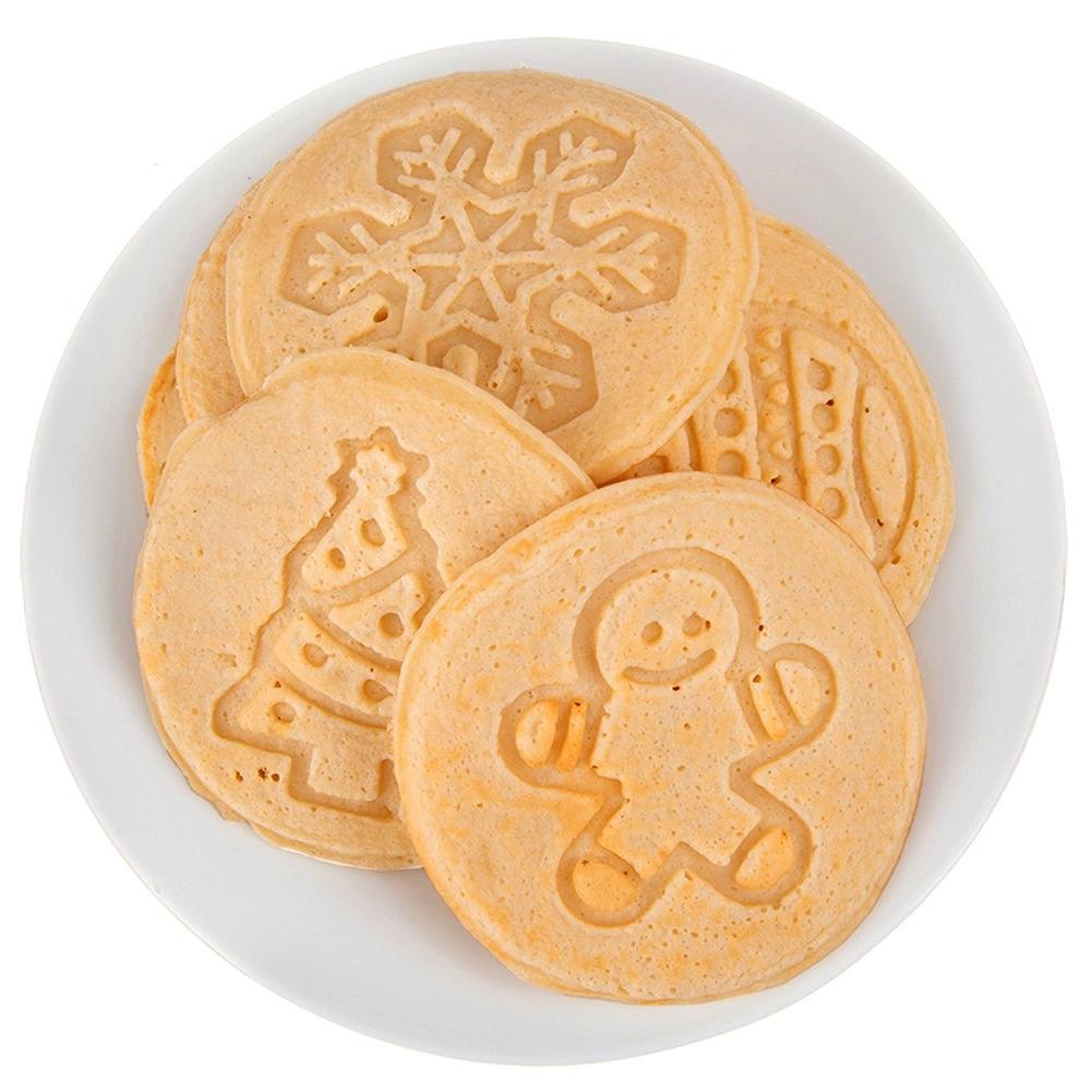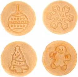Četiri kružna kalupa s reljefom kuglice, jelke, medenjaka i pahuljice stvaraju razigrane porcije palačinki i jaja – idealno za djecu i blagdanski stol.