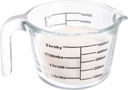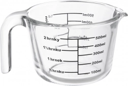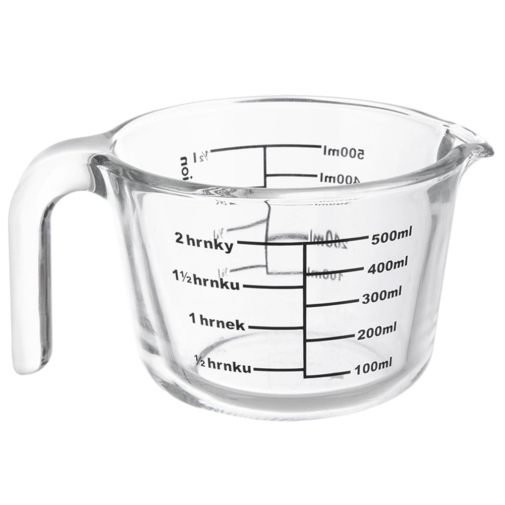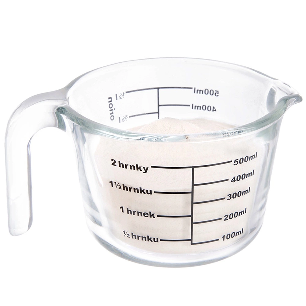 - Precizna i pregledna skala u ml (100–500 ml po 100 ml), litrima (1/8 l do 1/2 l) i šalicama (1/2 do 2).