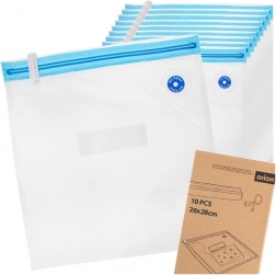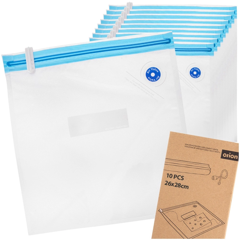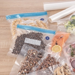 Jedna je strana vrećice glatka, a druga sa posebnom strukturom za brzo i ravnomjerno izvlačenje zraka. Set sadrži 10 komada i 2 klizna zatvarača za jednostavno i čvrsto zatvaranje. Idealno za meso, povrće, sireve, pekarske proizvode, orašaste plodove i gotova jela – kod kuće i na putu.