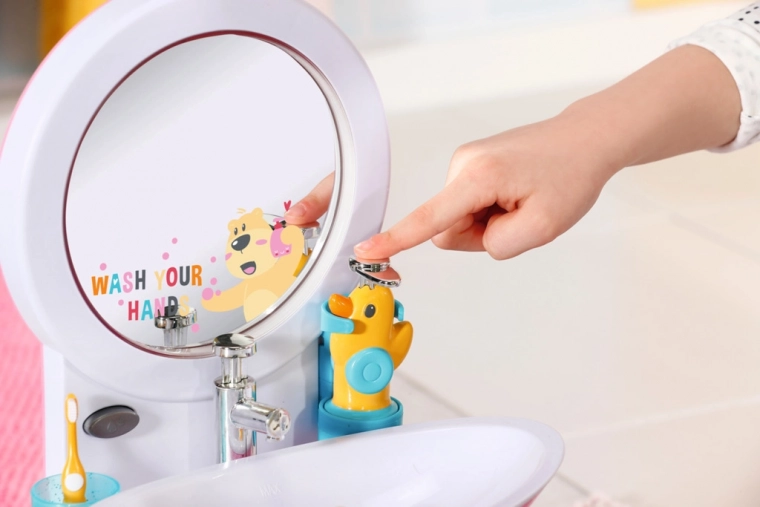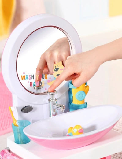 Zabavni umivaonik za lutku BABY born pretvara svakodnevnu higijenu u igru. Pritiskom na gumb ogledalo se osvijetli i pokrene se melodija kao timer za pranje ruku. Dozator sapuna, tekuća voda pri pritisku na slavinu i čep u obliku pačića čine igru realističnim doživljajem. U kompletu su četkica za zube, čašica sa zvukovima čišćenja zubi i ručnik.