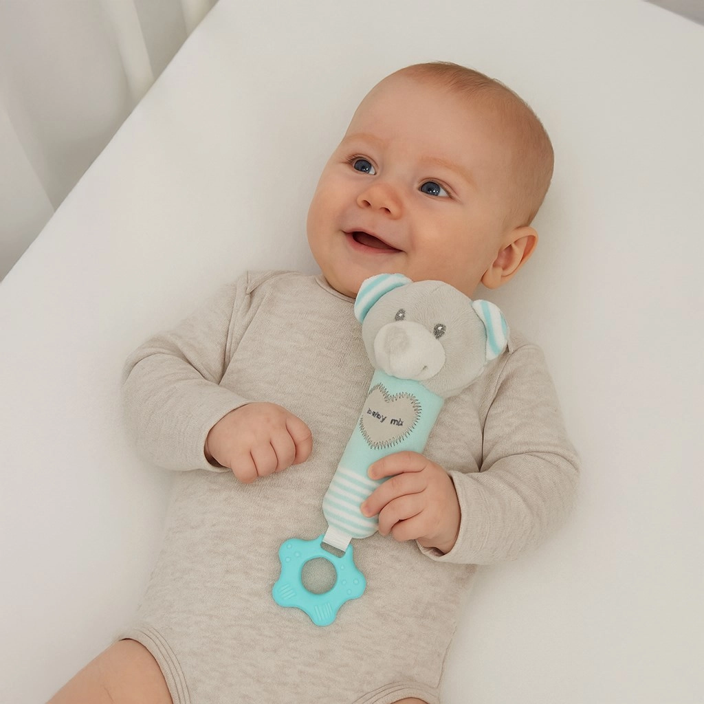Plišana igračka BABY MIX u obliku mede u mint boji dizajnirana je za najmanje ručice. Mekani pliš ugodan je na dodir, dok pištalica i zvečkalo potiču sluh i znatiželju djeteta. Integrirano grizalo pruža olakšanje pri rastu zubića i potiče sigurno grickanje.