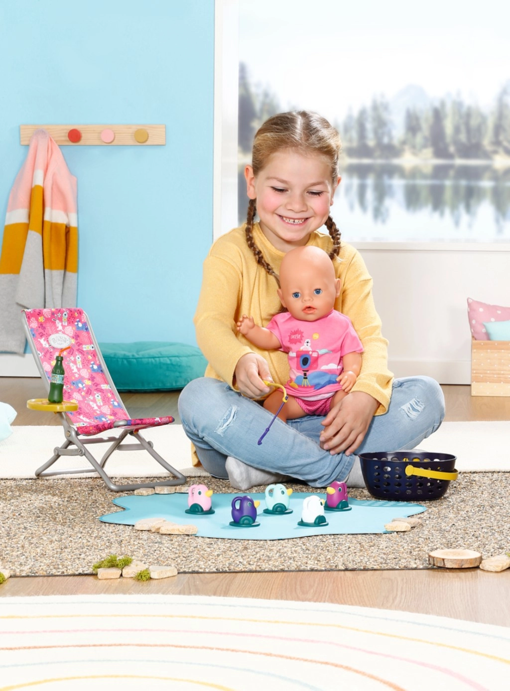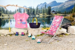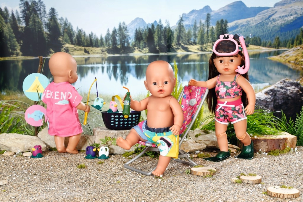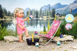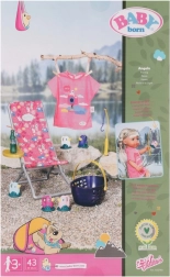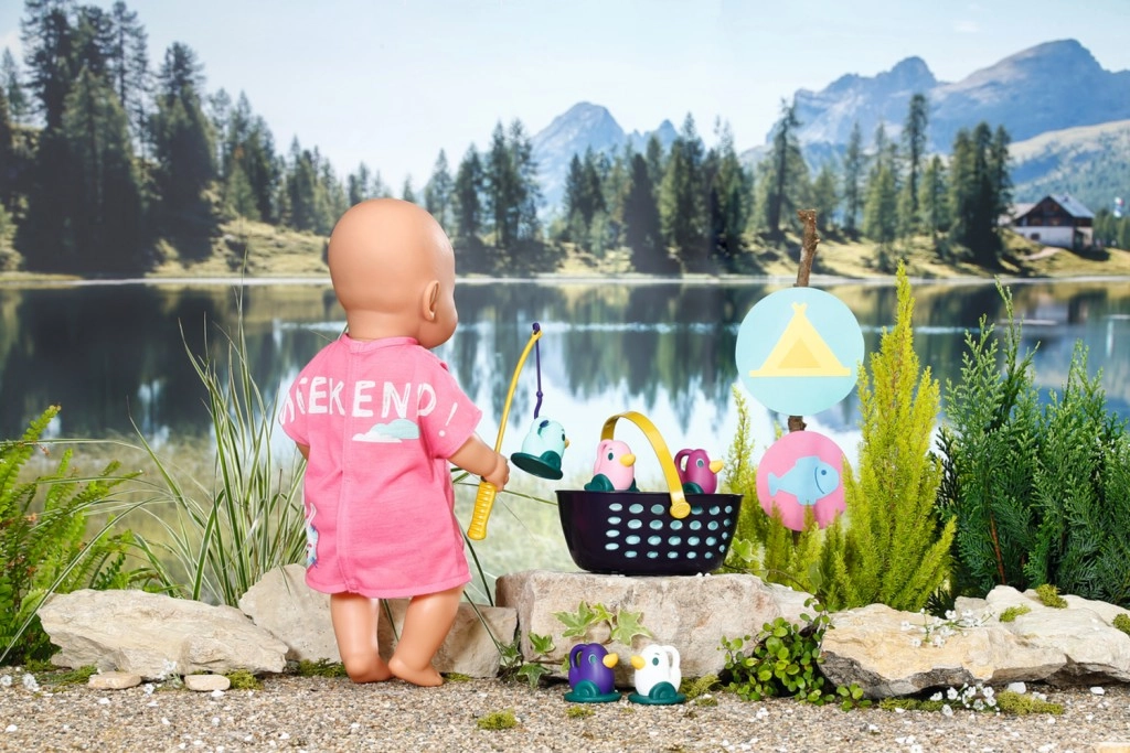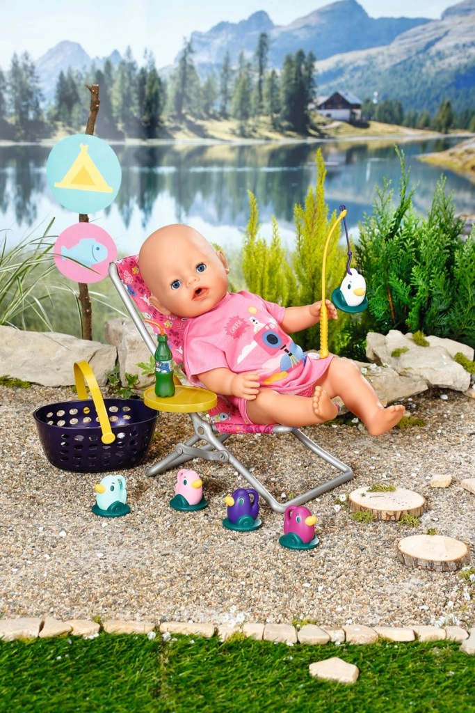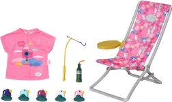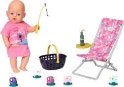 BABY born Vikend set za pecanje sadrži odjeću, ležaljku sa stolićem, bocu limunade, košaricu, 5 pačića i ribarski štap.