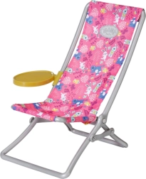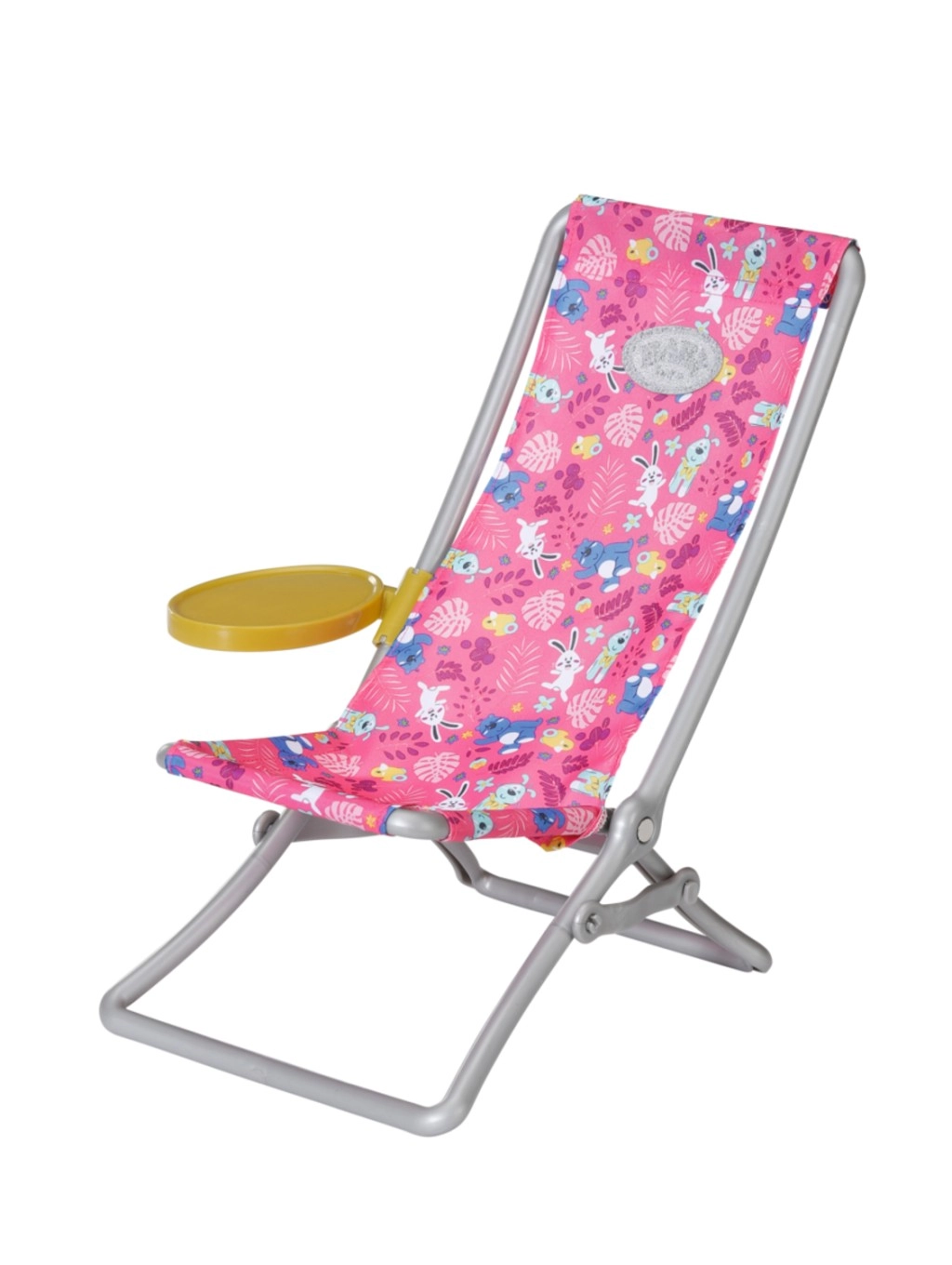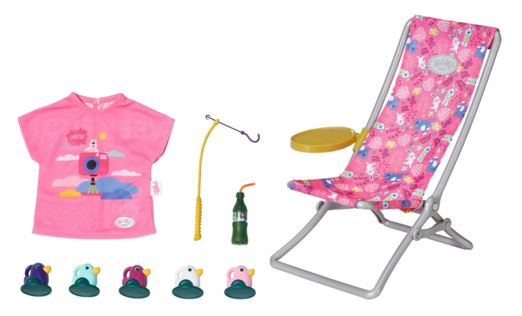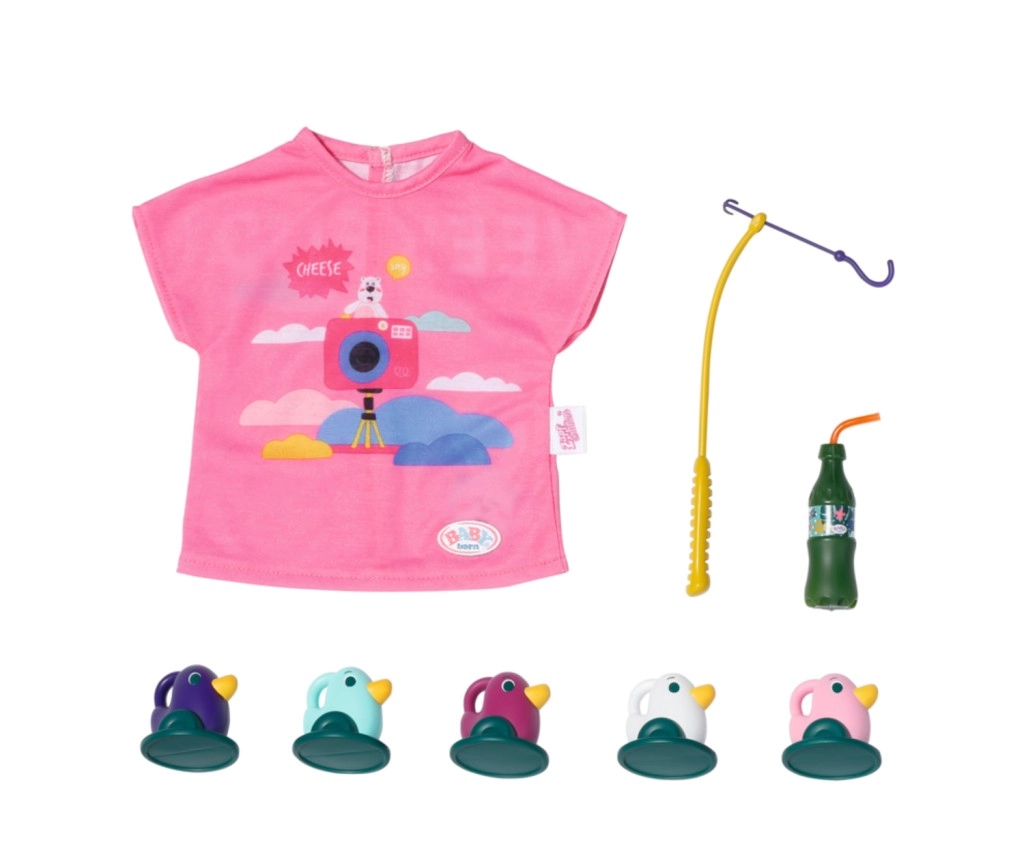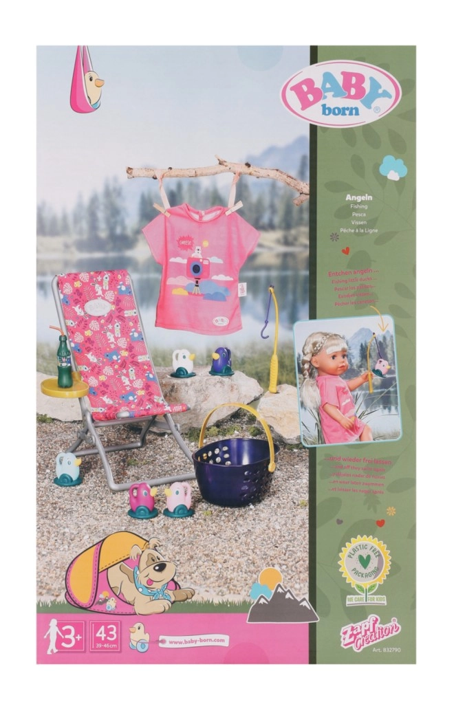 „U moru ima puno više ribe…“ Ali BABY born radije lovi simpatične pačiće. Dok udobno sjedi u ružičastoj ležaljci s colorful uzorkom, pokušava udicom uhvatiti jednog od pet pačića. S vremena na vrijeme srkne limunadu koja stoji na žutom stoliću pokraj ležaljke. Kada ulovi sve pačiće i spremi ih u plavu košaru, vraća ih natrag u ribnjak i zabavna igra može početi ispočetka. Za ovu igru pecanja BABY born je odjenula ležernu dugu ružičastu majicu s preslatkim printom.