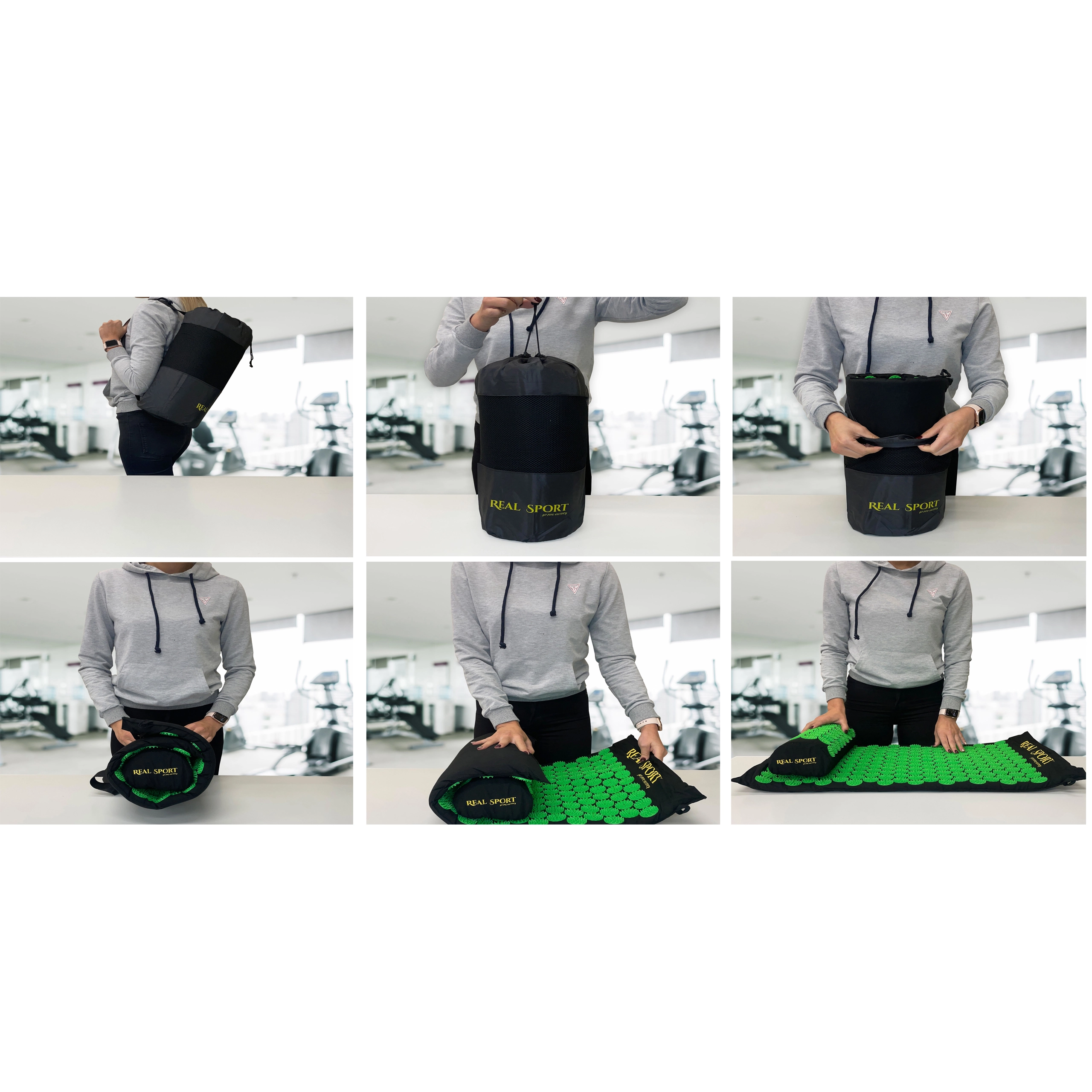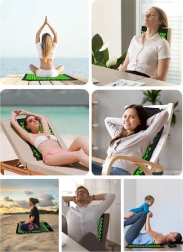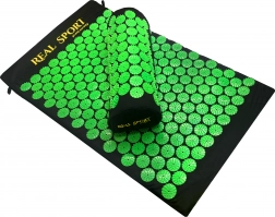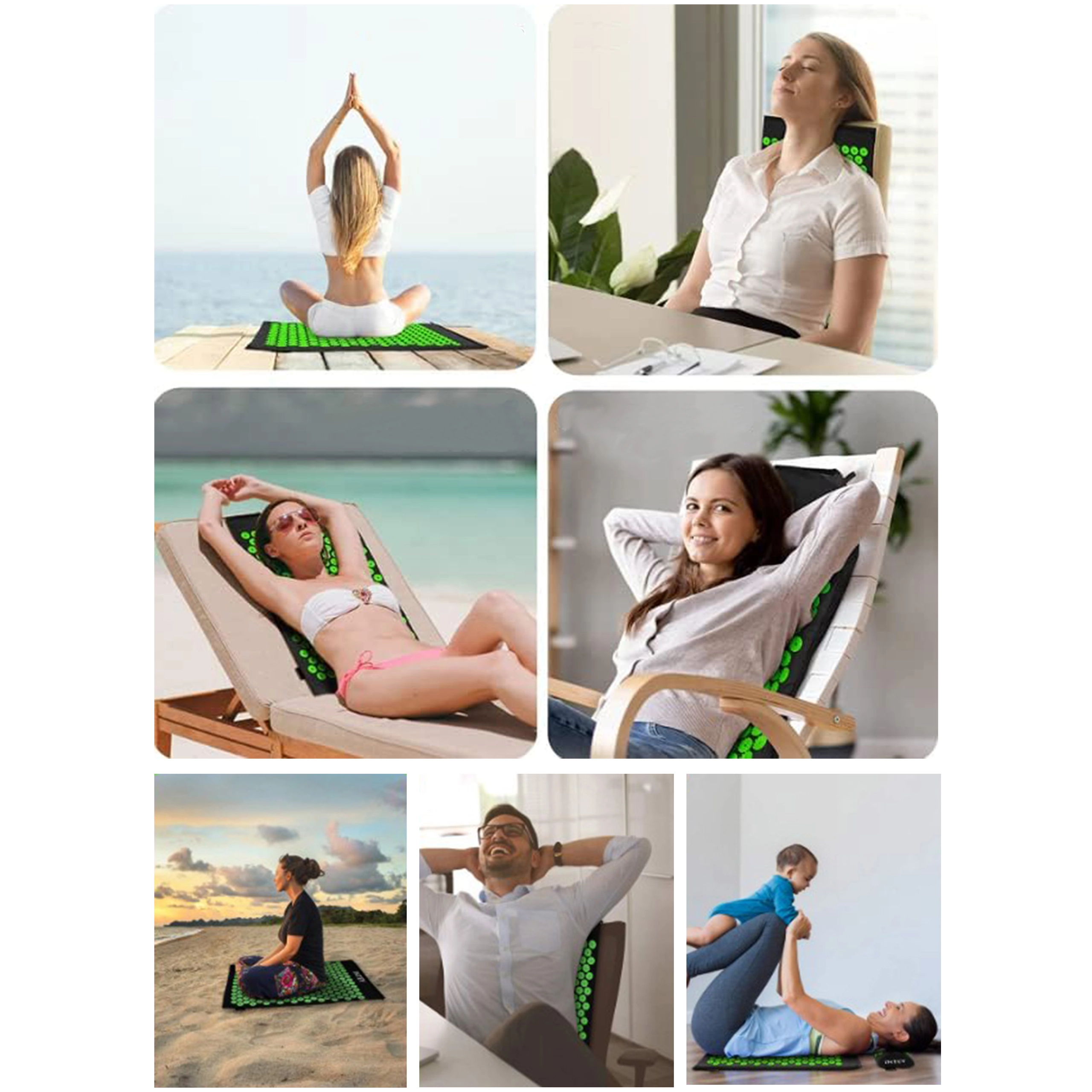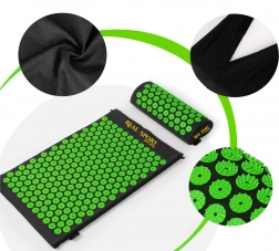 Akupresurni set (podloga + jastučić) oponaša učinak tradicionalne akupresure i pomaže ublažiti napetost leđa, vrata i ramena. Deseci zelenih diskova sa šiljcima ciljaju točke pritiska, čime potiču opuštanje, regeneraciju mišića i prirodnu cirkulaciju. Zahvaljujući laganoj konstrukciji i torbi lako ga ponesete kući, u ured ili na put.