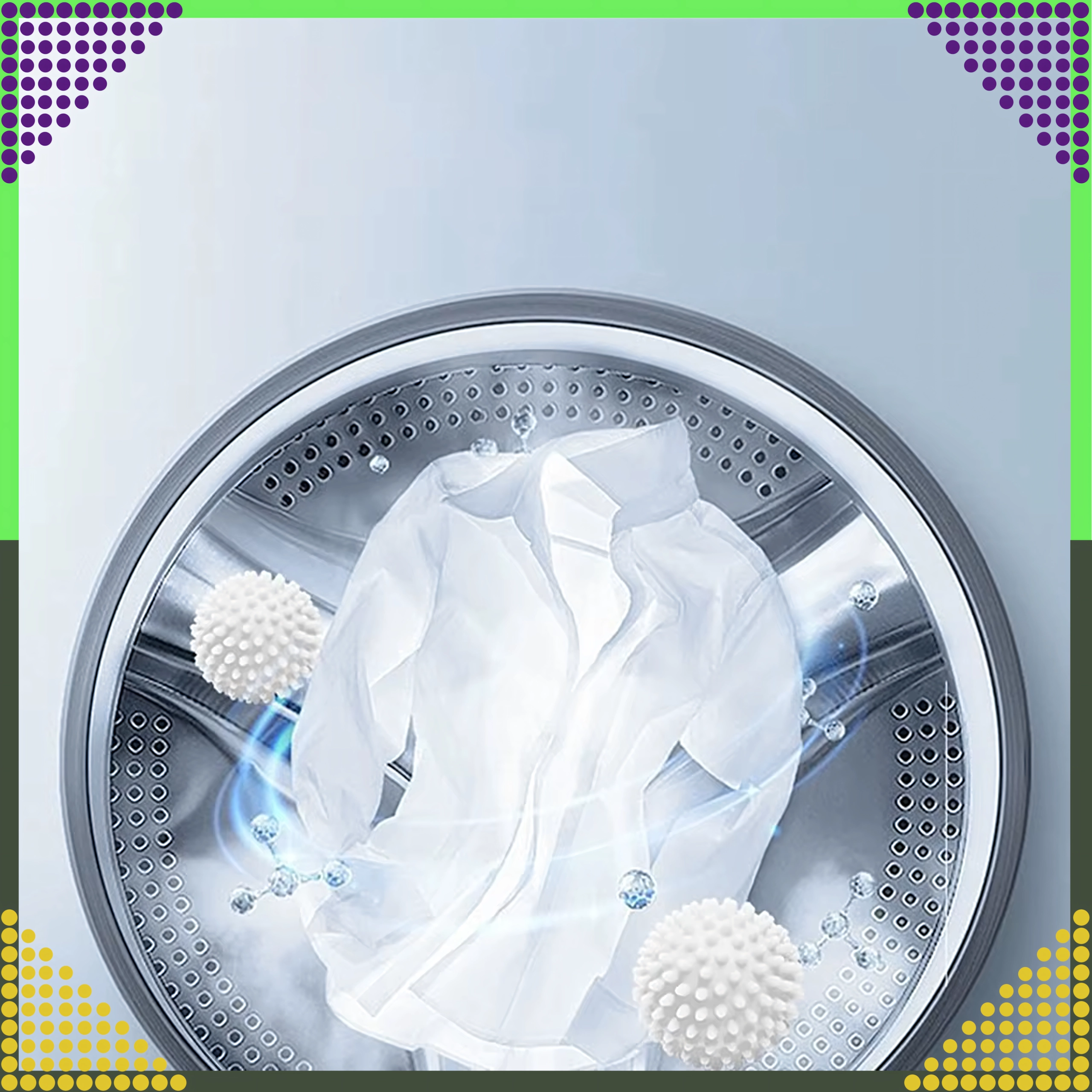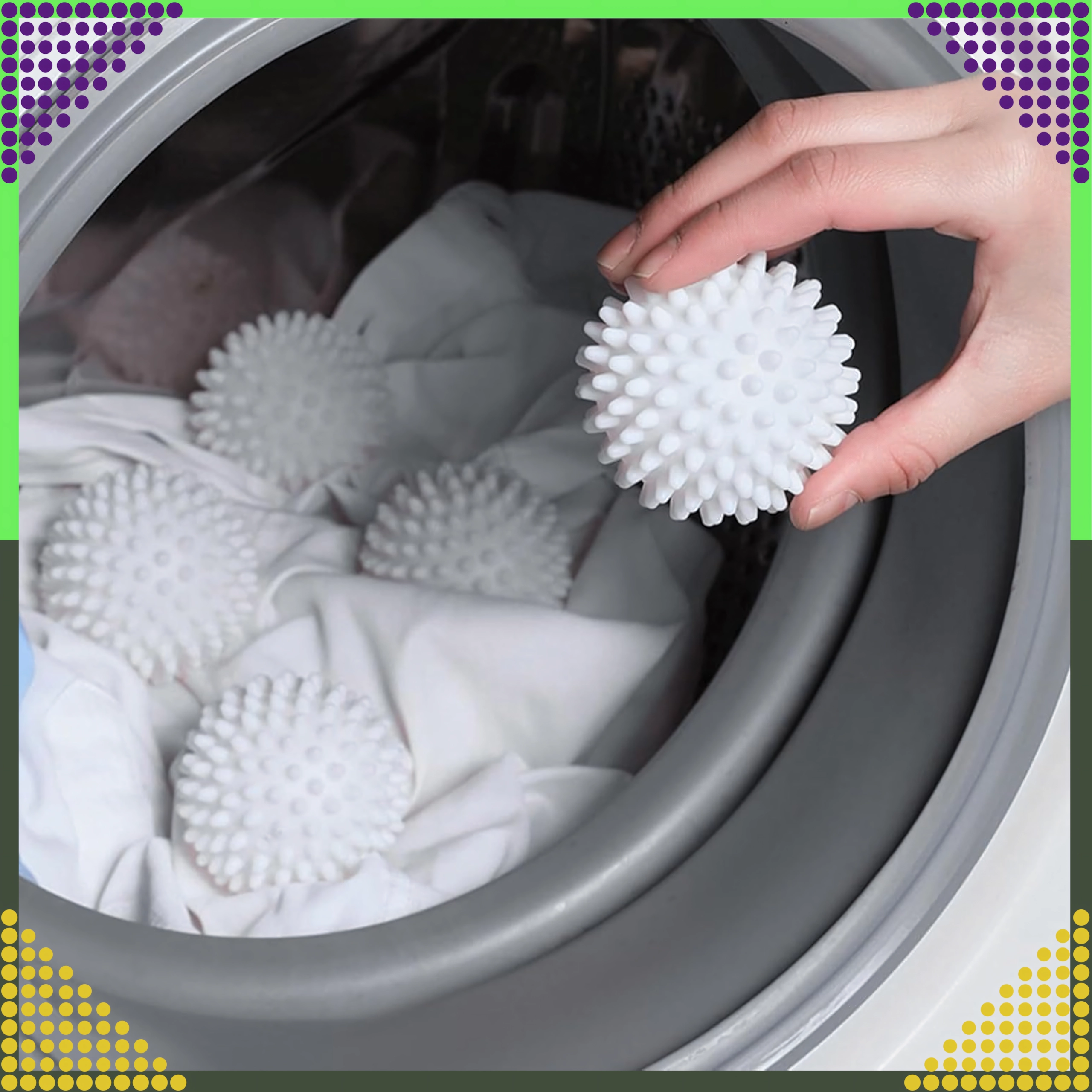 Kuglice odvajaju slojeve rublja, poboljšavaju strujanje zraka u bubnju i skraćuju vrijeme sušenja, što štedi energiju i vrijeme.