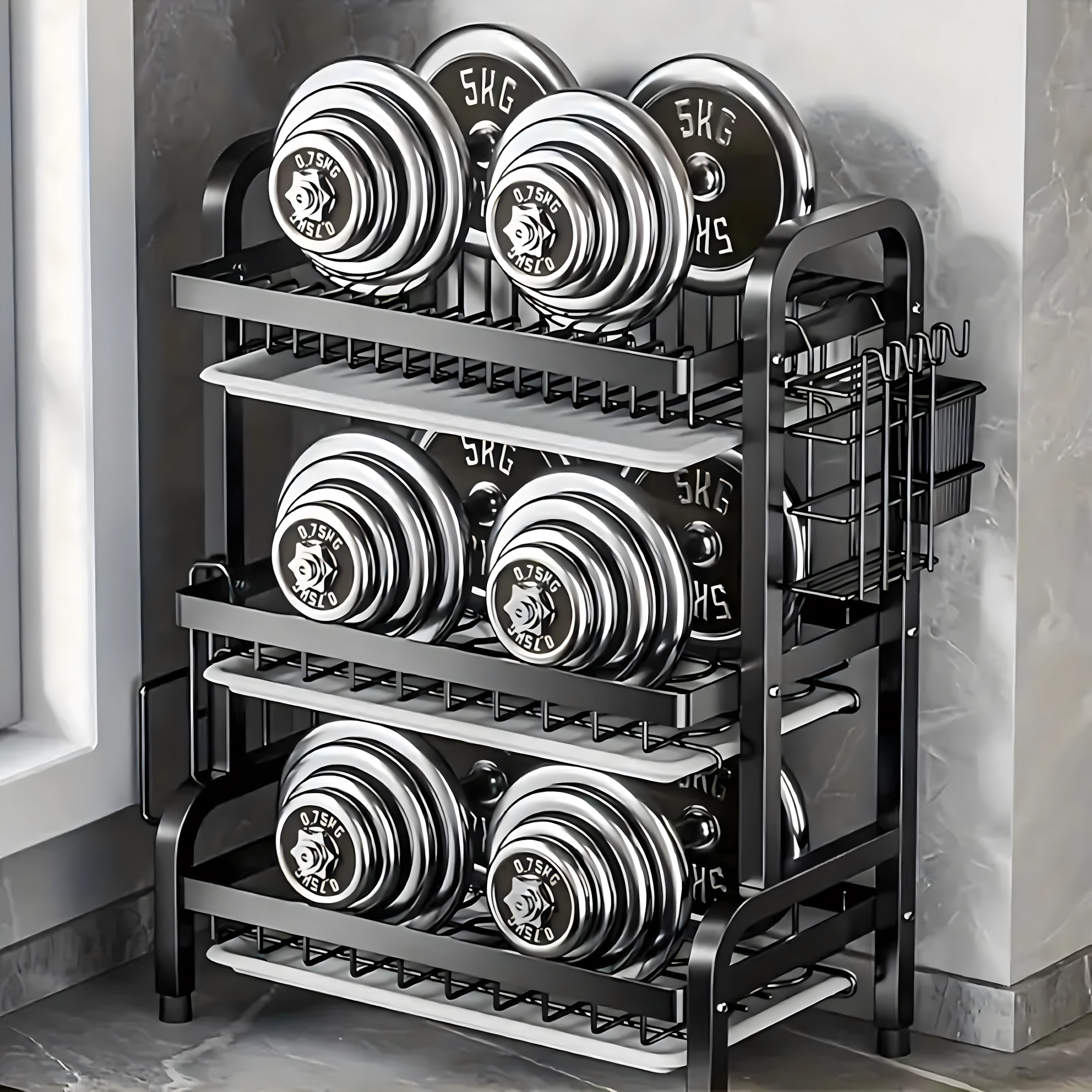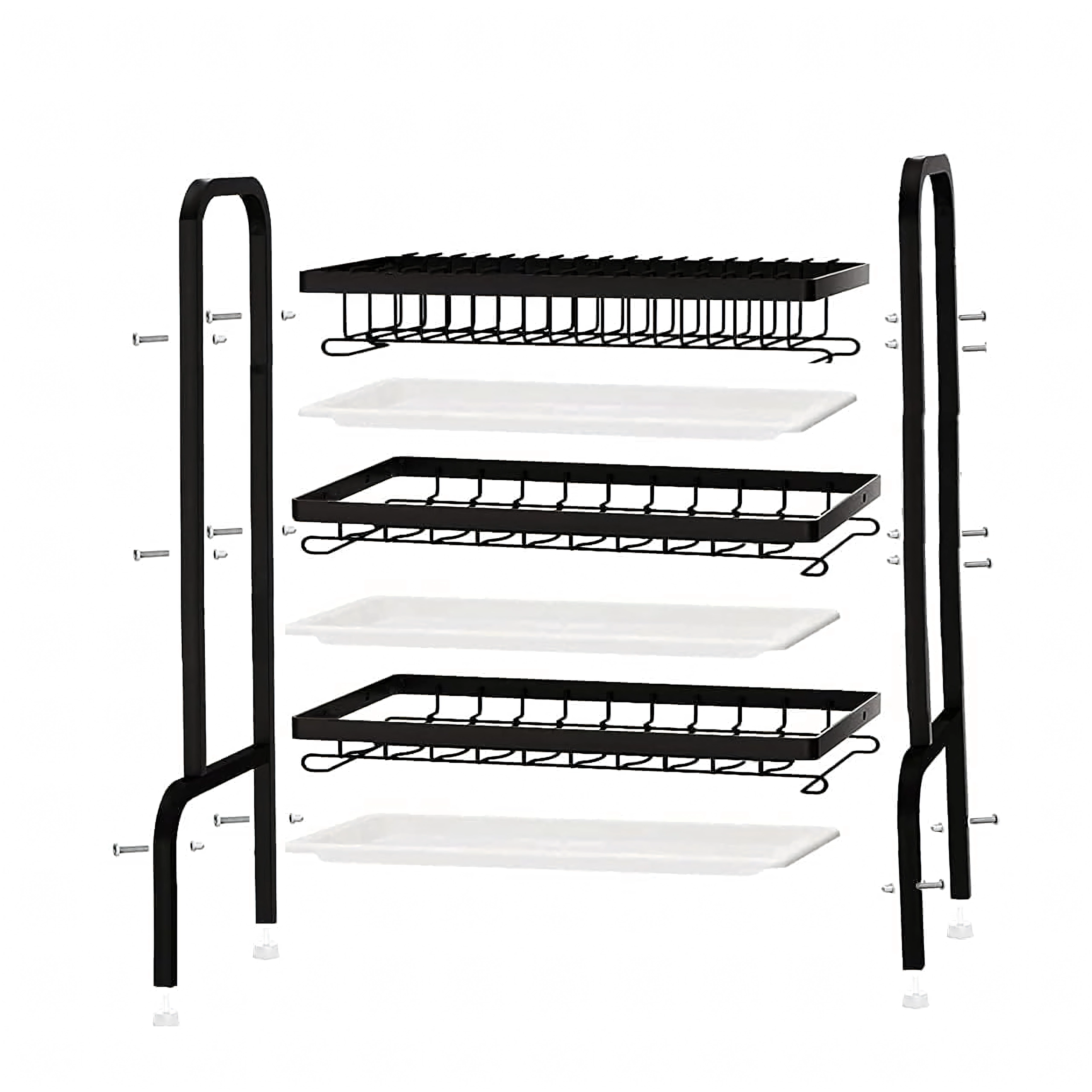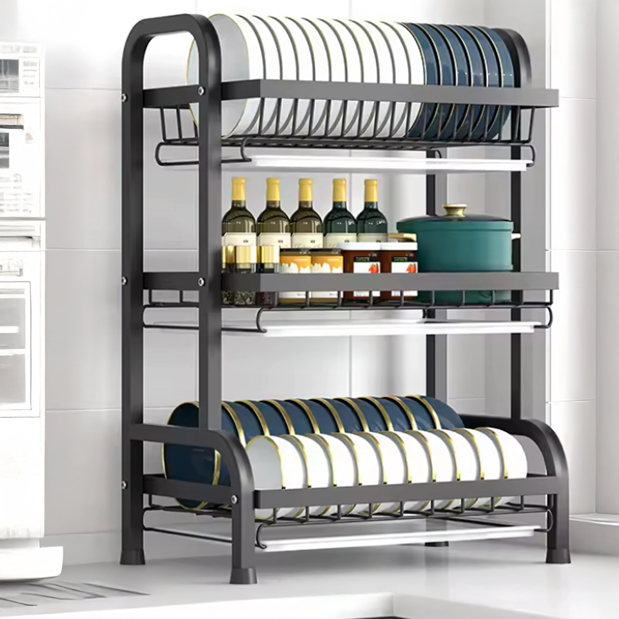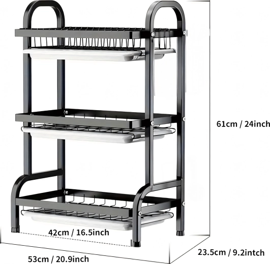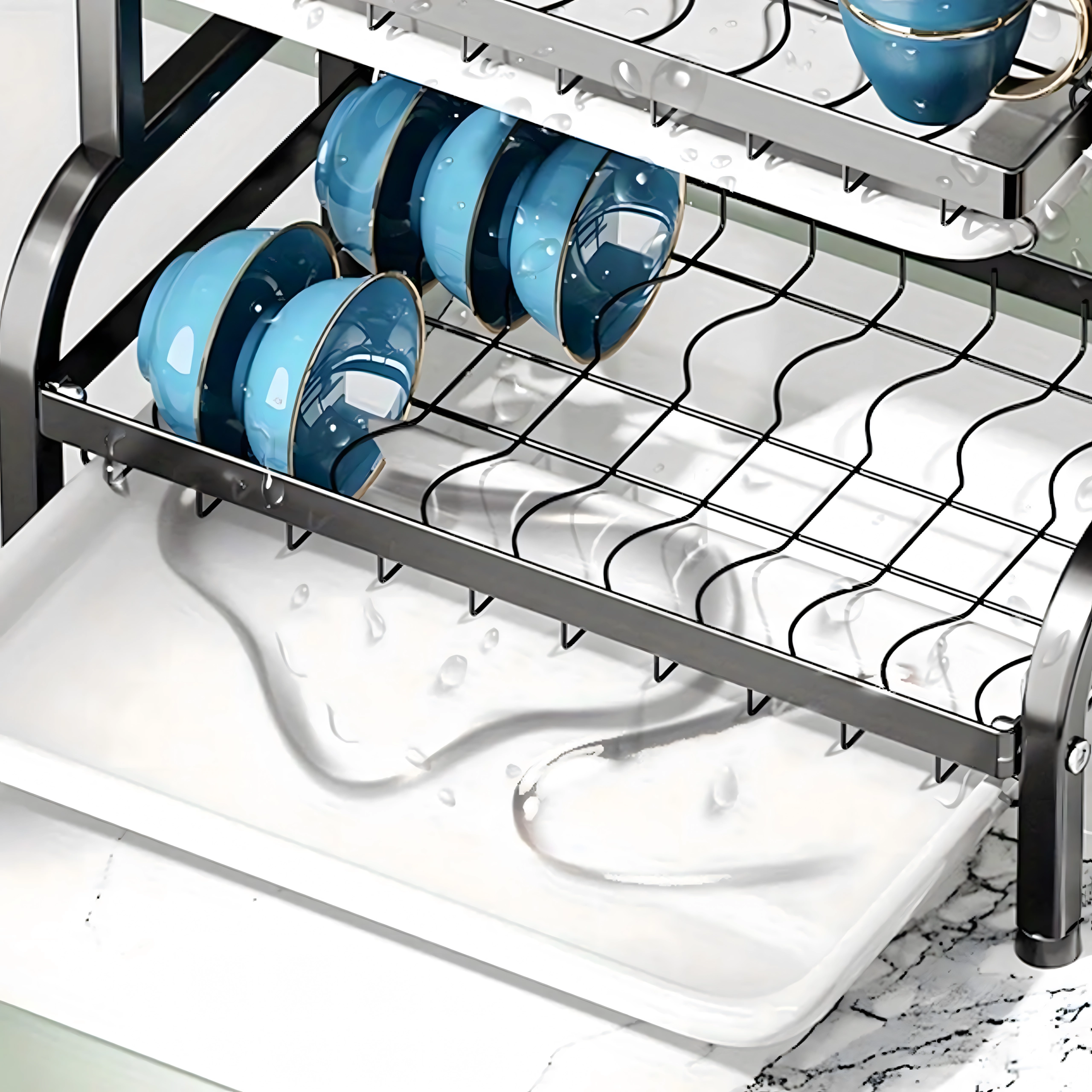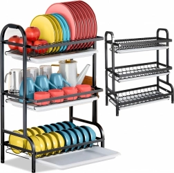 Slojevito rasporedjene police nude izdvojeno mjesto za tanjure, zdjele, čaše i šalice, dok otvorena žičana konstrukcija omogućuje brzu cirkulaciju zraka i učinkovito sušenje. Sklopivo rješenje štedi prostor kad nije u upotrebi.