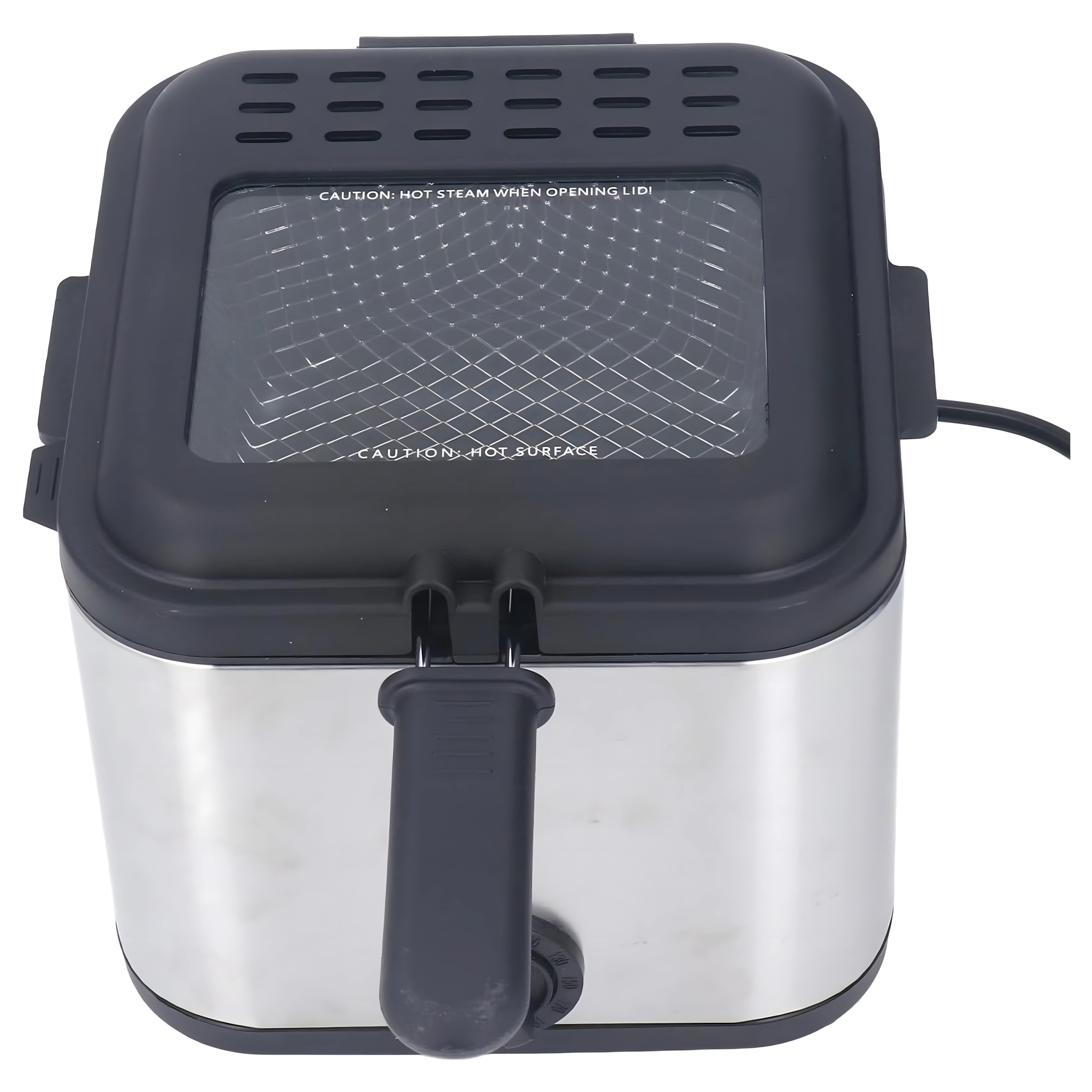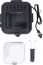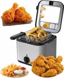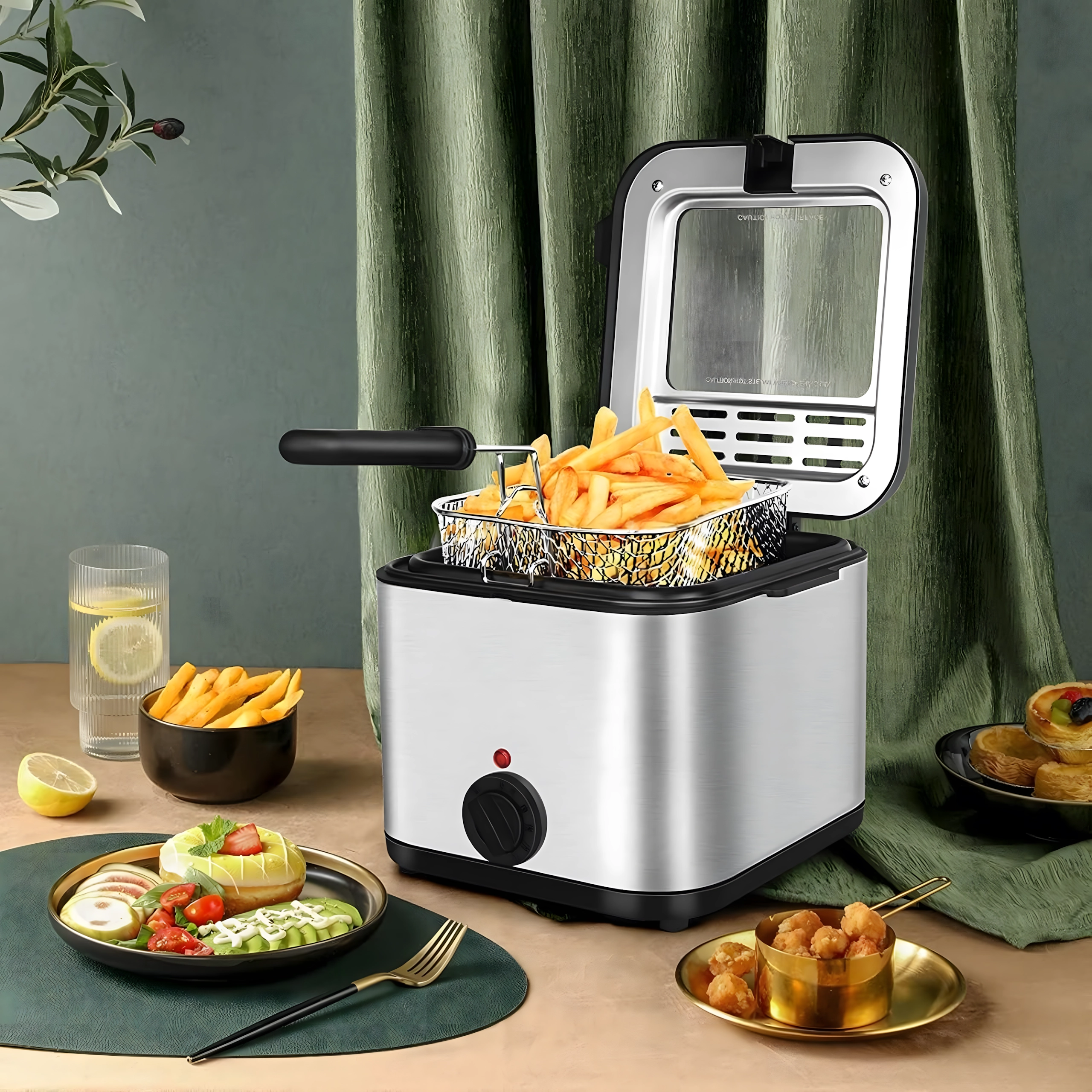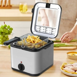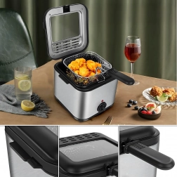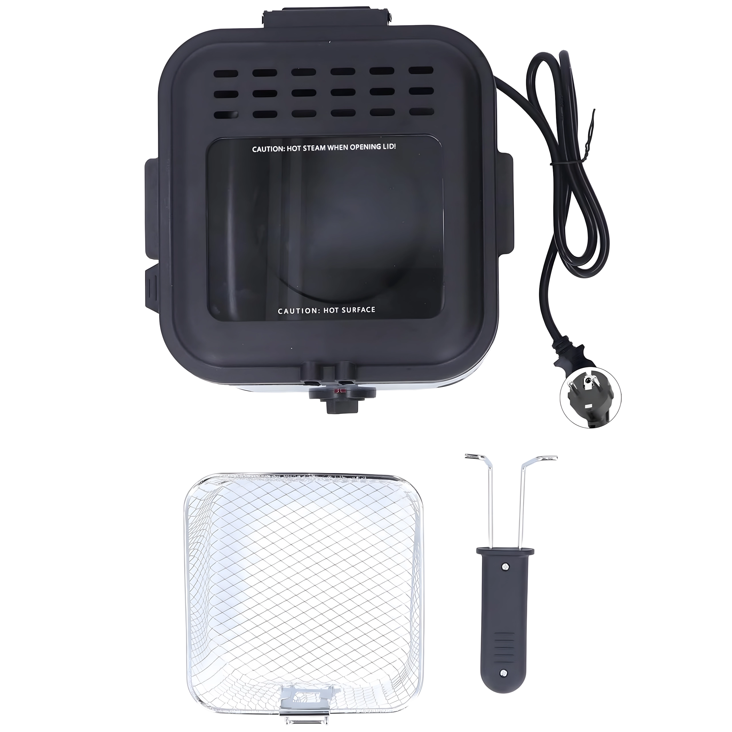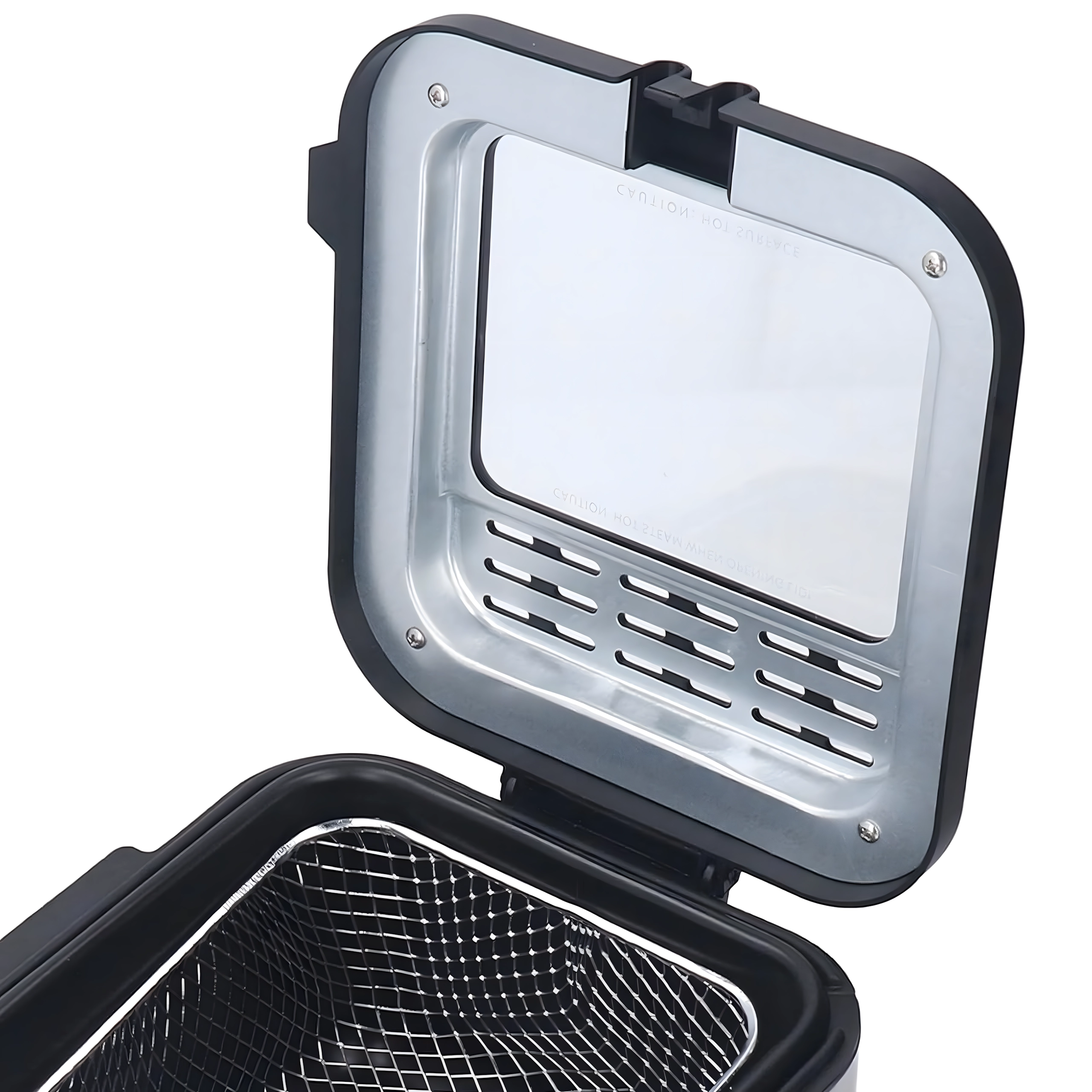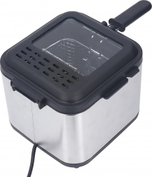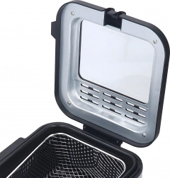 Praktični prozorčić u poklopcu omogućuje praćenje procesa bez nepotrebnog otvaranja, što pomaže održati stabilnu temperaturu ulja. Snaga 1000 W osigurava učinkovito zagrijavanje i ujednačene rezultate. Izvadiva košara s ručkom olakšava rukovanje i sigurno cijeđenje ulja.