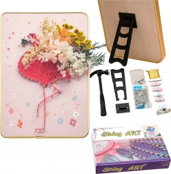 Drvena ploča s predloškom, čavlići, niti, sitni dodaci i alat – ukratko, sve što trebate za izradu dojmljive slike bez nabave dodatnih pomagala.