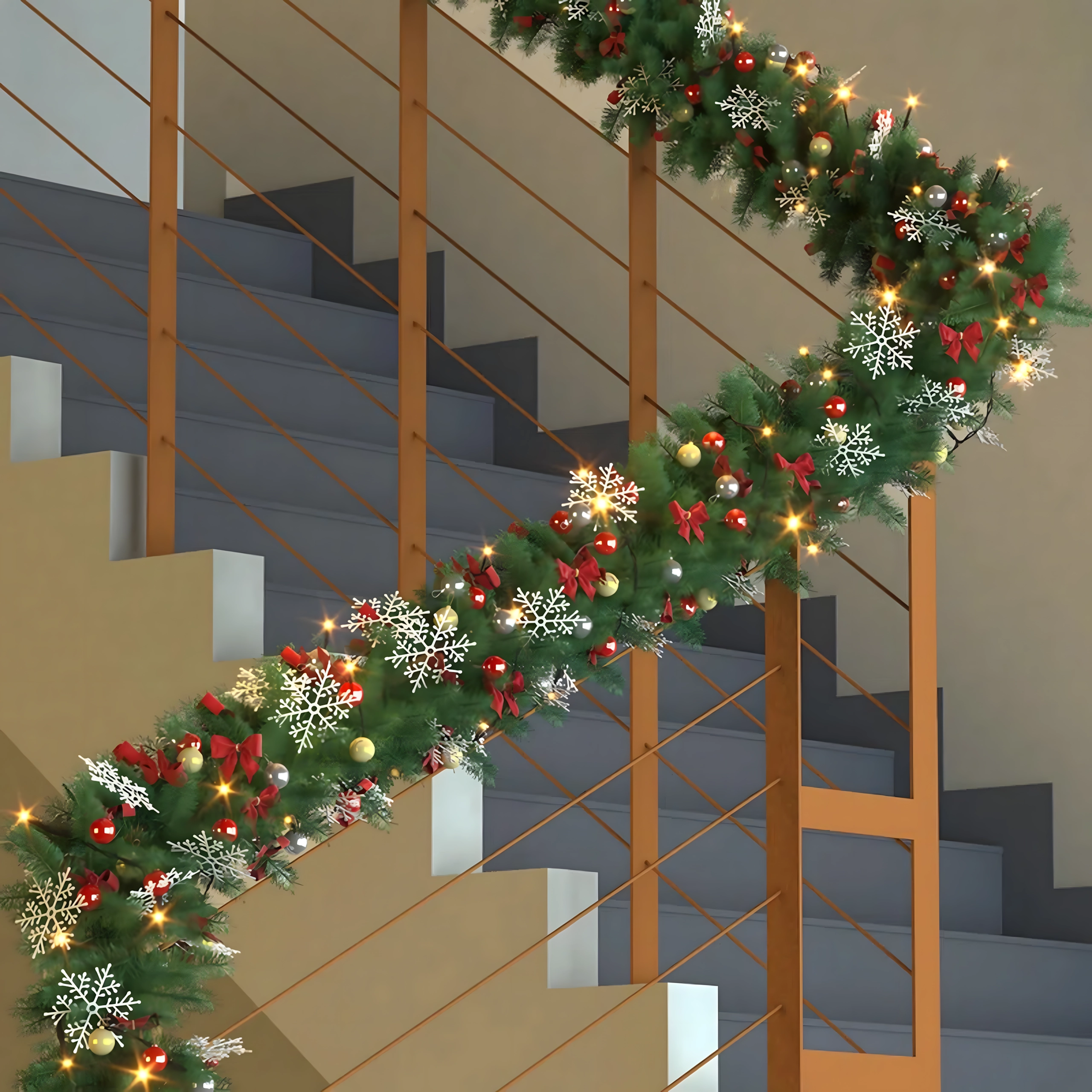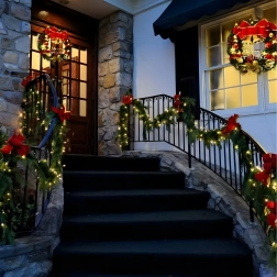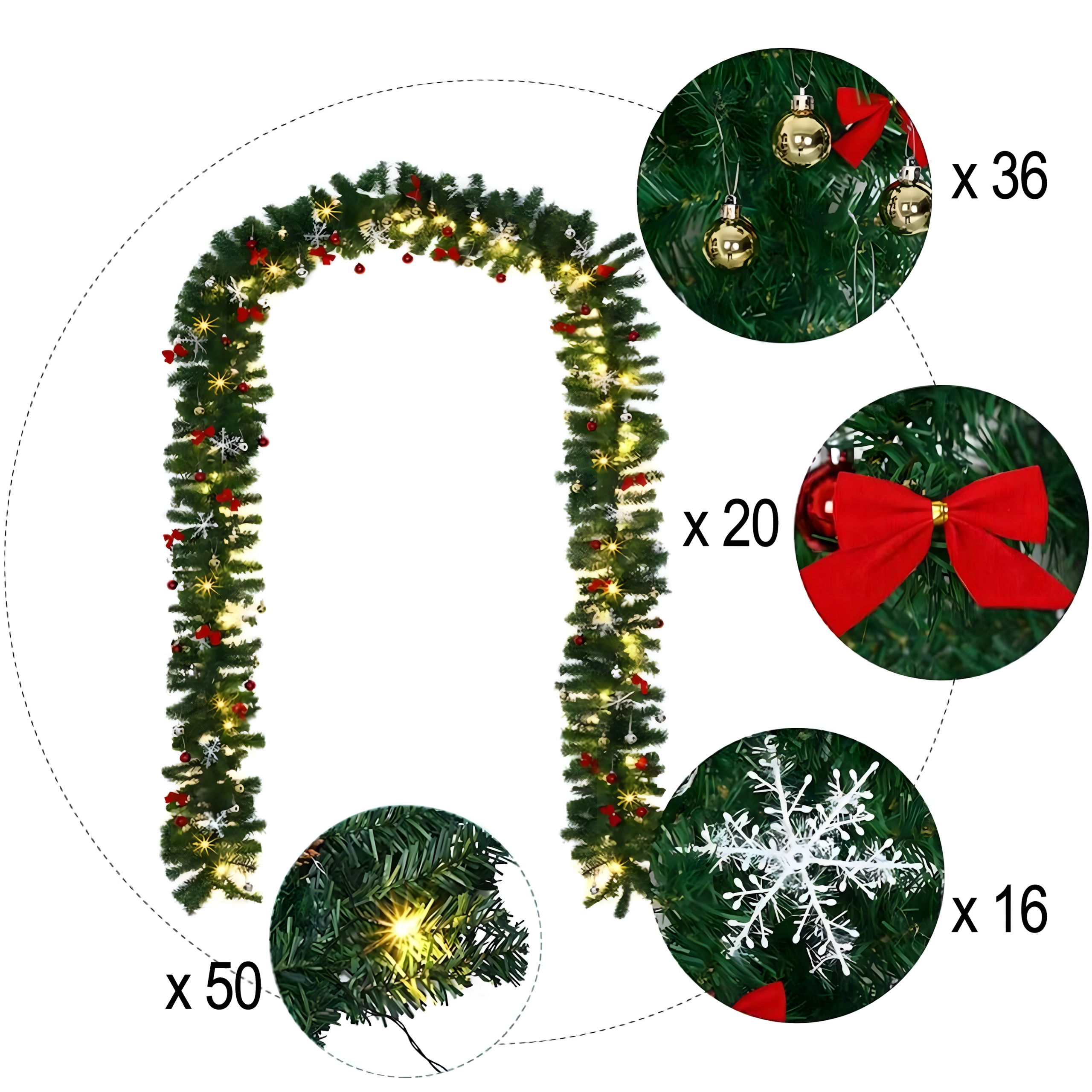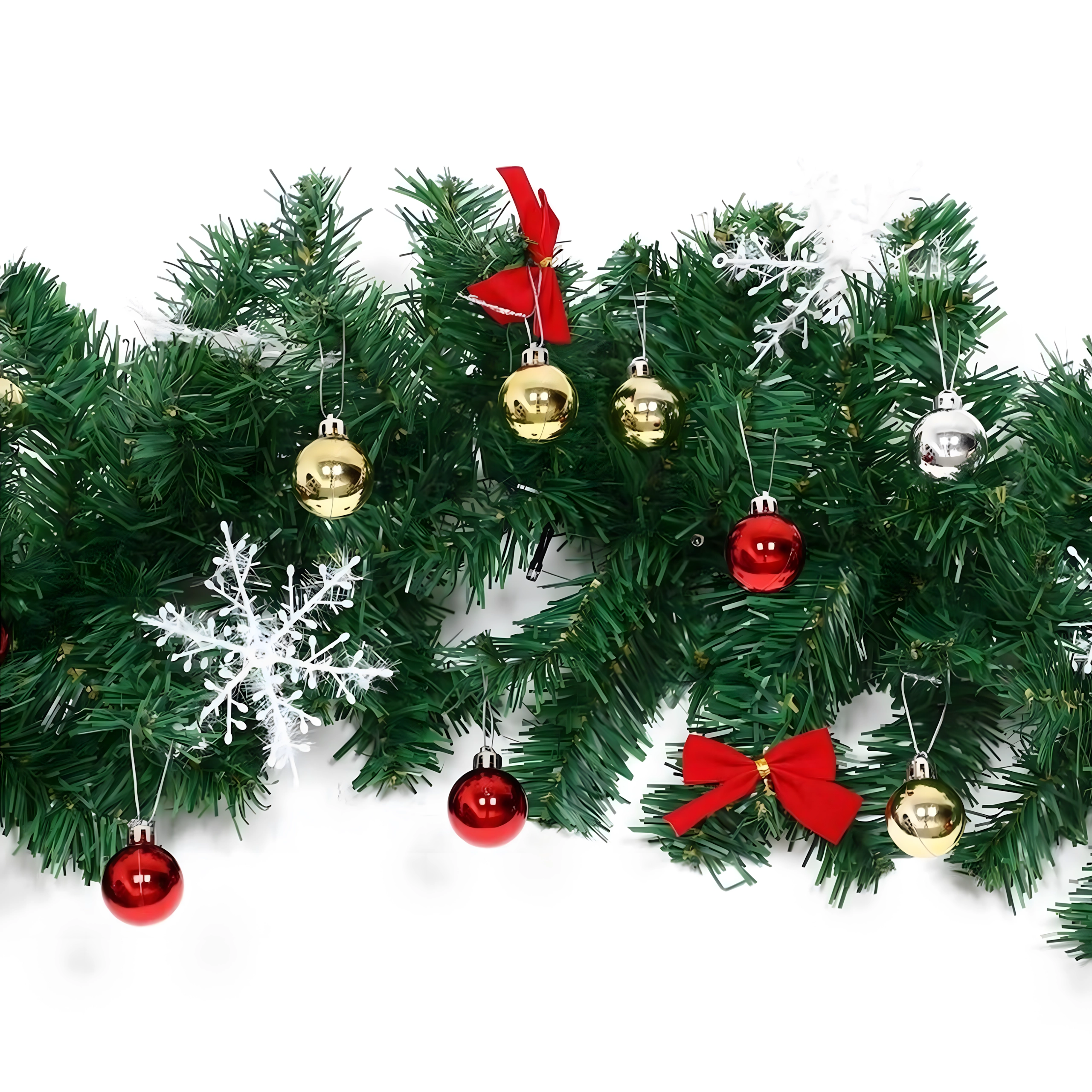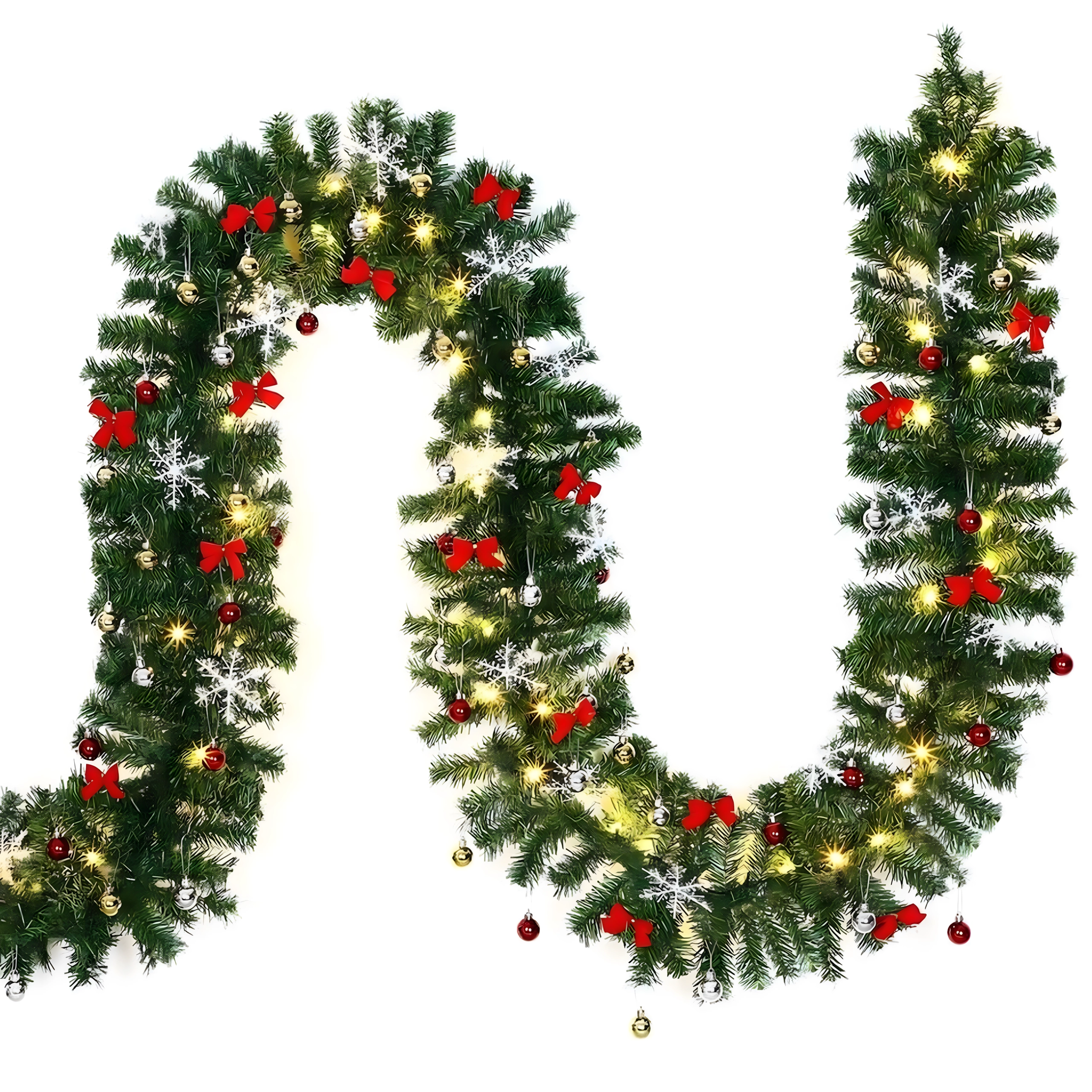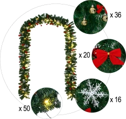 Ova elegantna božićna girlanda pretvorit će svaki ulaz, ogradu ili kaminsku policu u blagdanski naglasak. Integrirana topla LED svjetla daju ugodno, toplo osvjetljenje, a bezvremenski ukrasi u obliku kuglica, mašni i snježnih pahulja osiguravaju svečani izgled bez brige.