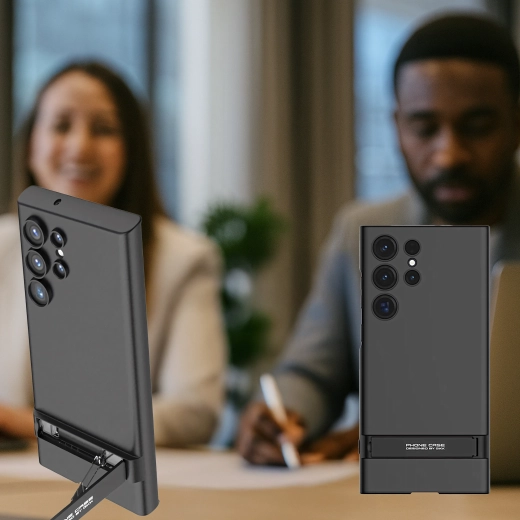 Stilska i izdržljiva futrola za Samsung Galaxy S24 Ultra u elegantnoj crnoj boji. Nudi tanki profil, pouzdanu zaštitu od ogrebotina i padova te praktično integrirano postolje za udobno gledanje videozapisa i video pozive.