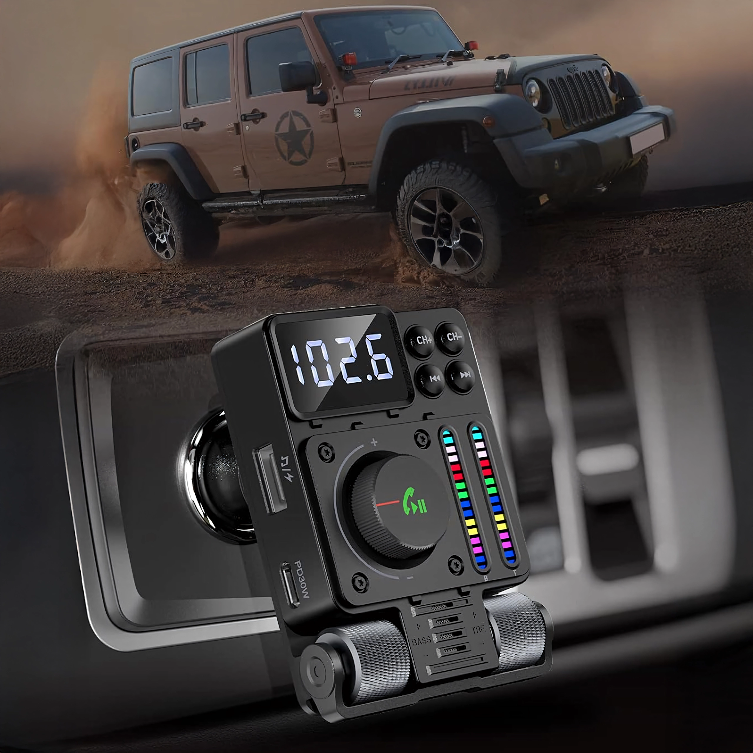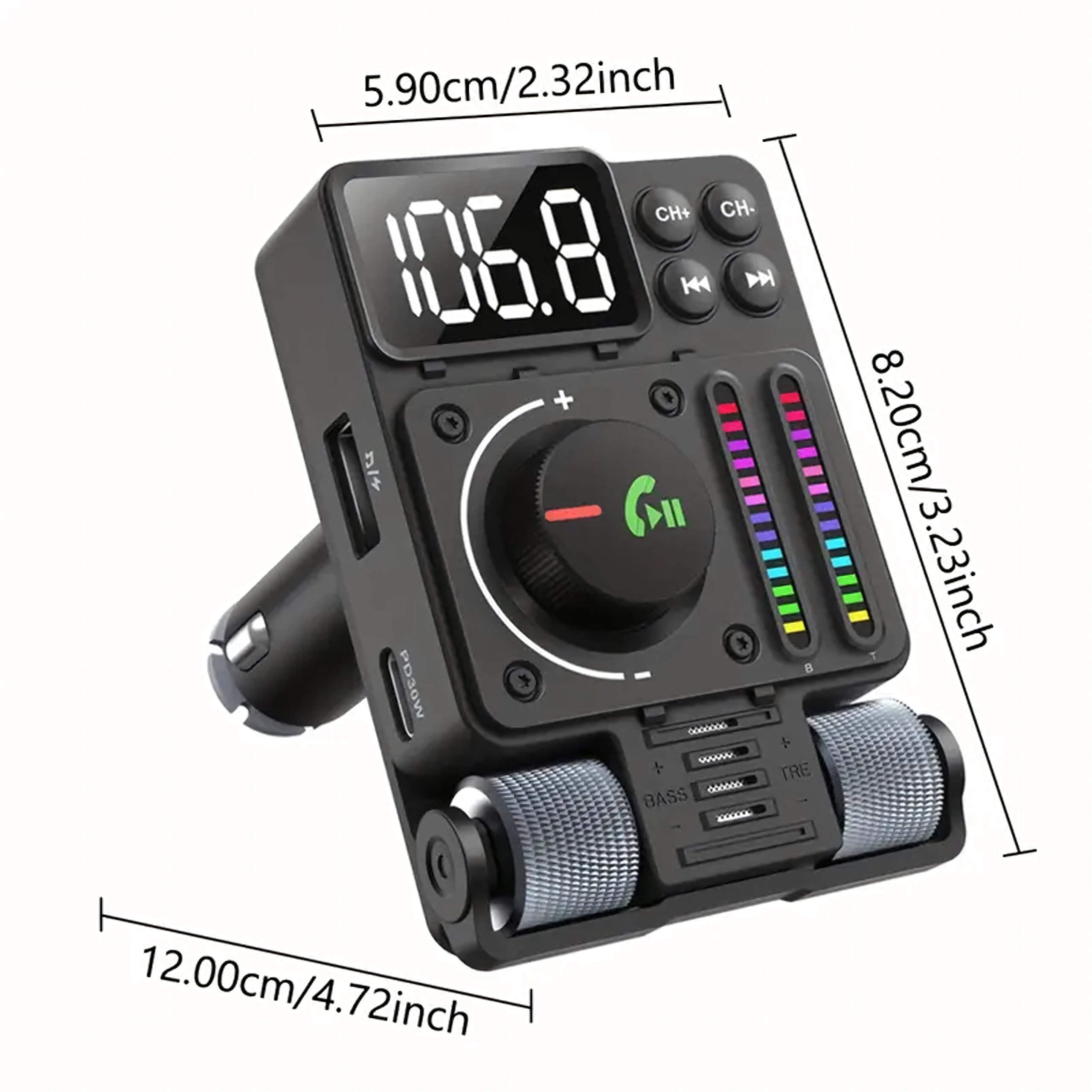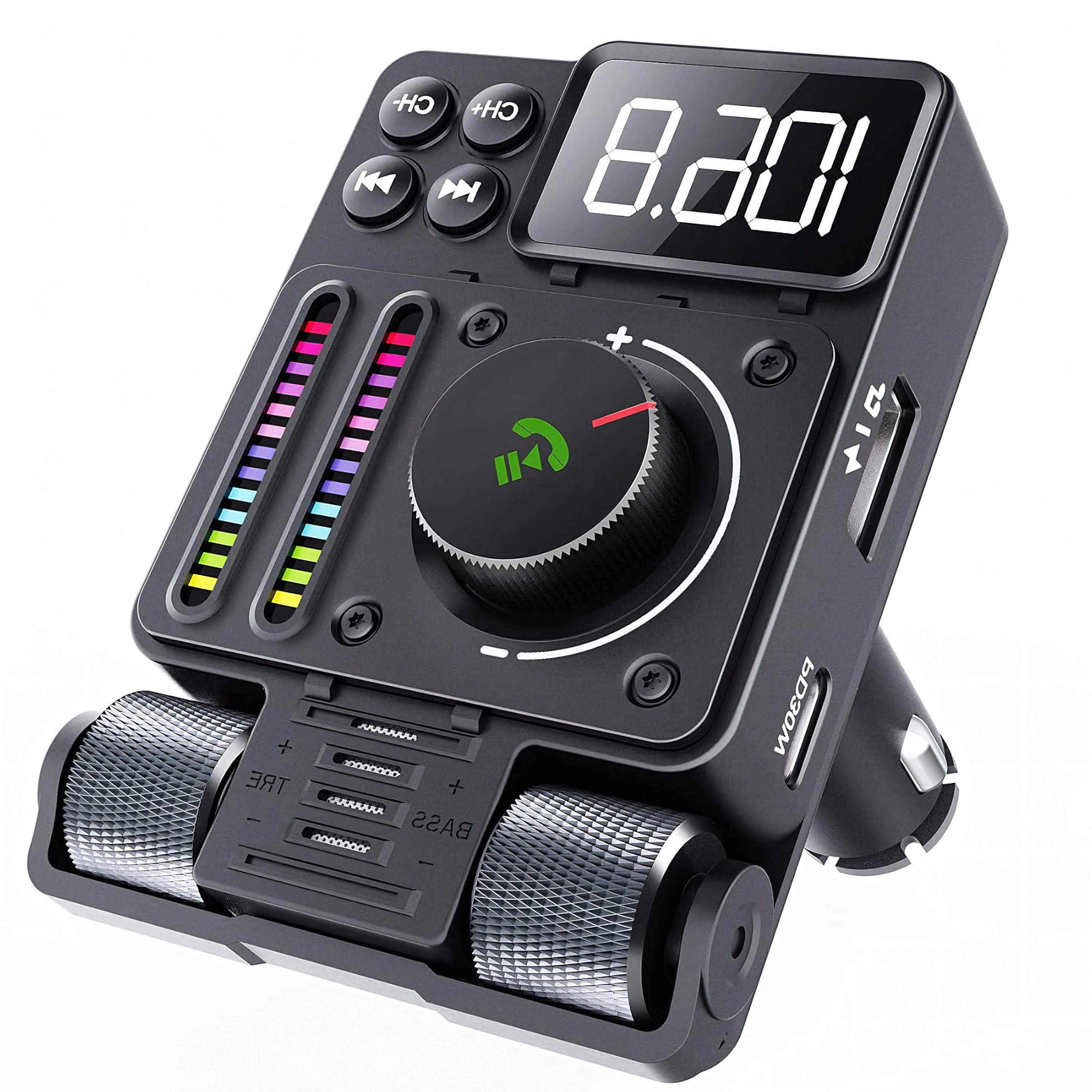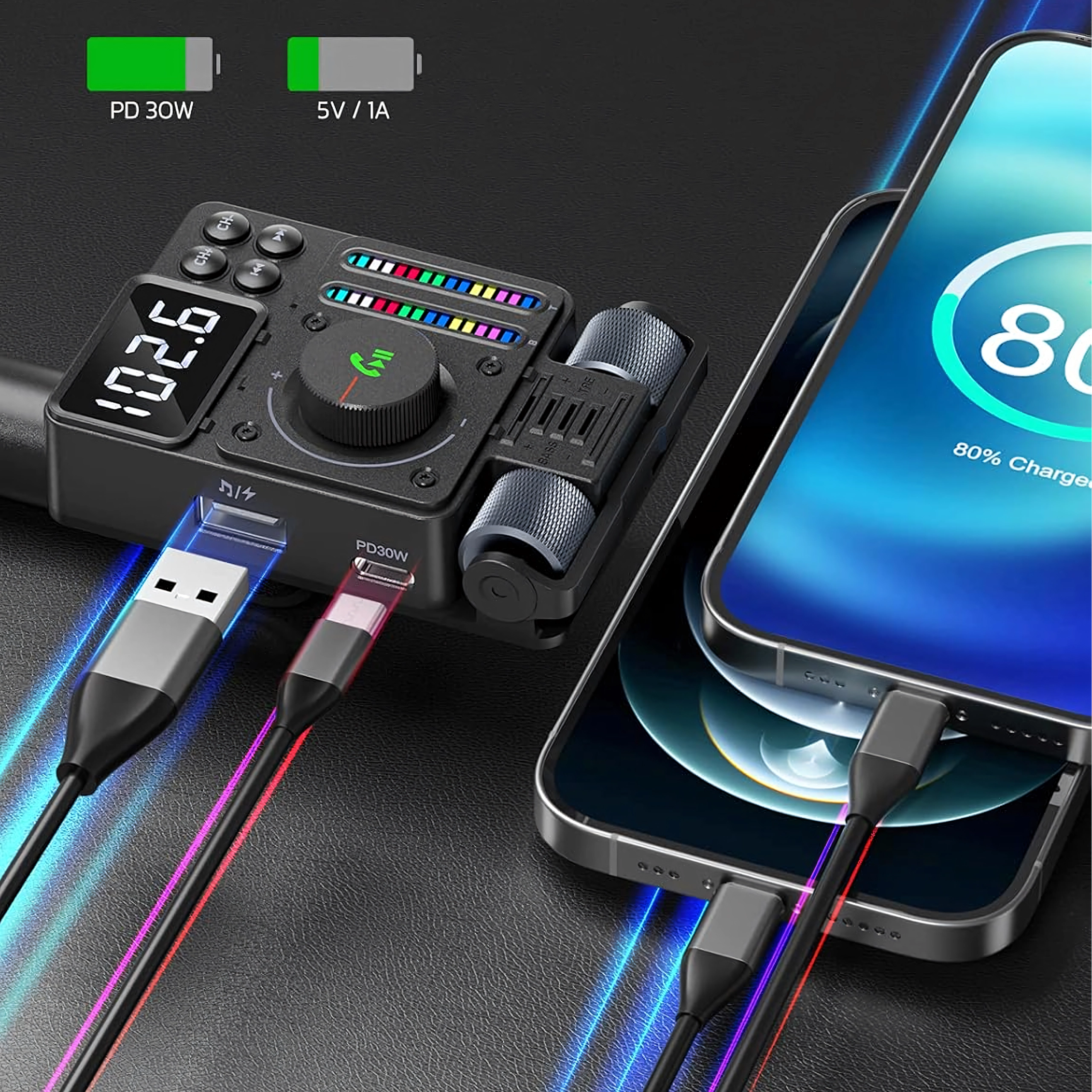 Multifunkcionalni Bluetooth 5.3 FM transmiter za auto s brzim punjenjem PD 30 W nudi streamanje glazbe, čiste handsfree pozive i šareno LED pozadinsko osvjetljenje. Idealan za udobnu i modernu upotrebu opreme u vašem vozilu.