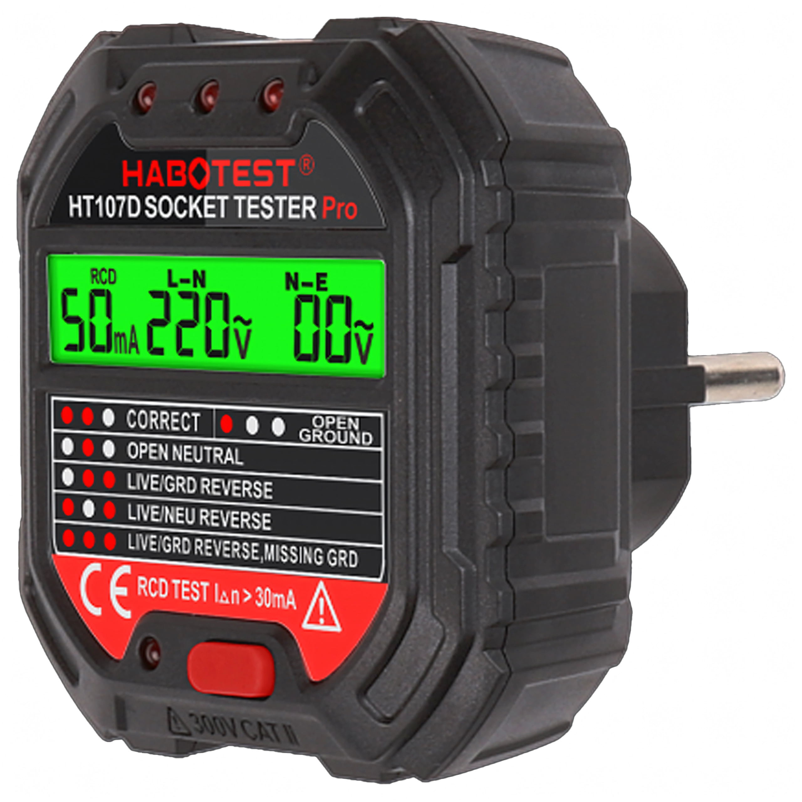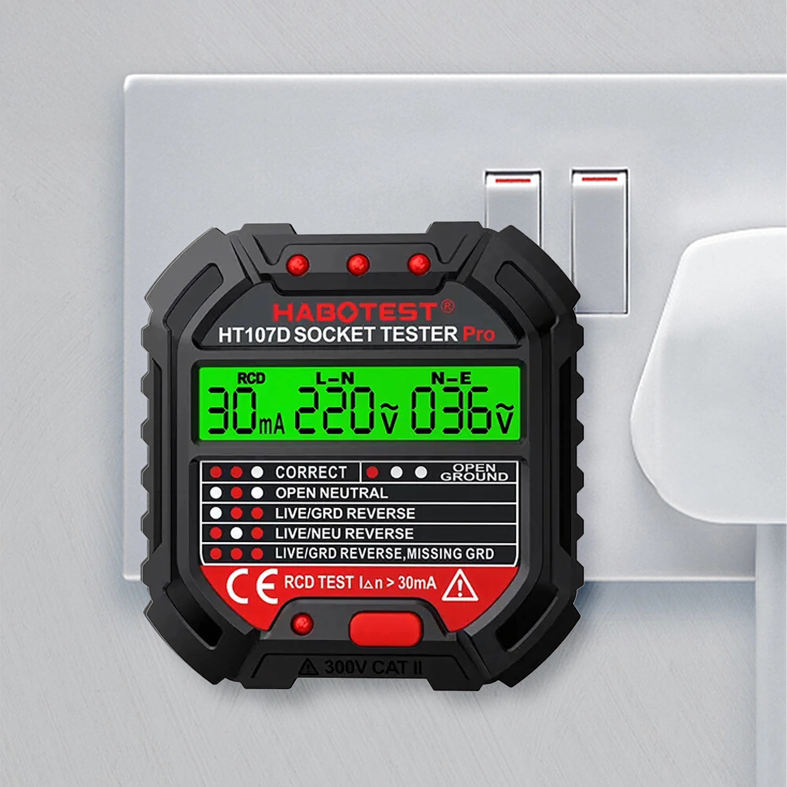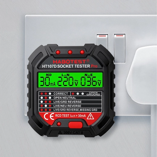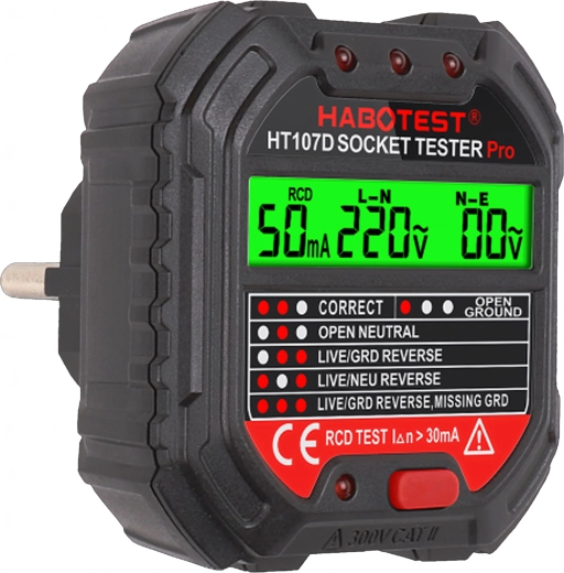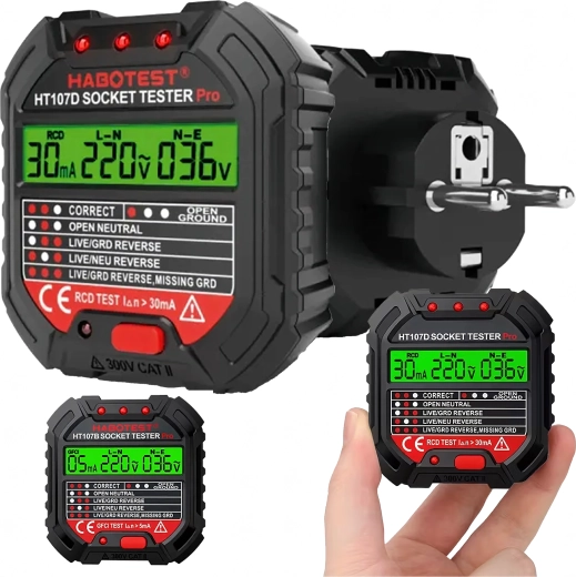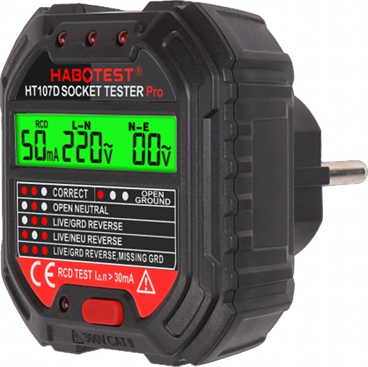 HABOTEST HT107D je praktičan alat za brzu provjeru mrežnih utičnica. Zahvaljujući jasnom LCD zaslonu pruža pregledne informacije o stanju ožičenja i naponu, pa odmah možete utvrditi je li utičnica sigurna za uporabu. Integrirani RCD test omogućuje provjeru funkcionalnosti zaštitne sklopke diferencijalne struje i povećava zaštitu od strujnog udara.