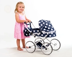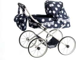Ova preslatka retro kolica za lutke izvrstan su izbor za djecu koja vole igru obitelji. Kombinacija crne boje s bijelim točkicama i ukrasnom čipkom djeluje stilski i bezvremenski, a pletena ratan košara daje kolicima čaroban izgled. Zahvaljujući podesivoj ručki (55 cm) kolica se lako prilagođavaju djetetovoj visini.