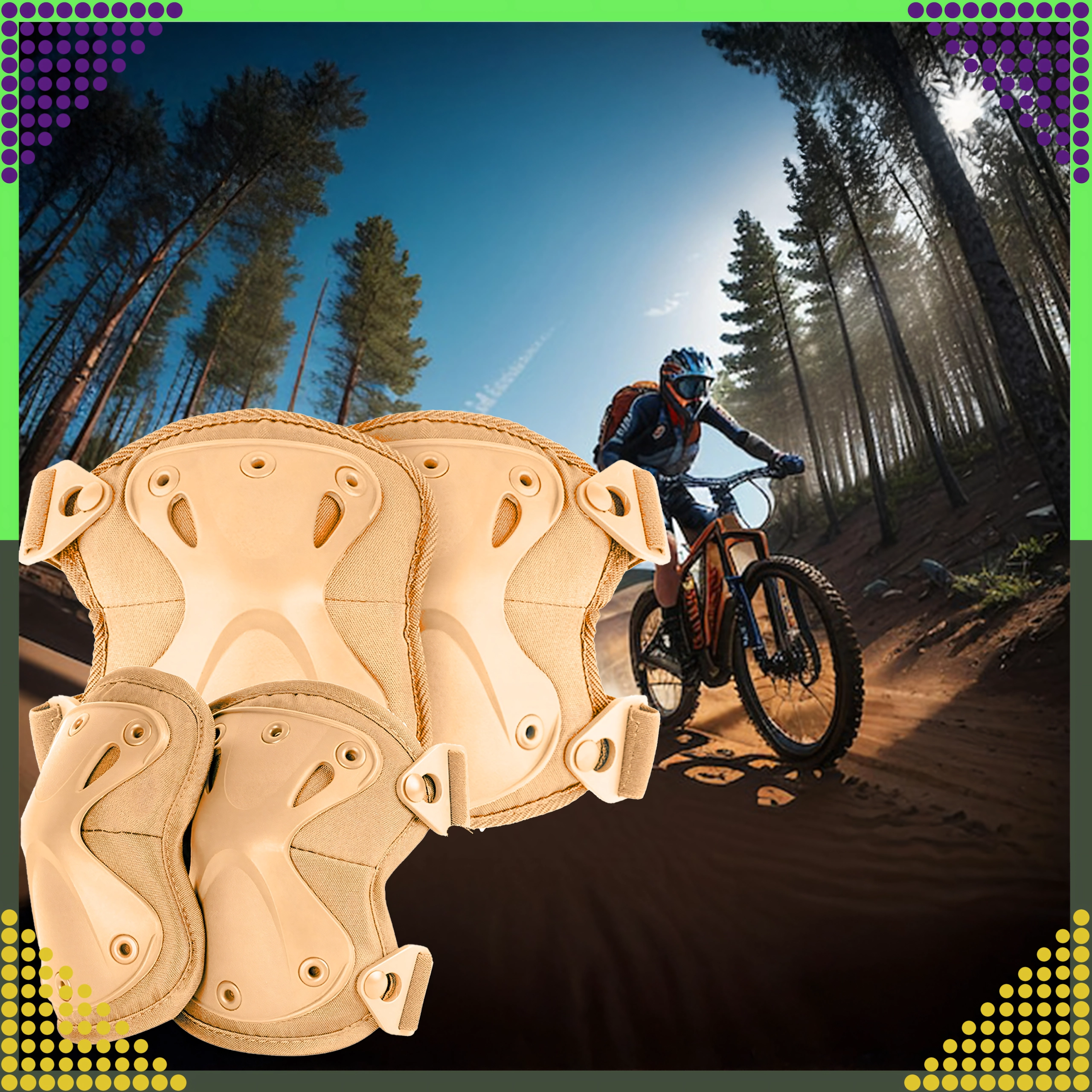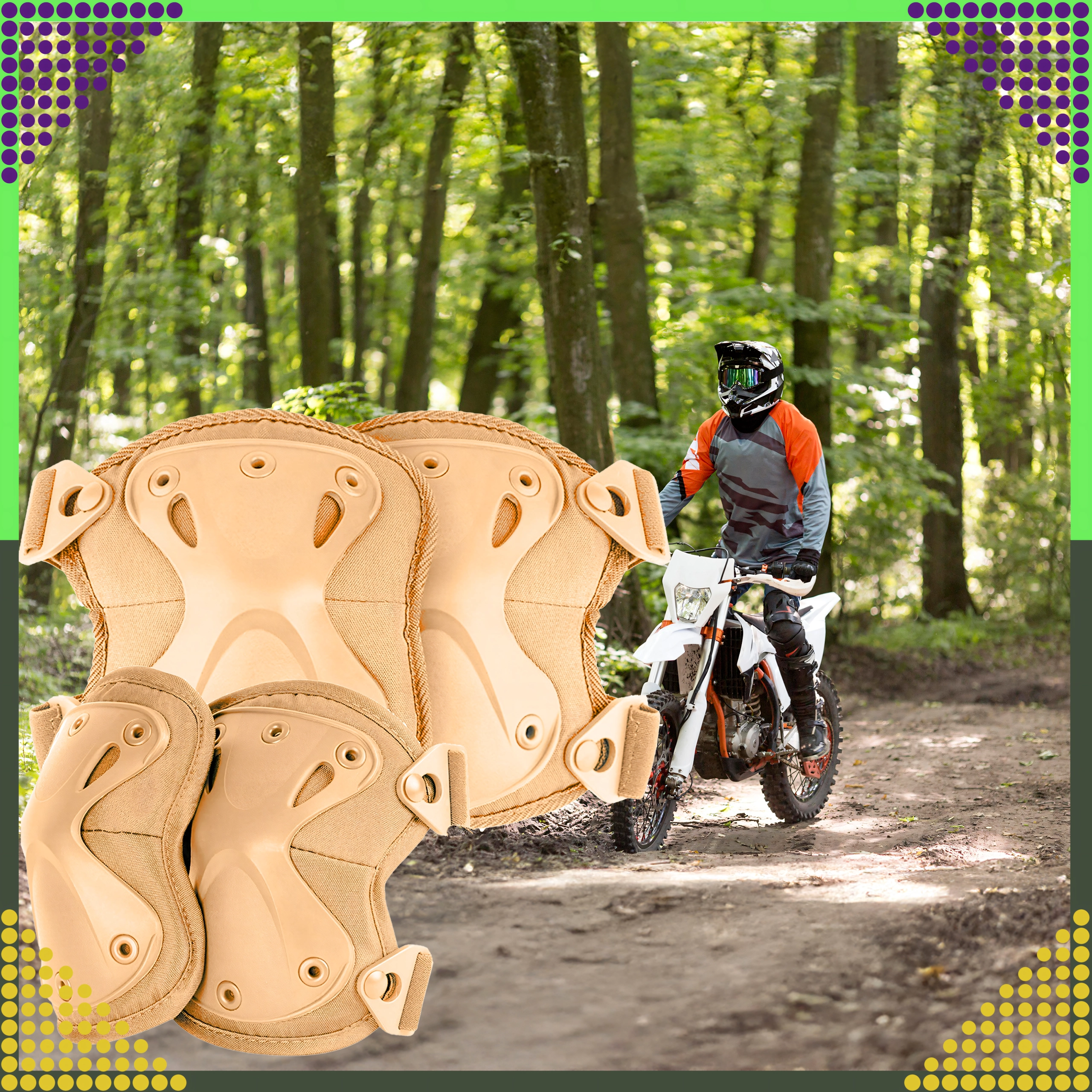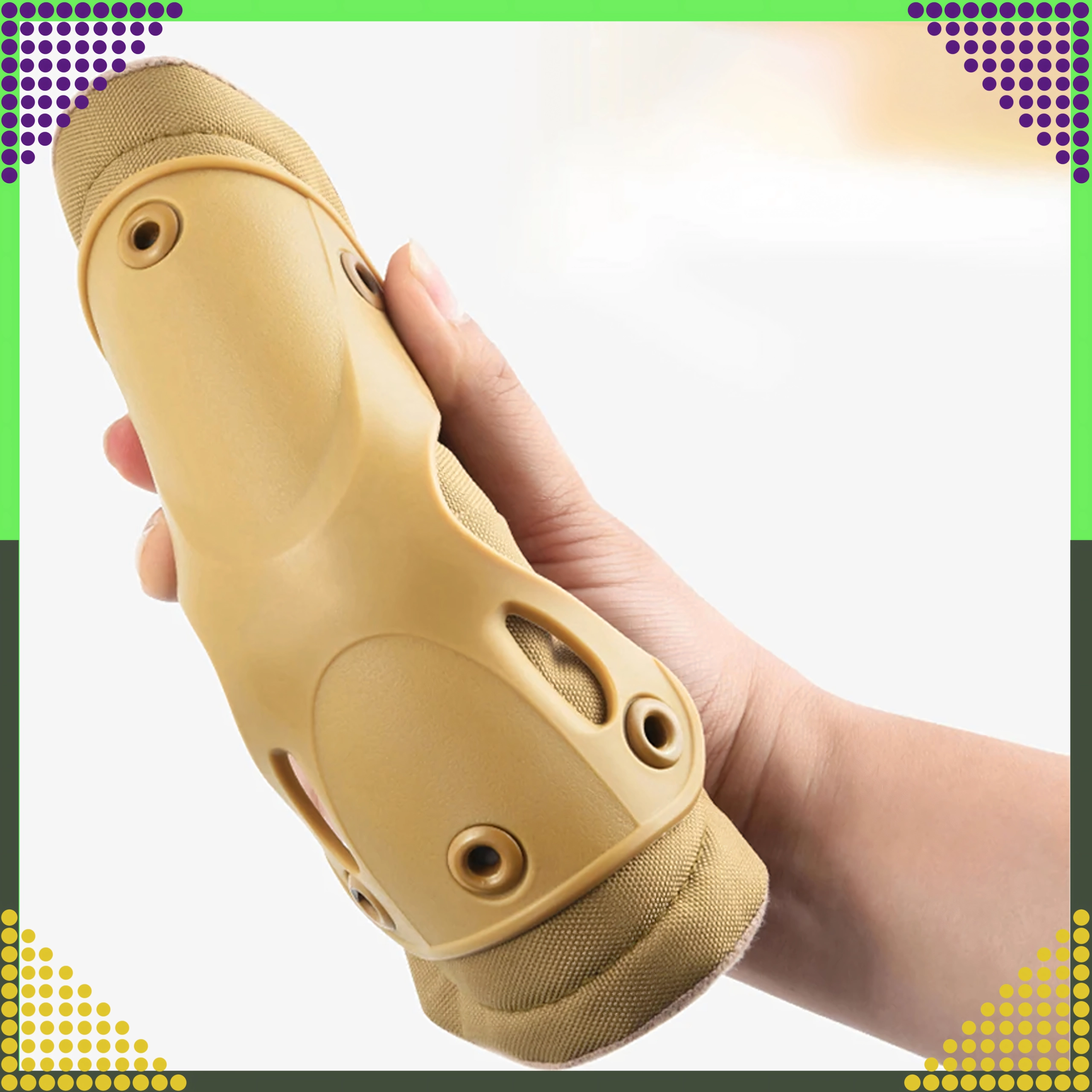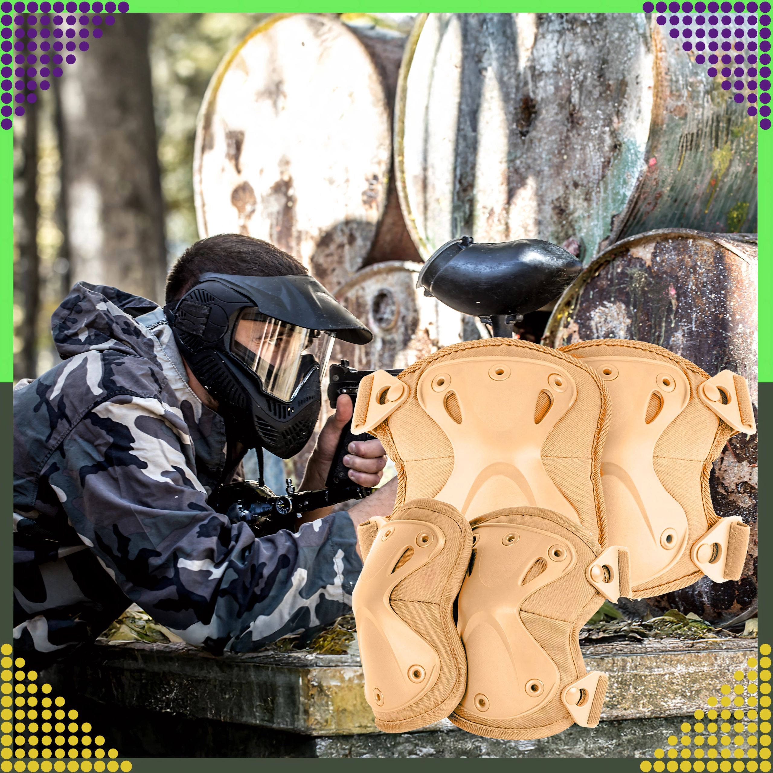 Set štiti ključne zglobove pri airsoftu, paintballu, vožnji motorom ili skatebordu. Izdržljiva tkanina i zakovano pričvršćenje povećavaju trajnost.