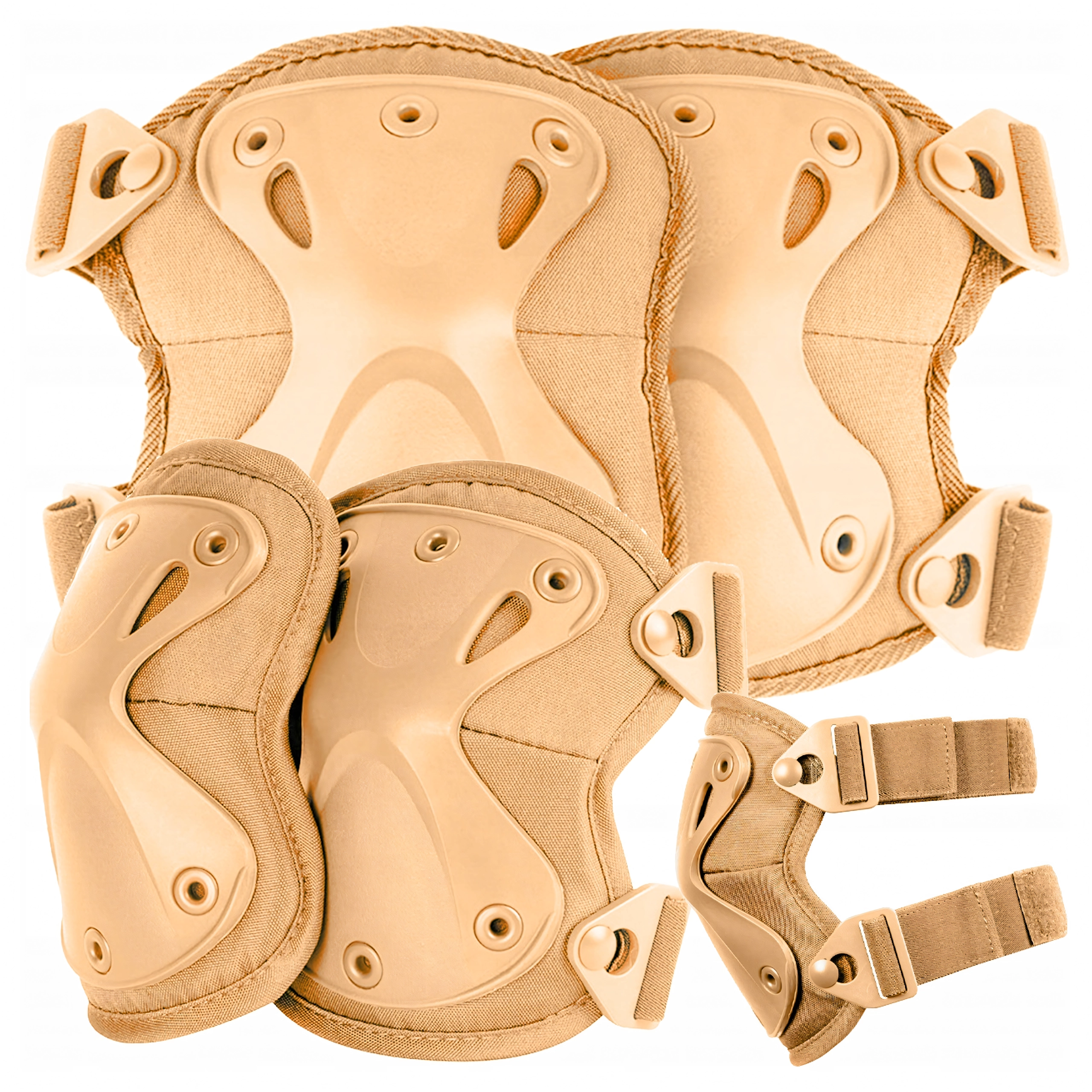Set taktičkih štitnika za koljena i laktove kombinira visoku izdržljivost, udobnost i brzu upotrebu. Tvrde školjke od izdržljive plastike su zakovicama pričvršćene na podstavu, pa čvrsto stoje i pri intenzivnom kretanju. Zahvaljujući konusnom obliku bolje raspodjeljuju udarce i smanjuju rizik od ozljeda pri klečanju ili padu.