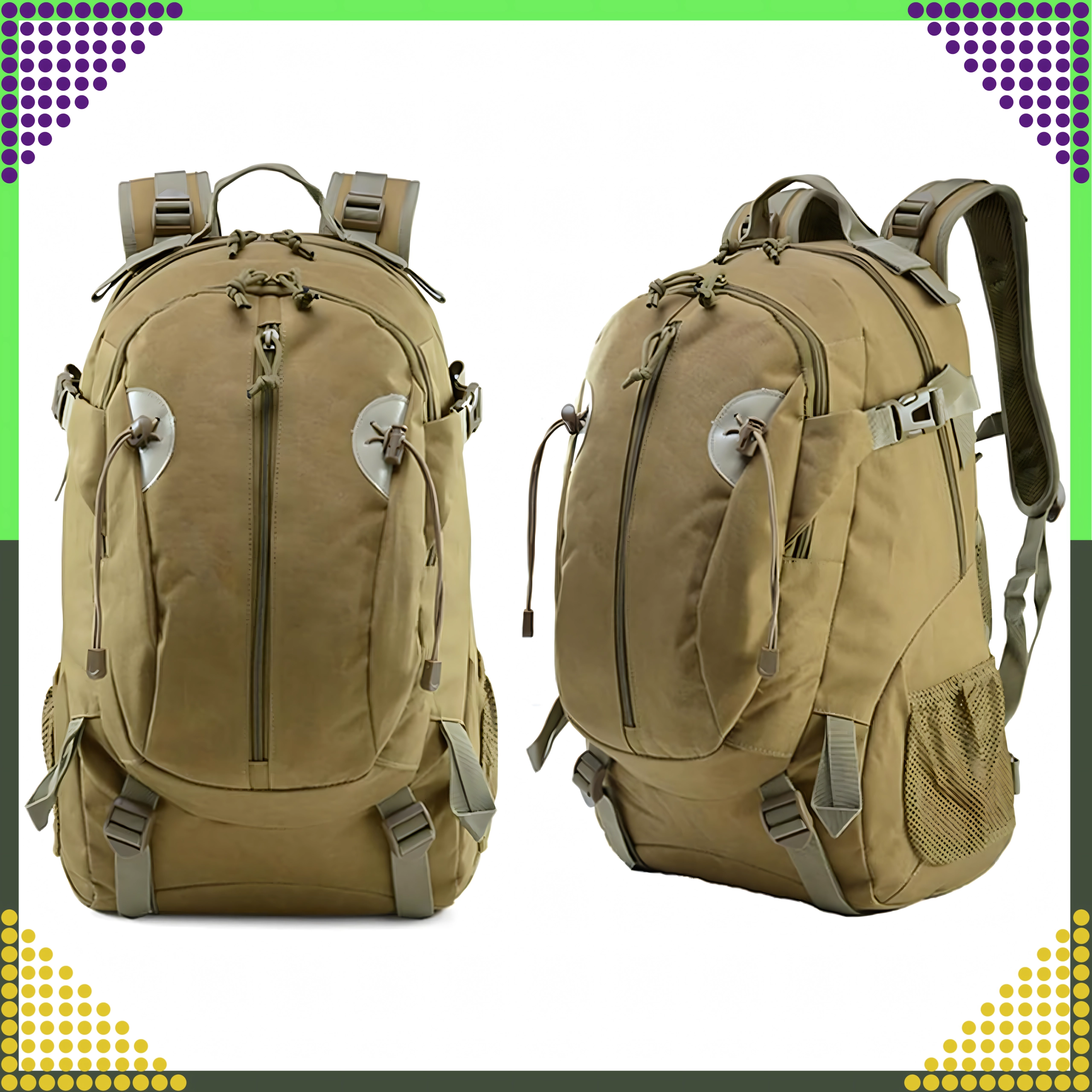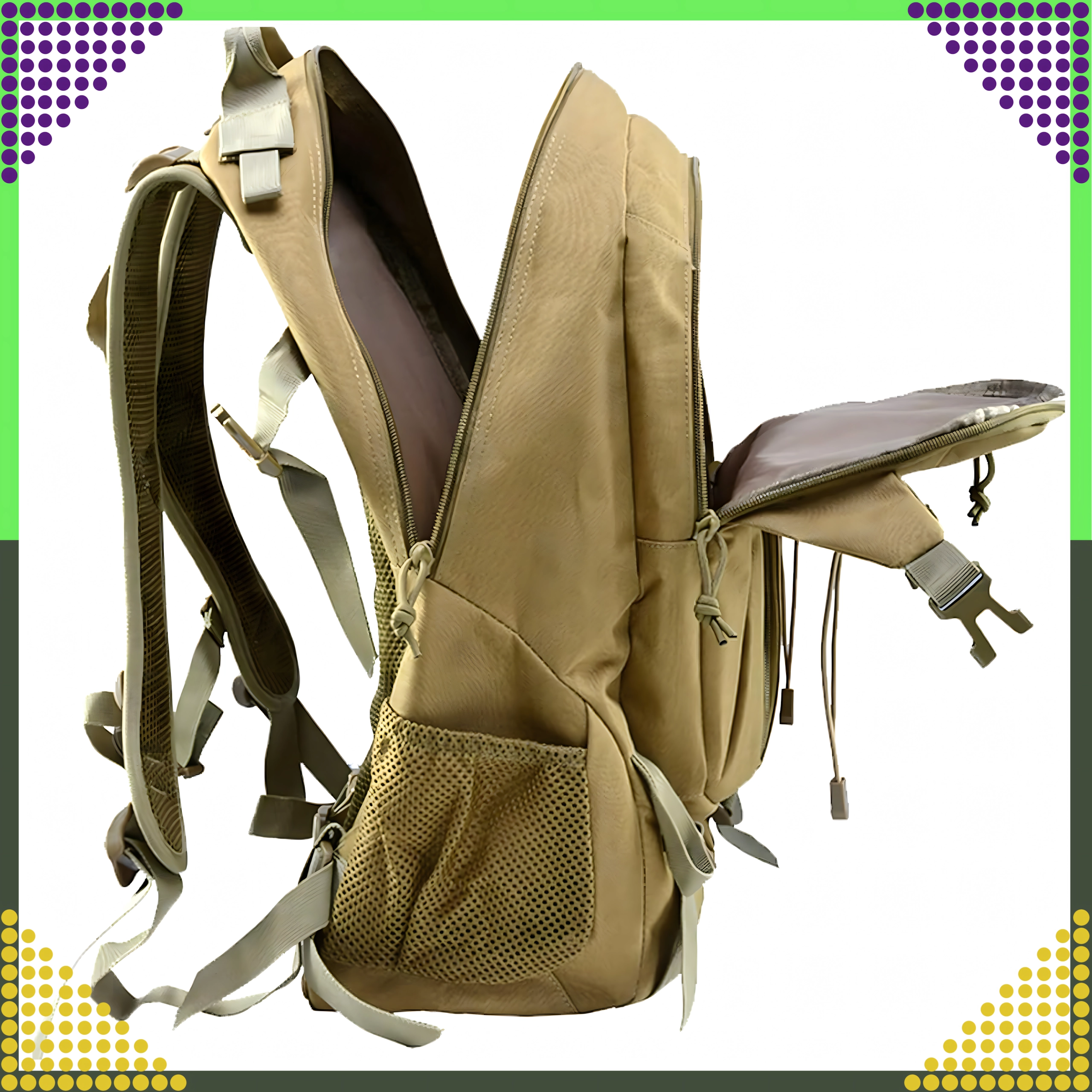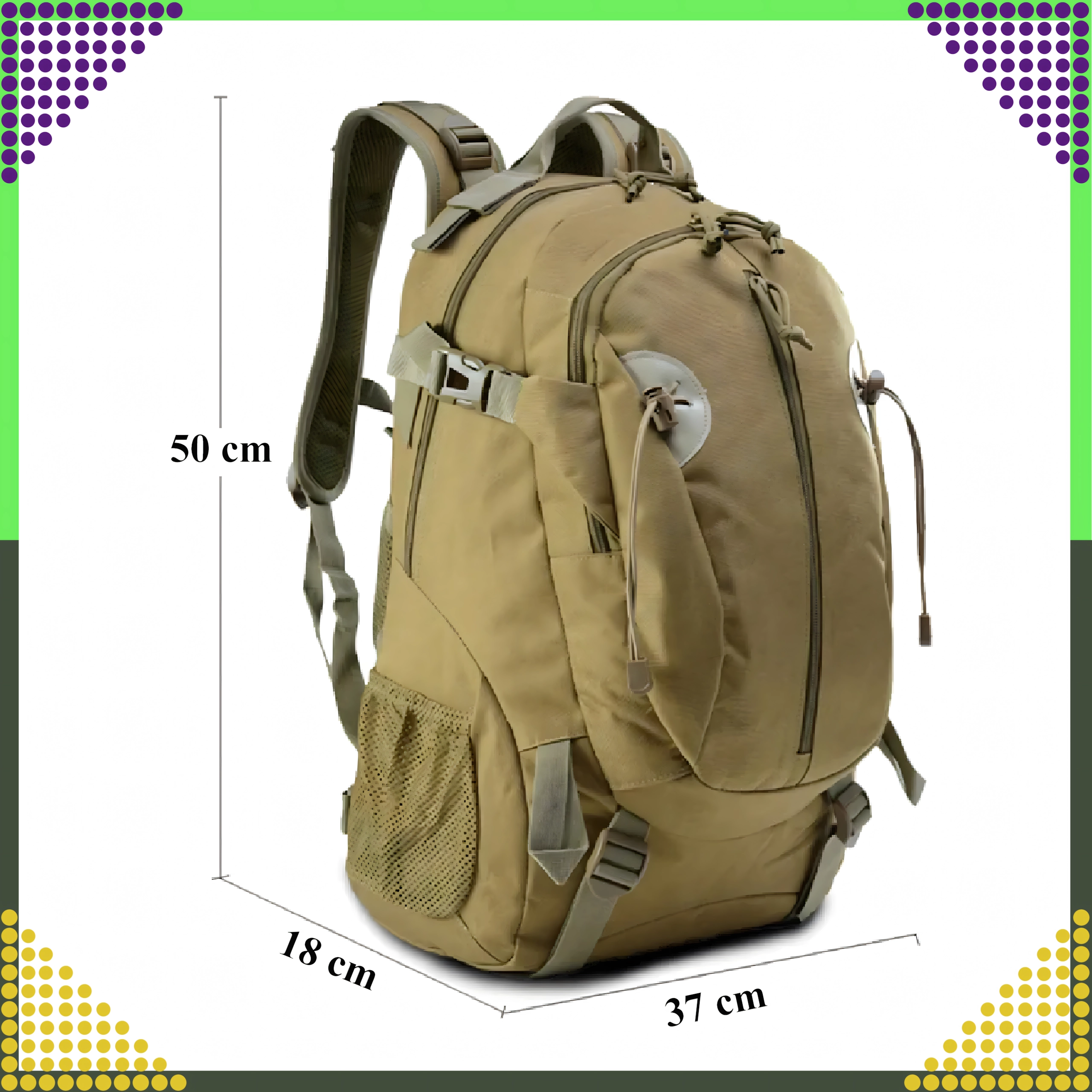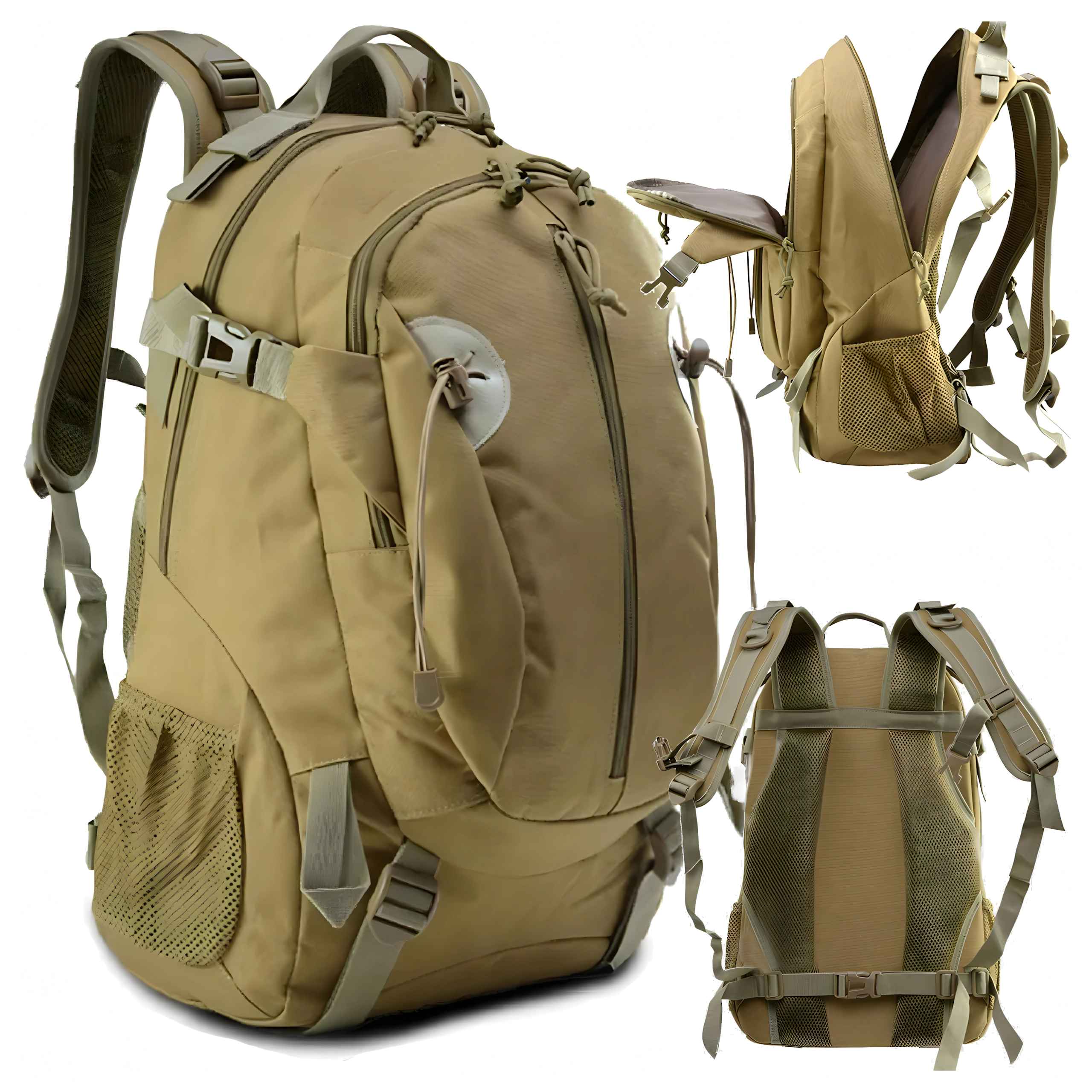 Ovaj taktički ruksak u univerzalnoj khaki boji dizajniran je za pouzdanu svakodnevnu upotrebu u prirodi i gradu. Izdržljiva tkanina 900D poliester s unutarnjom PVC laminacijom povećava vodoodbojnost i štiti sadržaj od vlage. Podstavljena leđa i naramenice s ventilacijskim sustavom osiguravaju udobnost i pri duljem nošenju.