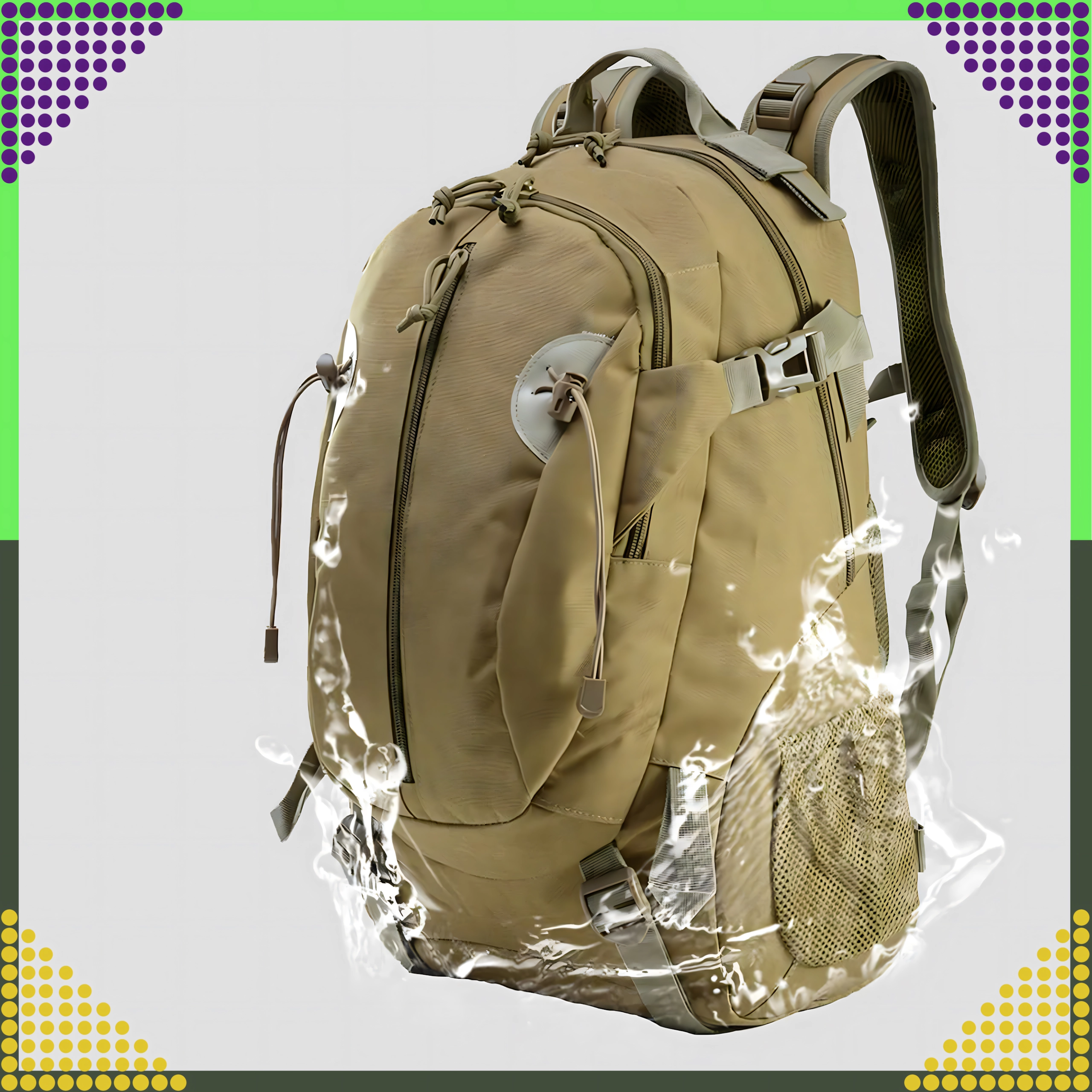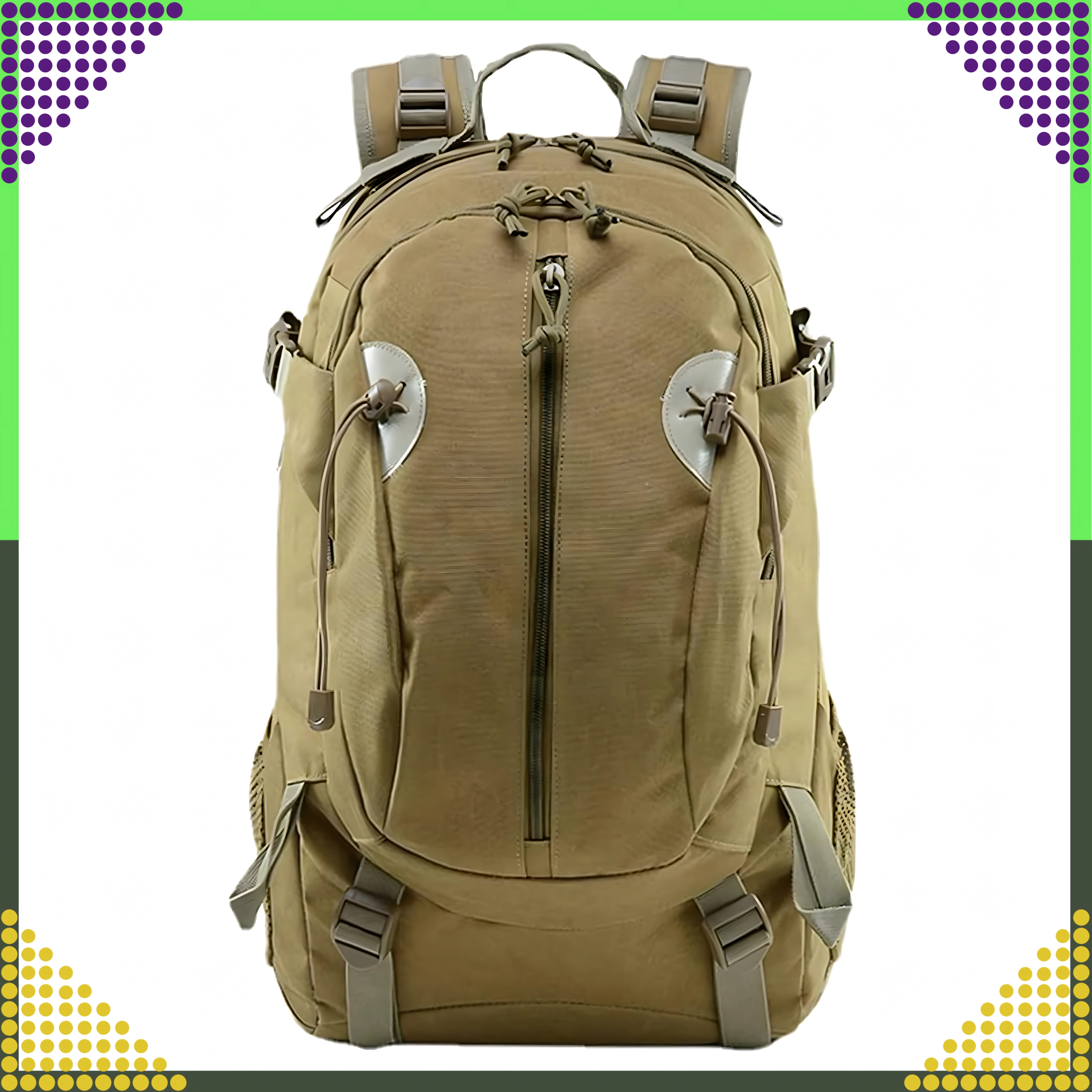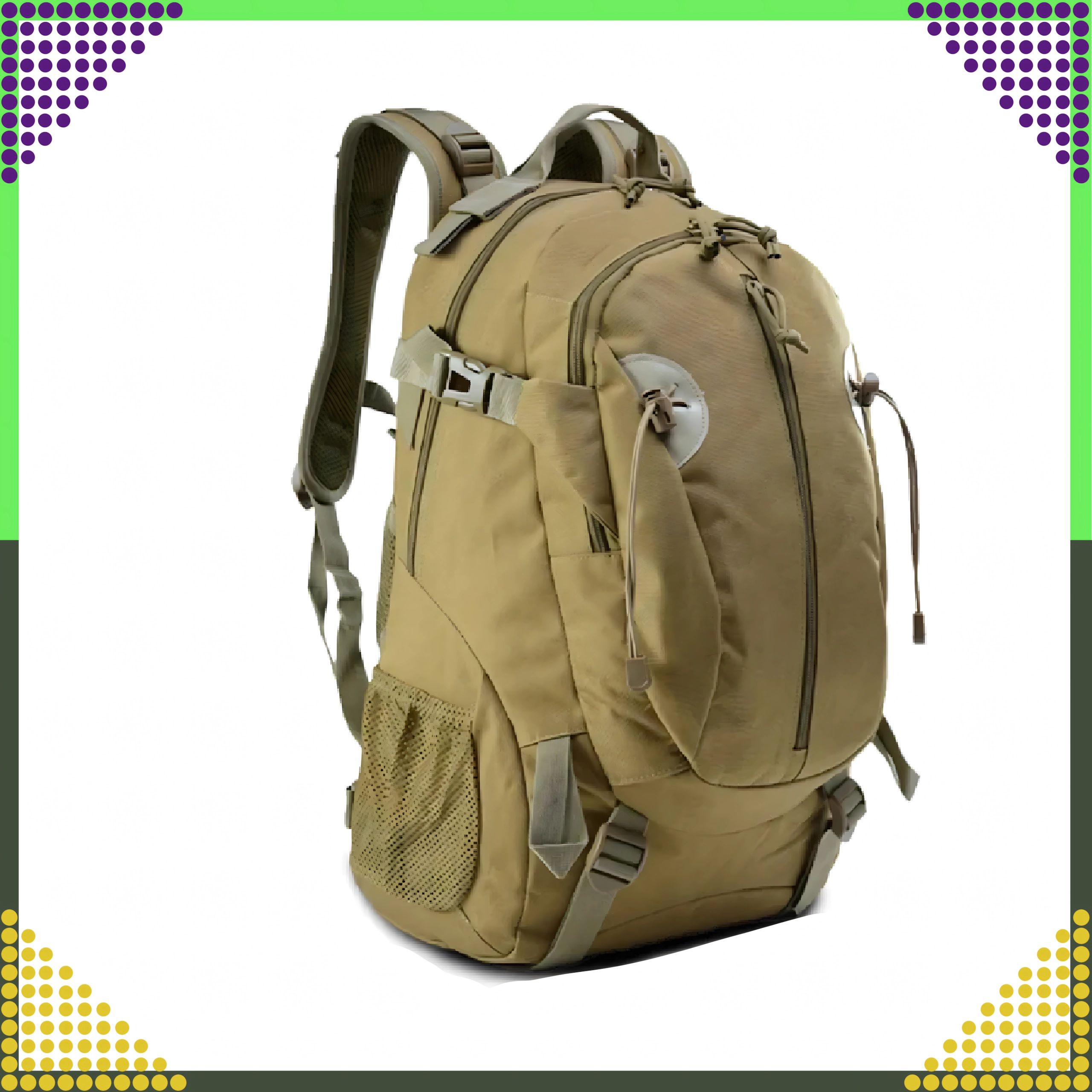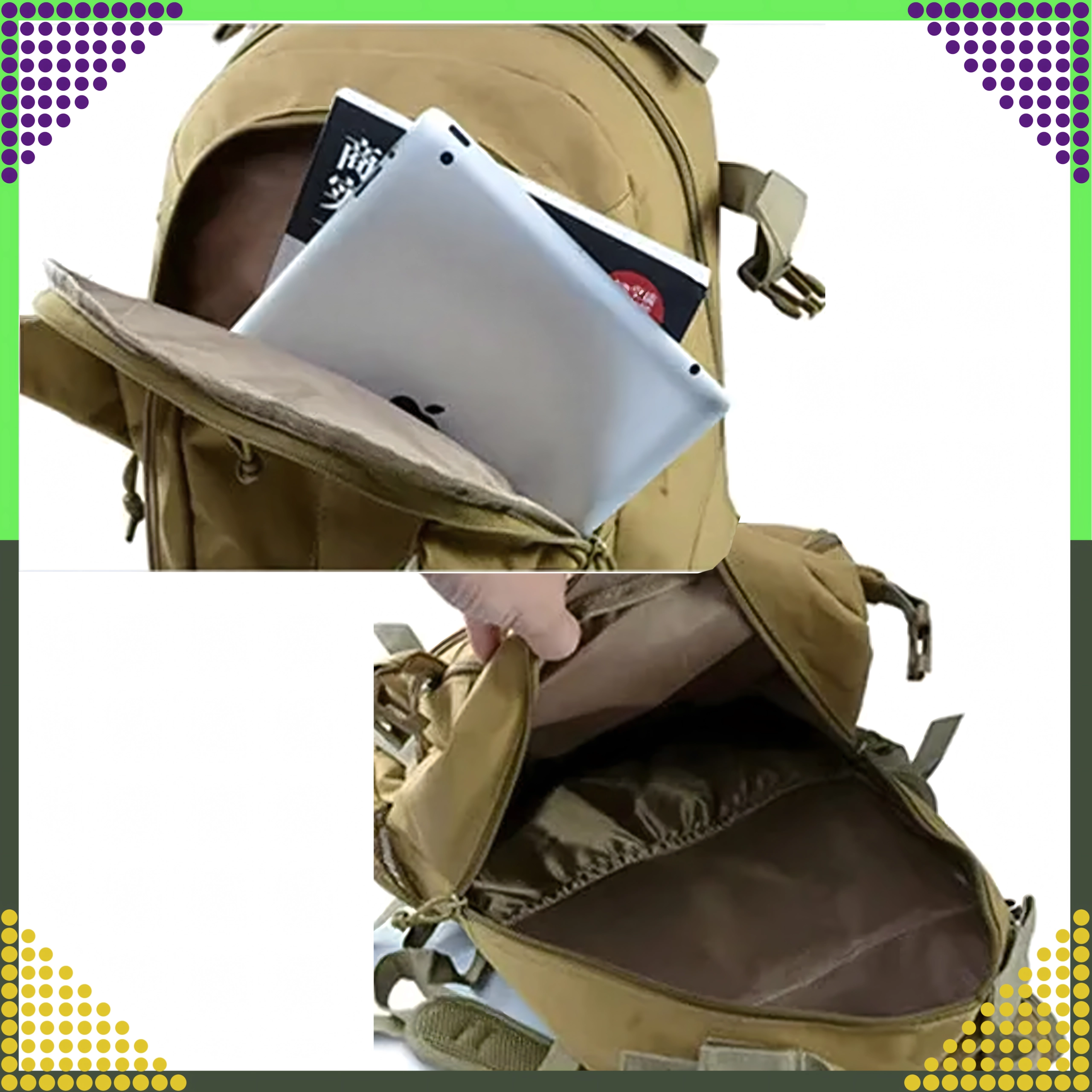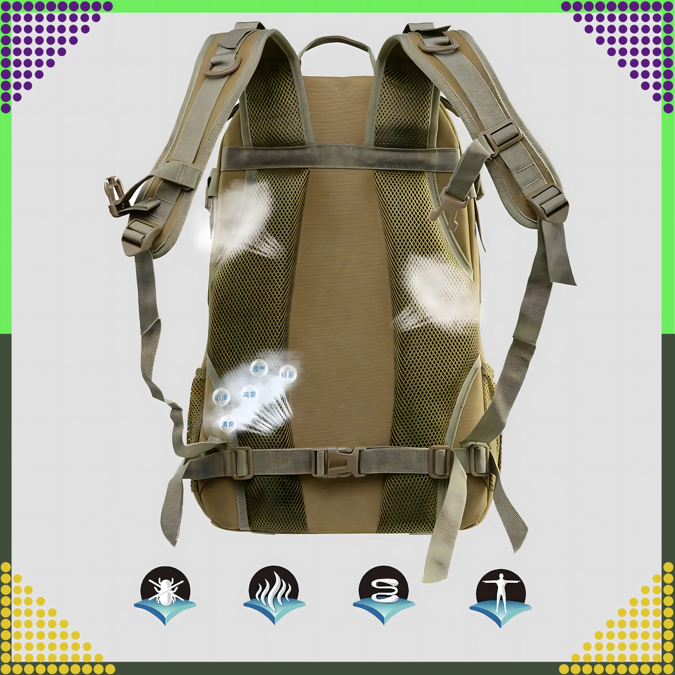 Ovaj taktički ruksak u univerzalnoj khaki boji dizajniran je za pouzdanu svakodnevnu upotrebu u prirodi i gradu. Izdržljiva tkanina 900D poliester s unutarnjom PVC laminacijom povećava vodoodbojnost i štiti sadržaj od vlage. Podstavljena leđa i naramenice s ventilacijskim sustavom osiguravaju udobnost i pri duljem nošenju.