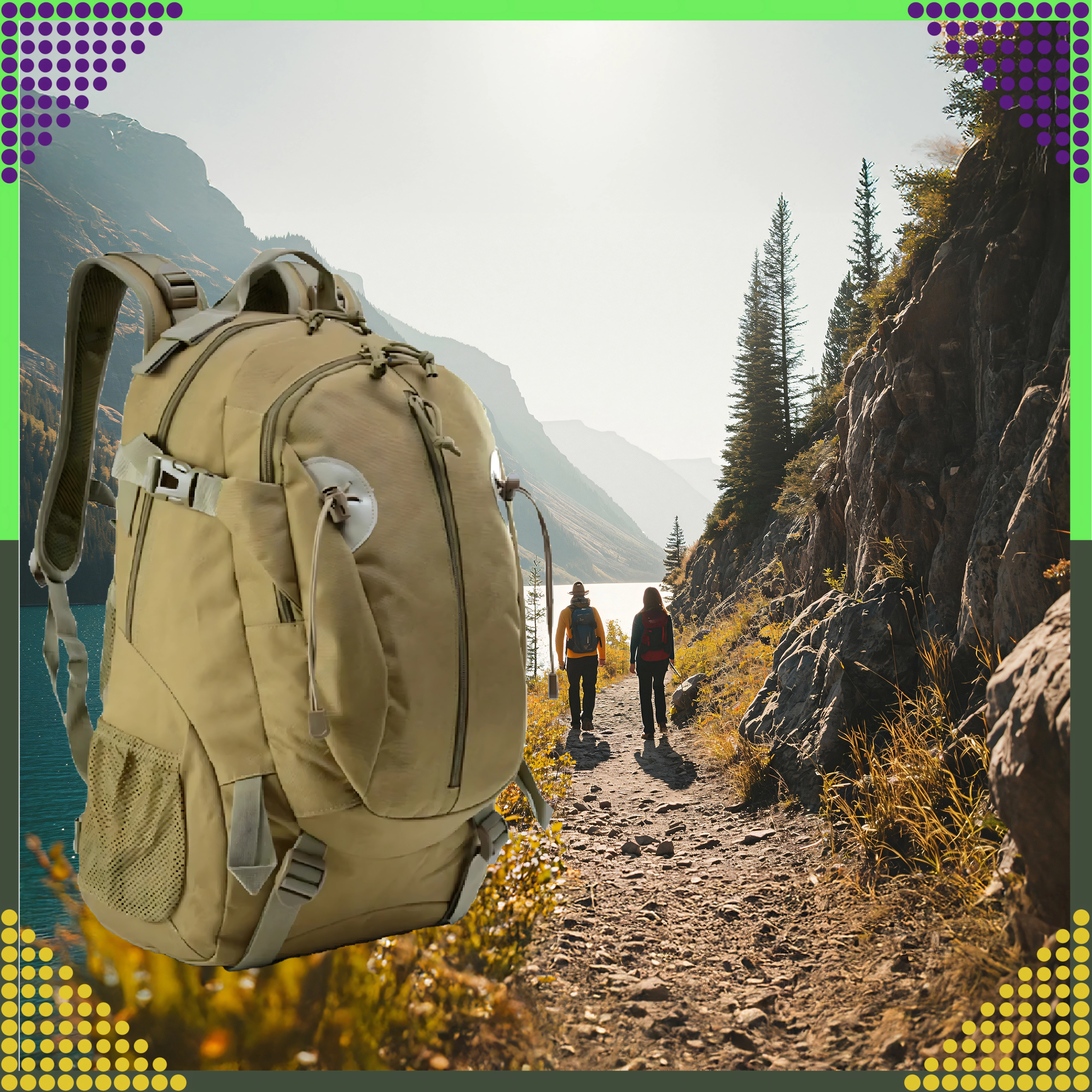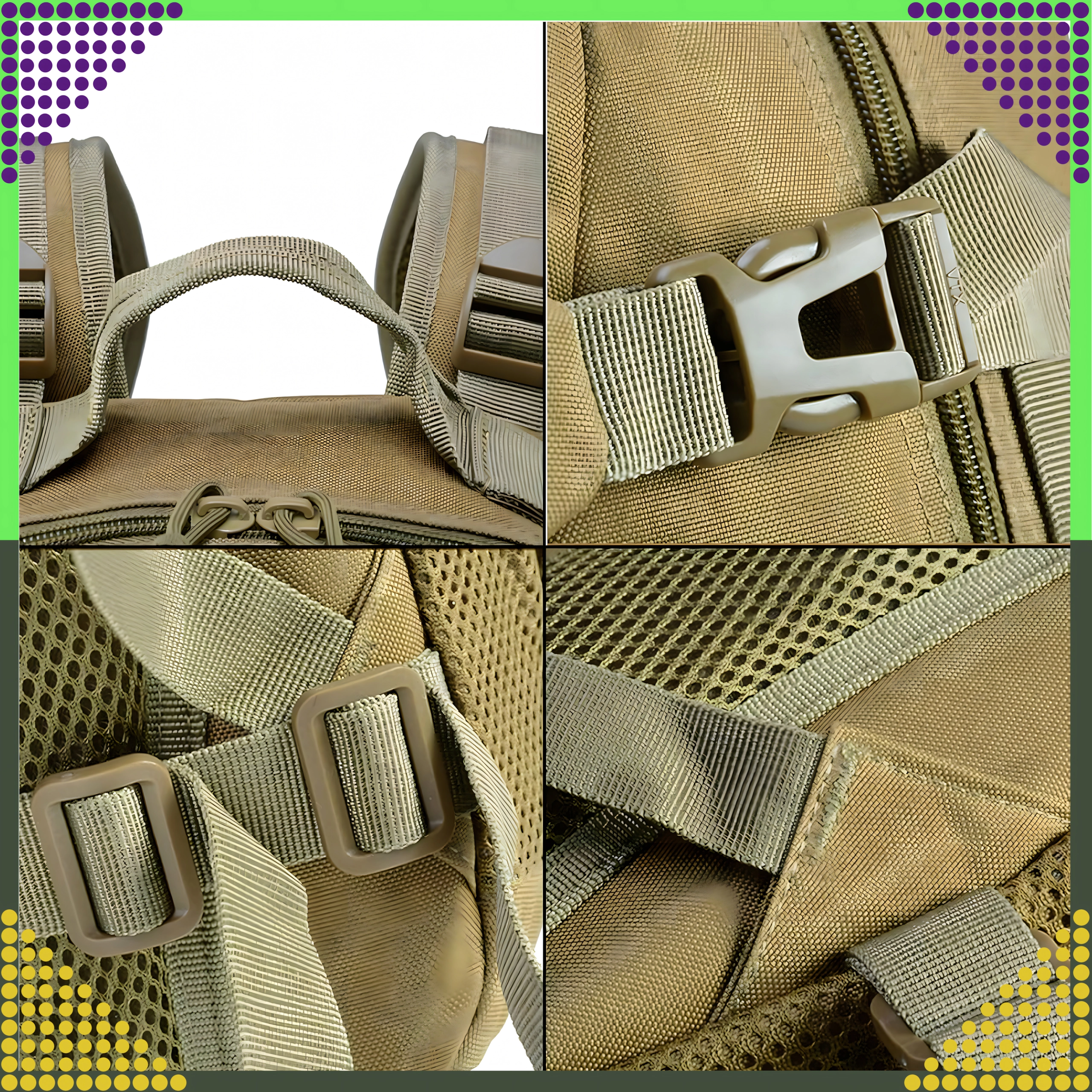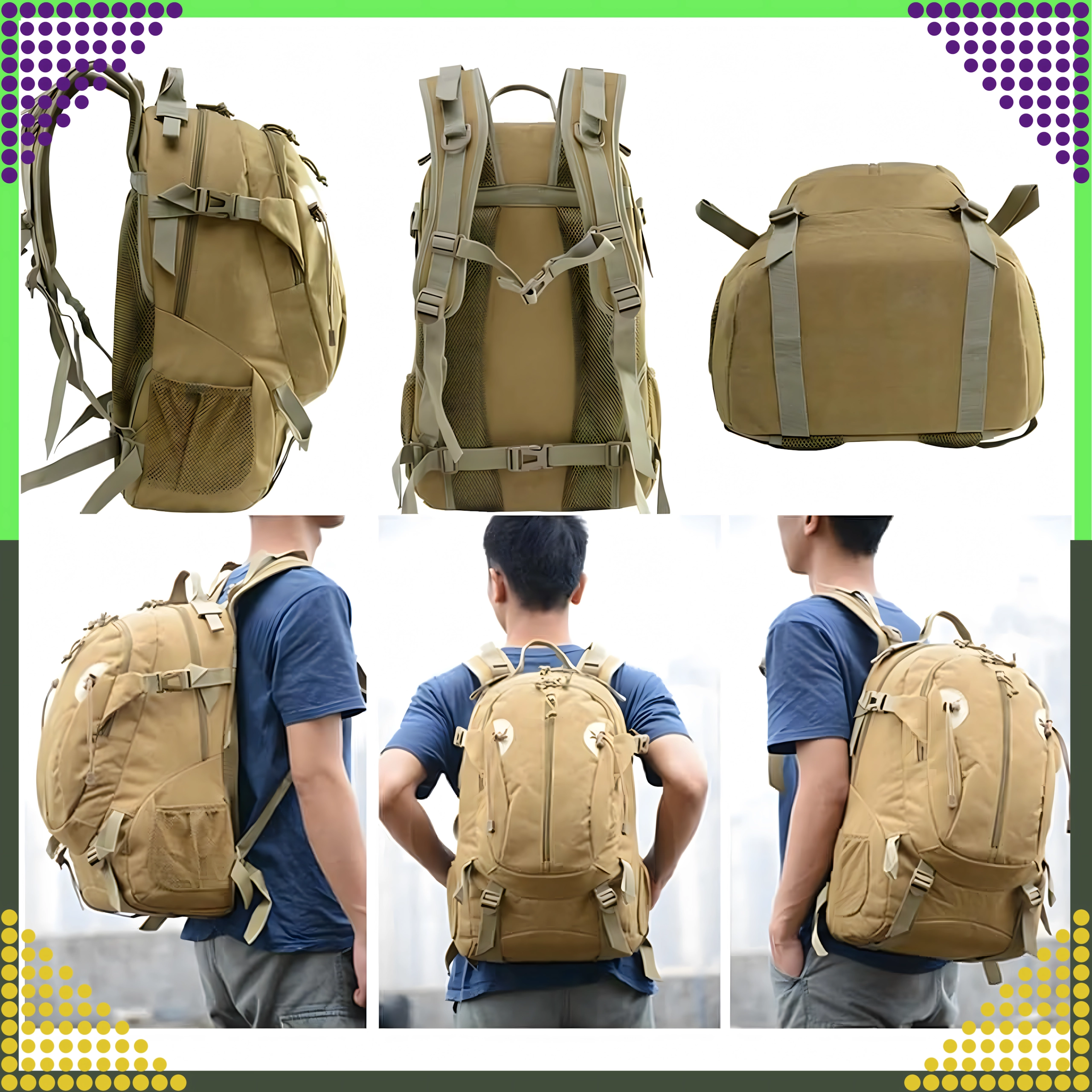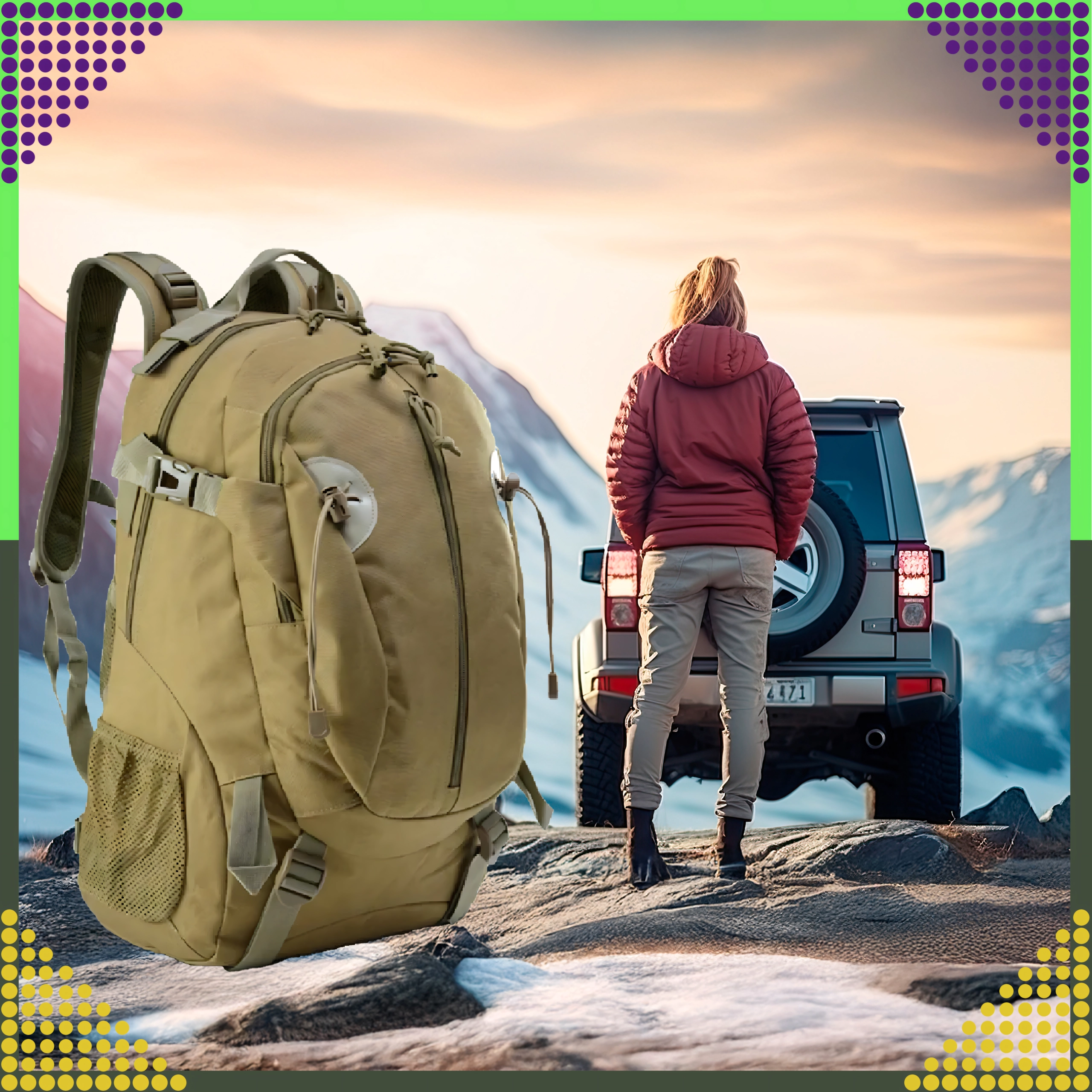 Ovaj taktički ruksak u univerzalnoj khaki boji dizajniran je za pouzdanu svakodnevnu upotrebu u prirodi i gradu. Izdržljiva tkanina 900D poliester s unutarnjom PVC laminacijom povećava vodoodbojnost i štiti sadržaj od vlage. Podstavljena leđa i naramenice s ventilacijskim sustavom osiguravaju udobnost i pri duljem nošenju.
