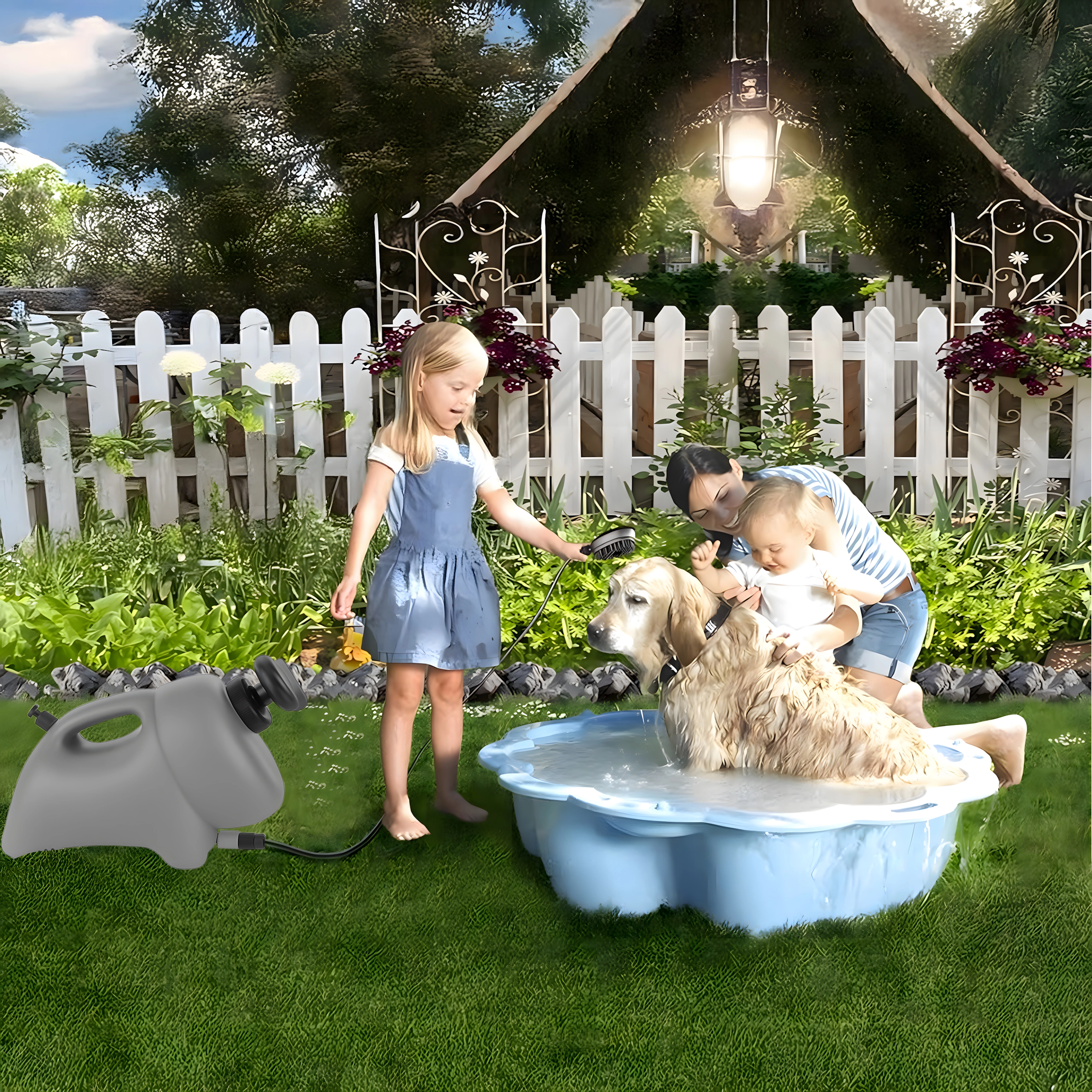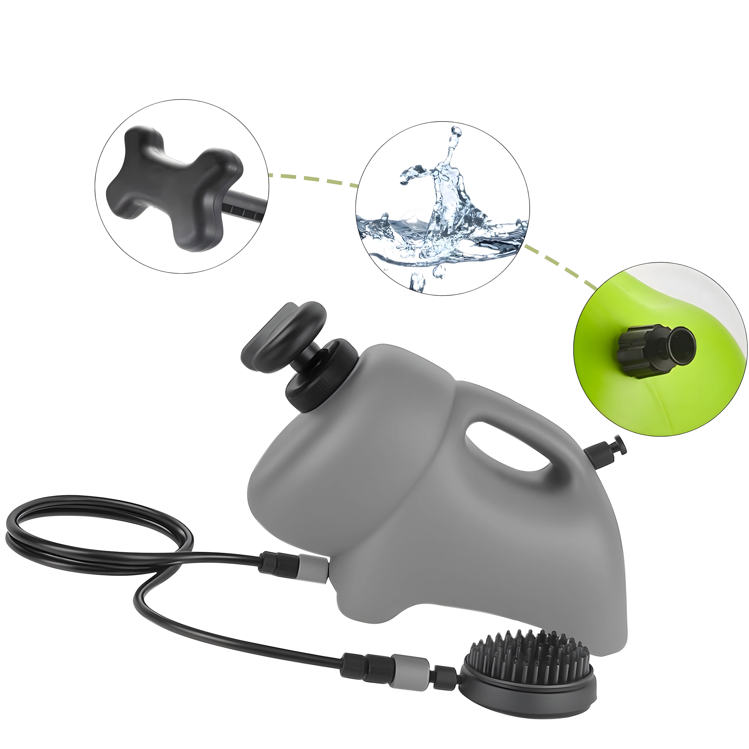 Lagan spremnik s udobnom ručkom i crijevom osigurava dovoljno vode za potpuno kupanje i na terenu. Radi bez napajanja – samo napunite i možete prati gdje god želite.