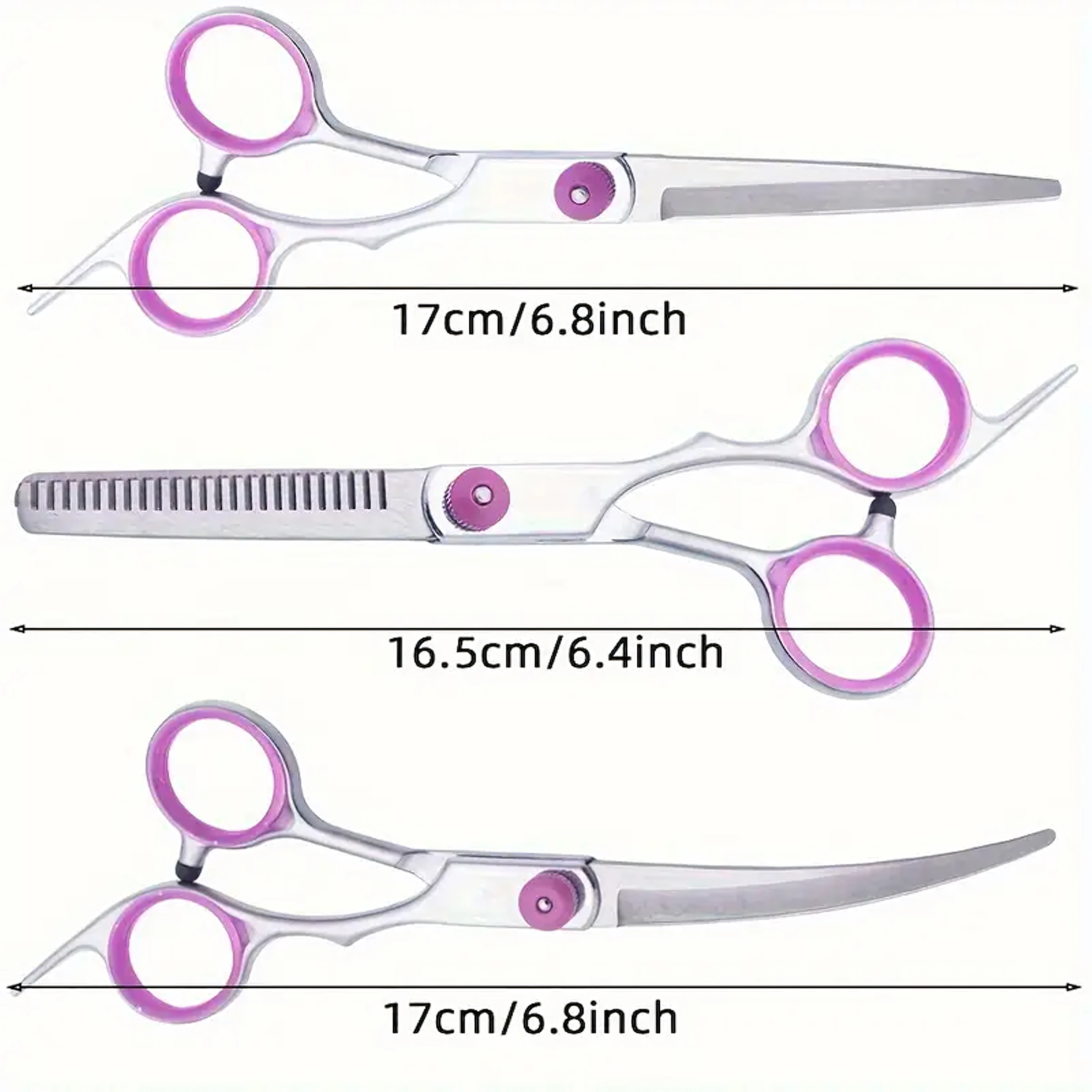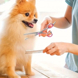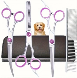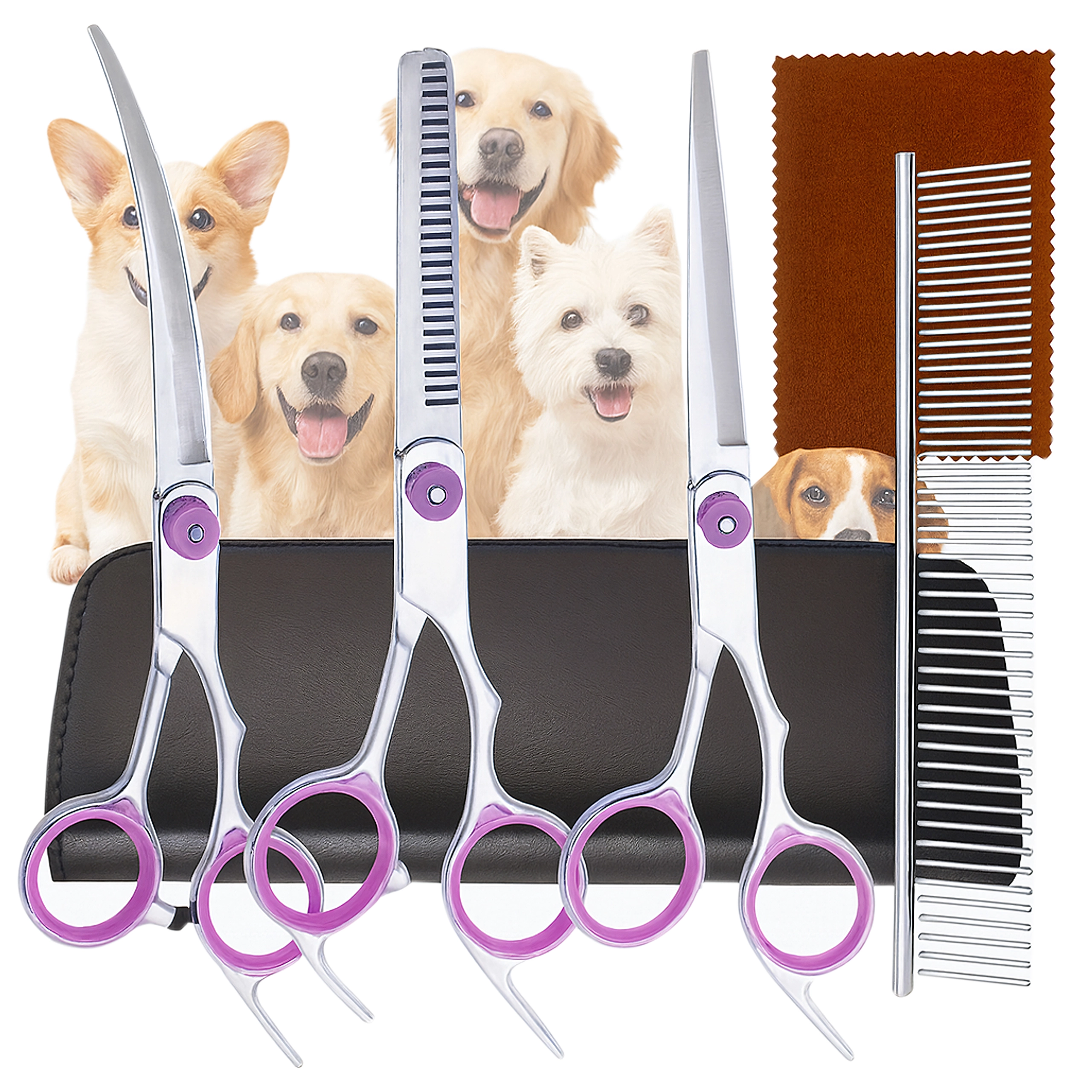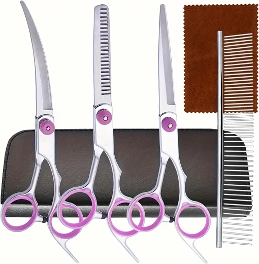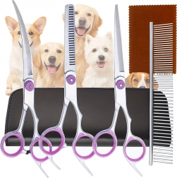 Tri vrste škara (ravne, zakrivljene, efila) + metalni češalj u zaštitnom etuiju. Sve za šišanje, oblikovanje i prorjeđivanje dlake na jednom mjestu.