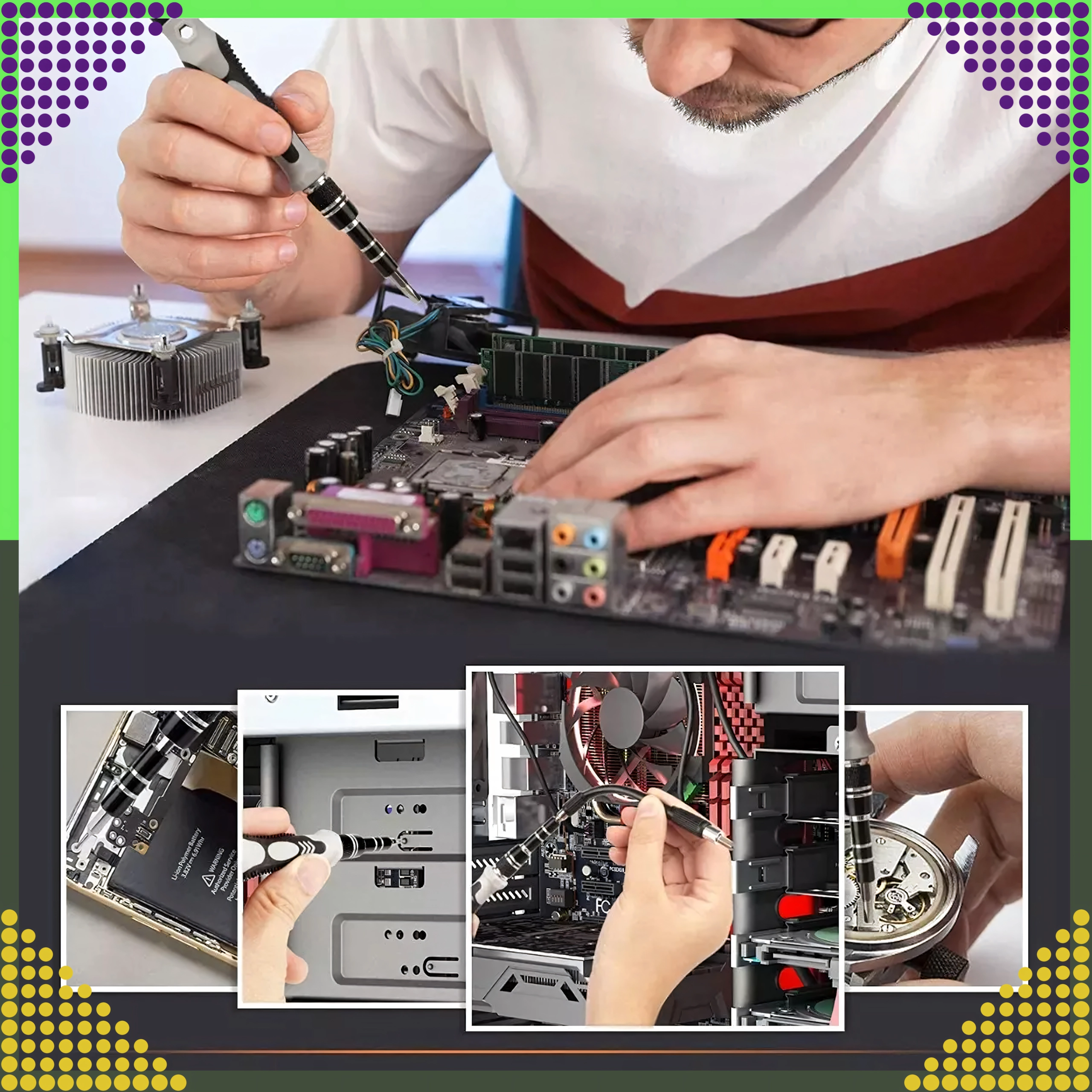 Izmjenjivi nastavci i tanka drška osiguravaju fin rad na telefonima, prijenosnicima, PCB pločama, fotoaparatima i satovima.