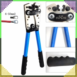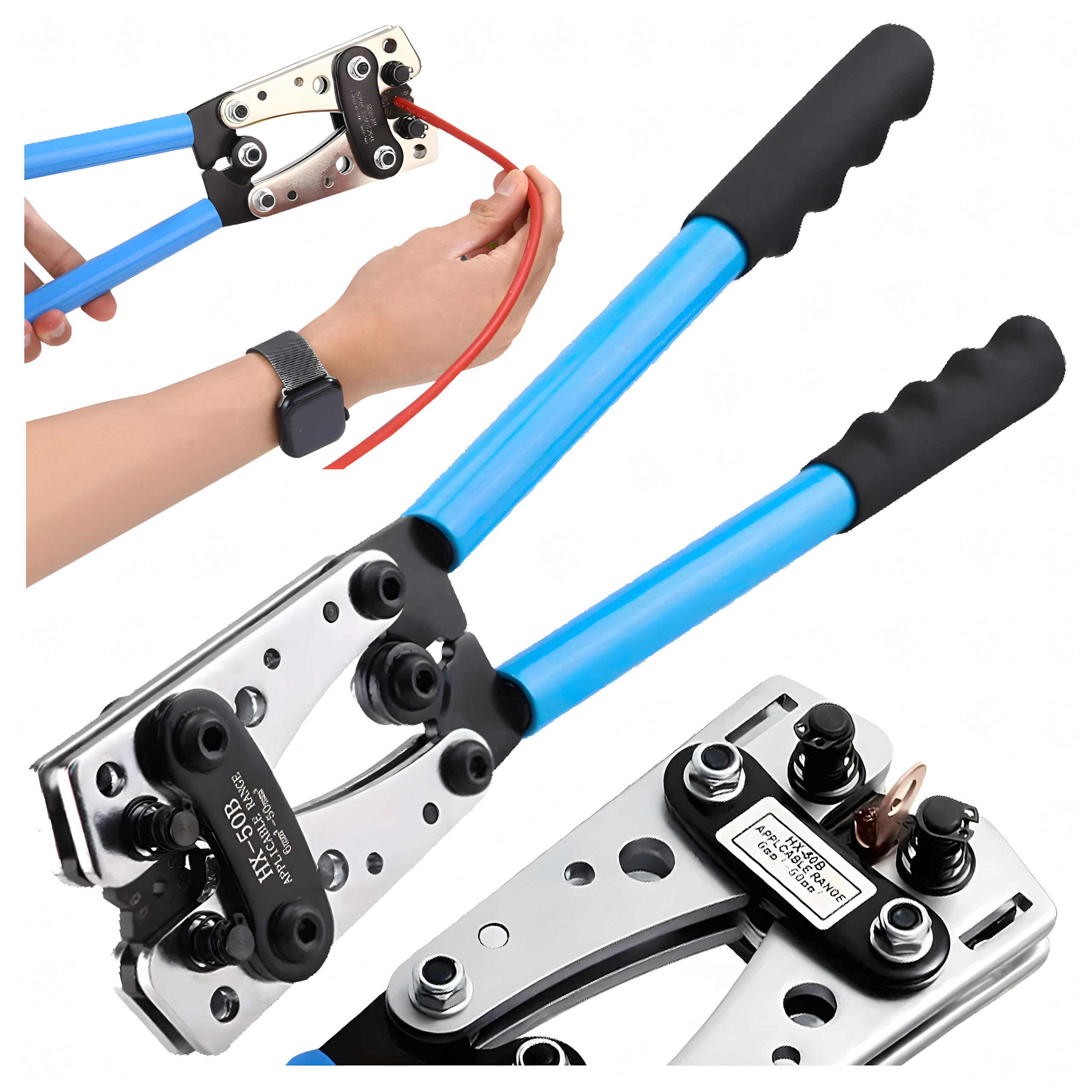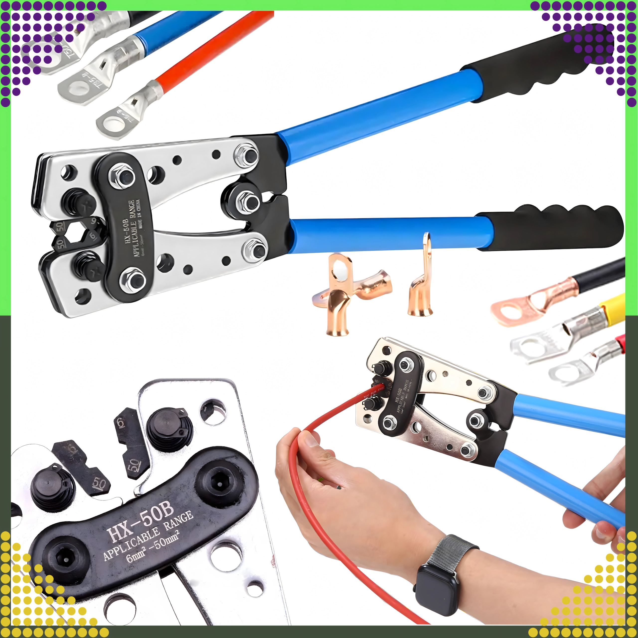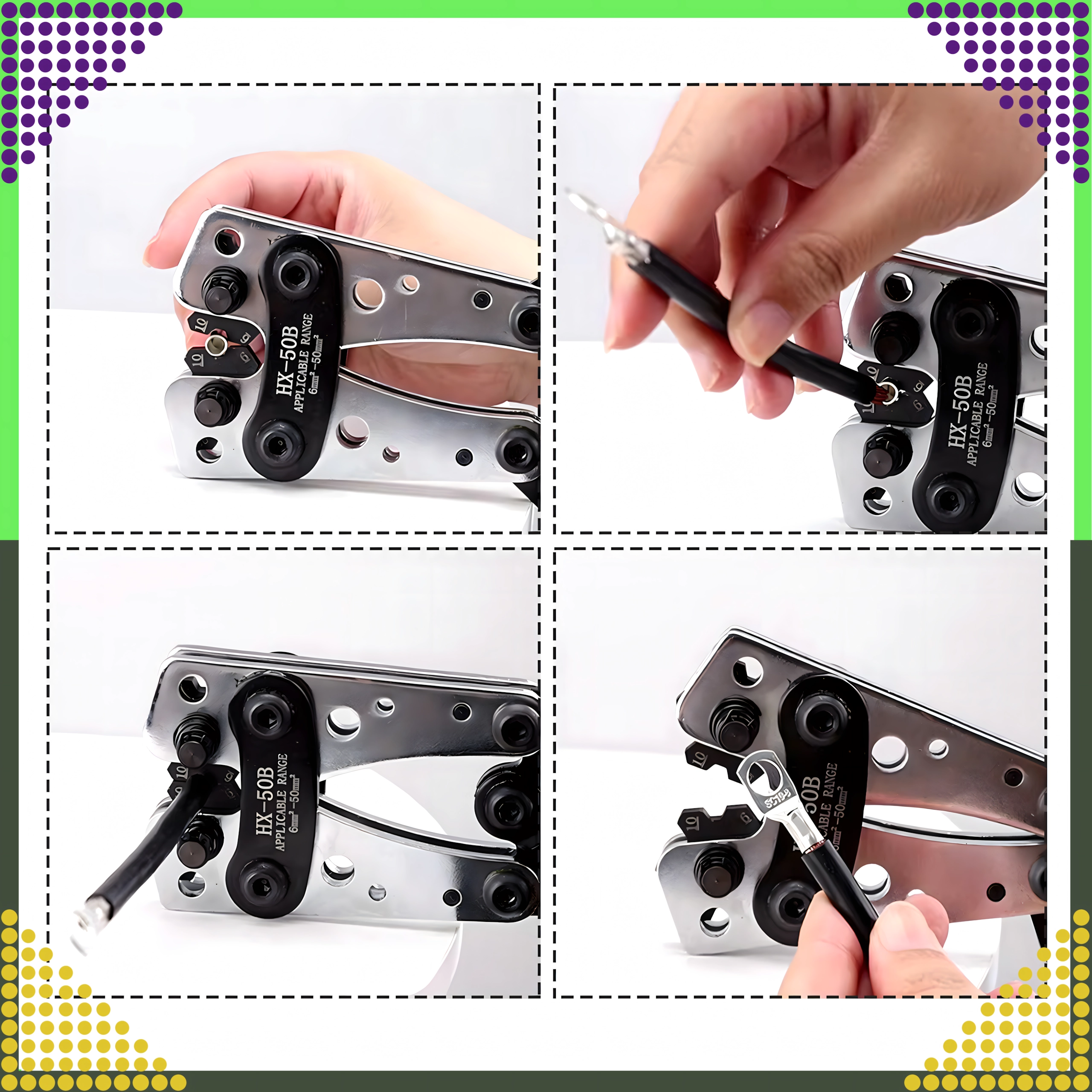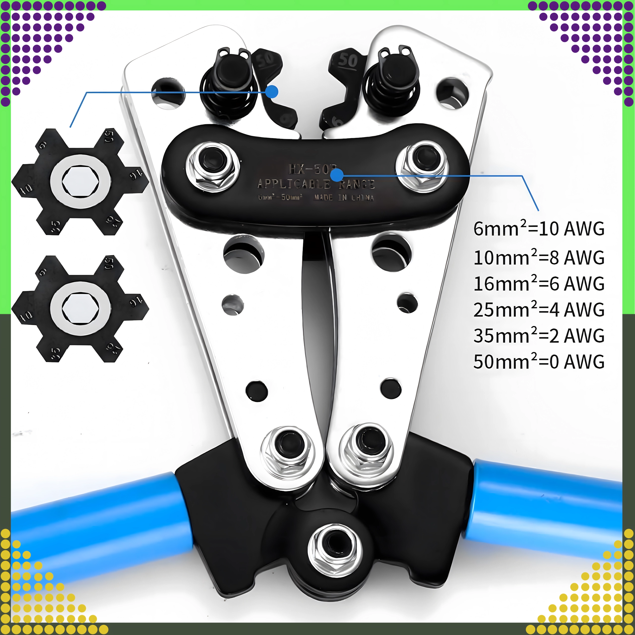 Ova robusna preša za stopice i tuljce dizajnirana je za precizan rad s električnim vodičima u rasponu 6–50 mm². Šesterokutna krimp matrica osigurava stabilan, mehanički otporan i vodljiv spoj. Zahvaljujući polužnom prijenosu i duljini od 390 mm postižete visoku silu prešanja uz manji napor.