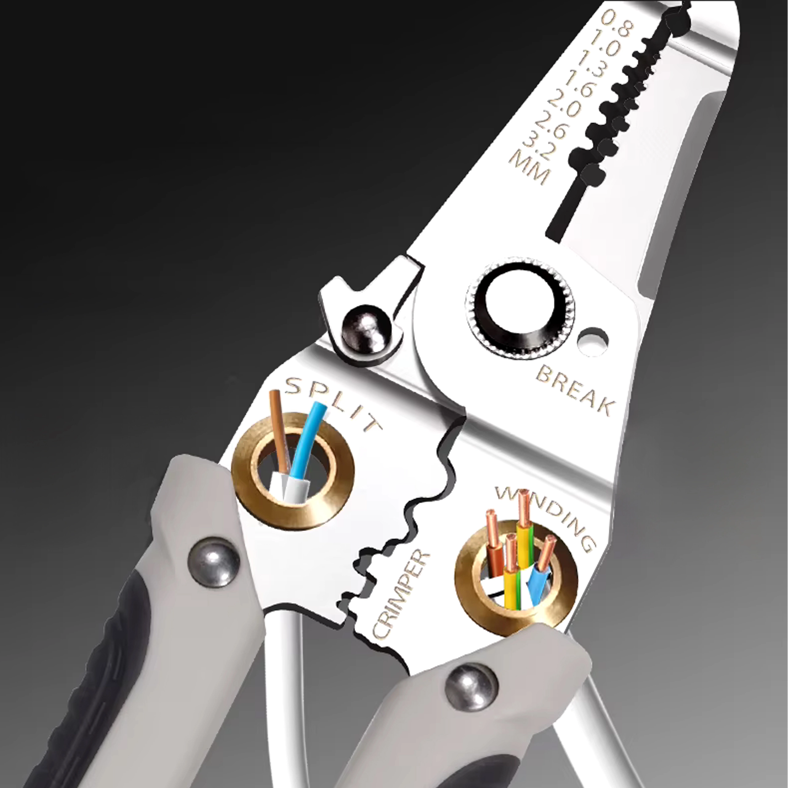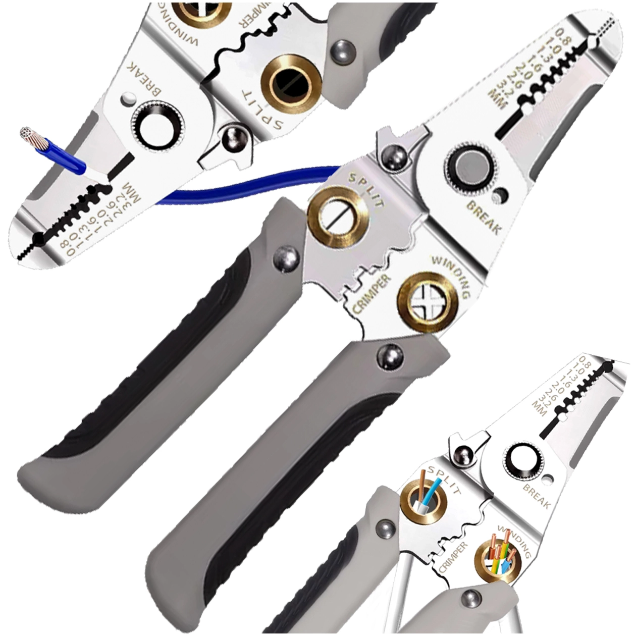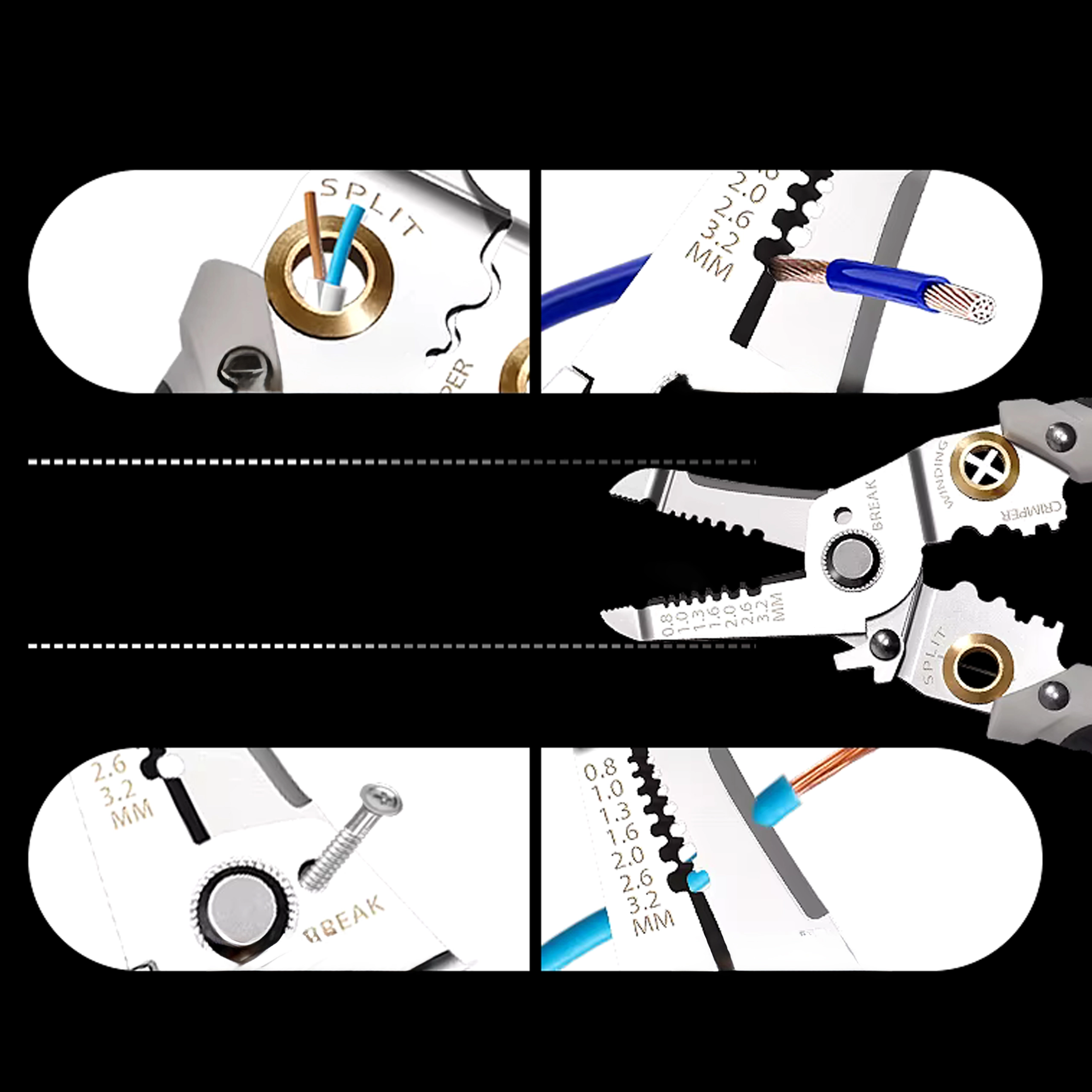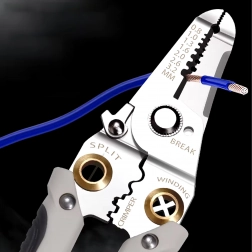 - 7 funkcija u 1: skidanje izolacije, rezanje, krimpanje, uvijanje, razdvajanje i držanje vodiča, plus rezni otvori za uobičajene promjere