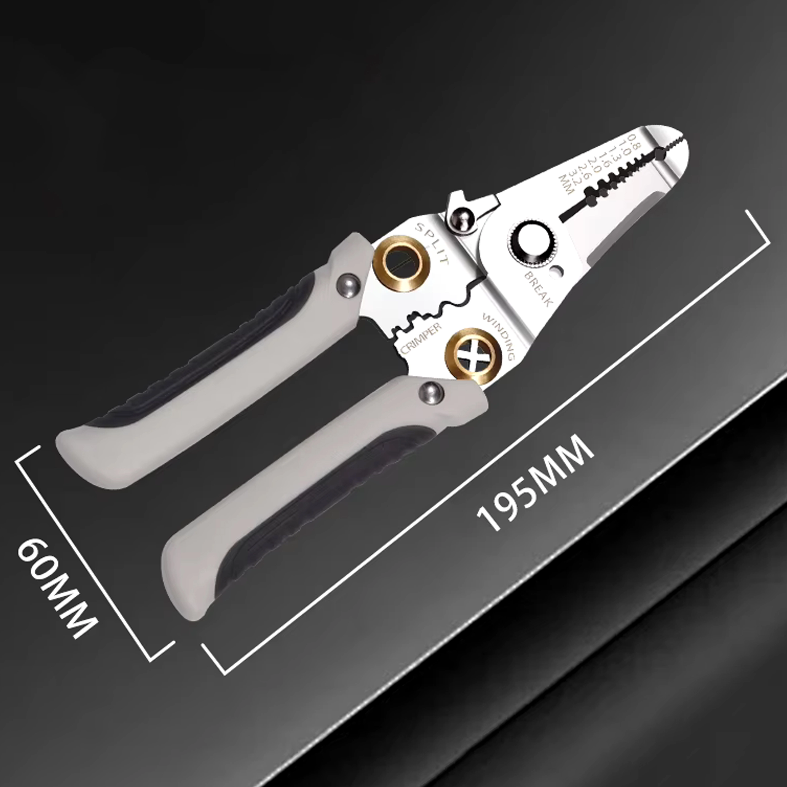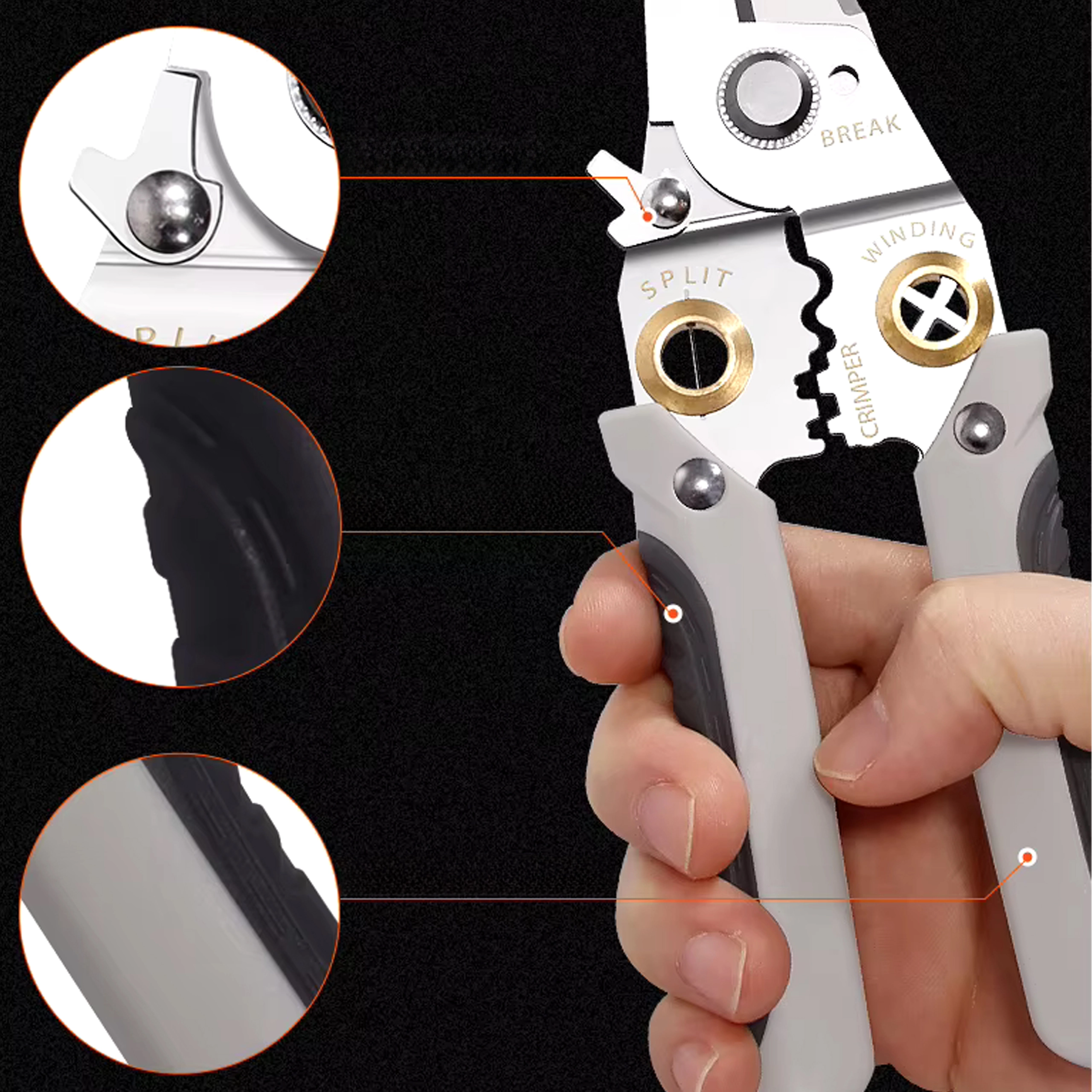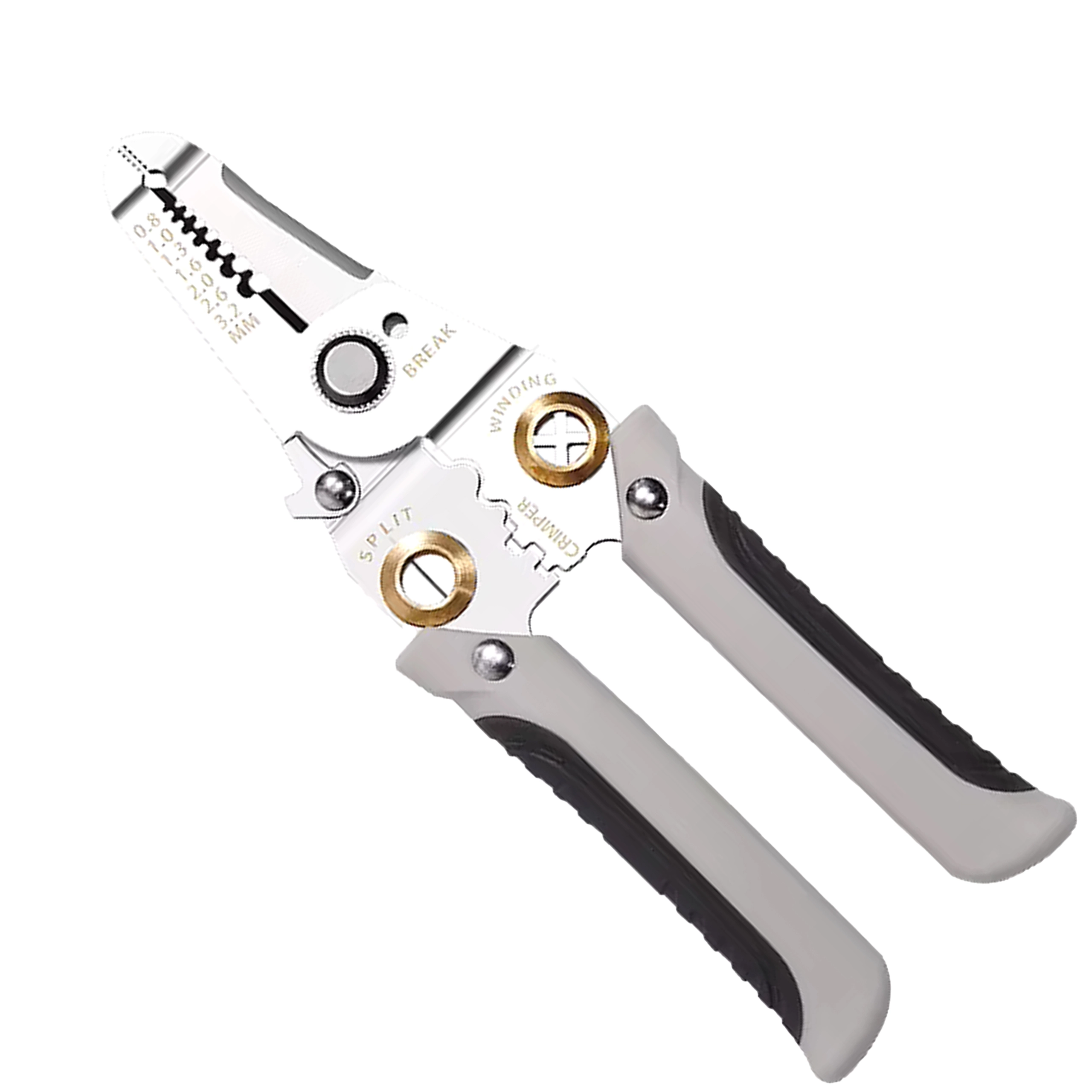 - 7 funkcija u 1: skidanje izolacije, rezanje, krimpanje, uvijanje, razdvajanje i držanje vodiča, plus rezni otvori za uobičajene promjere