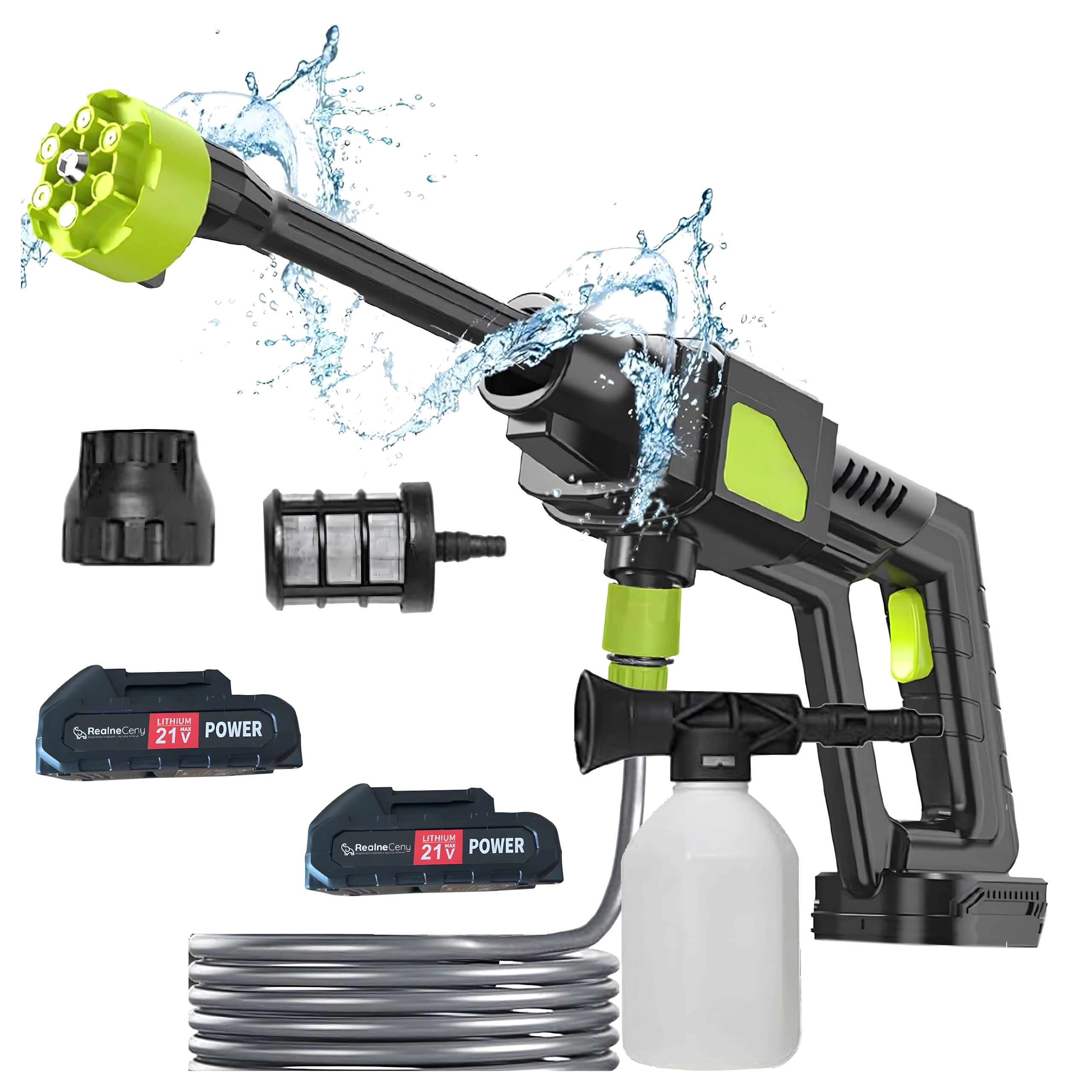 U pakiranju se nalazi dugo crijevo s filtrom, višenamjenska 6u1 mlaznica i praktičan pribor za crpljenje vode npr. iz kante – tako da nije potrebno stalno priključenje na vodovod. Za najviši tlak preporučujemo priključiti peračicu na mrežnu vodu; pri sisanju iz posude tlak je niži, ali i dalje dovoljan za uobičajeno čišćenje.
