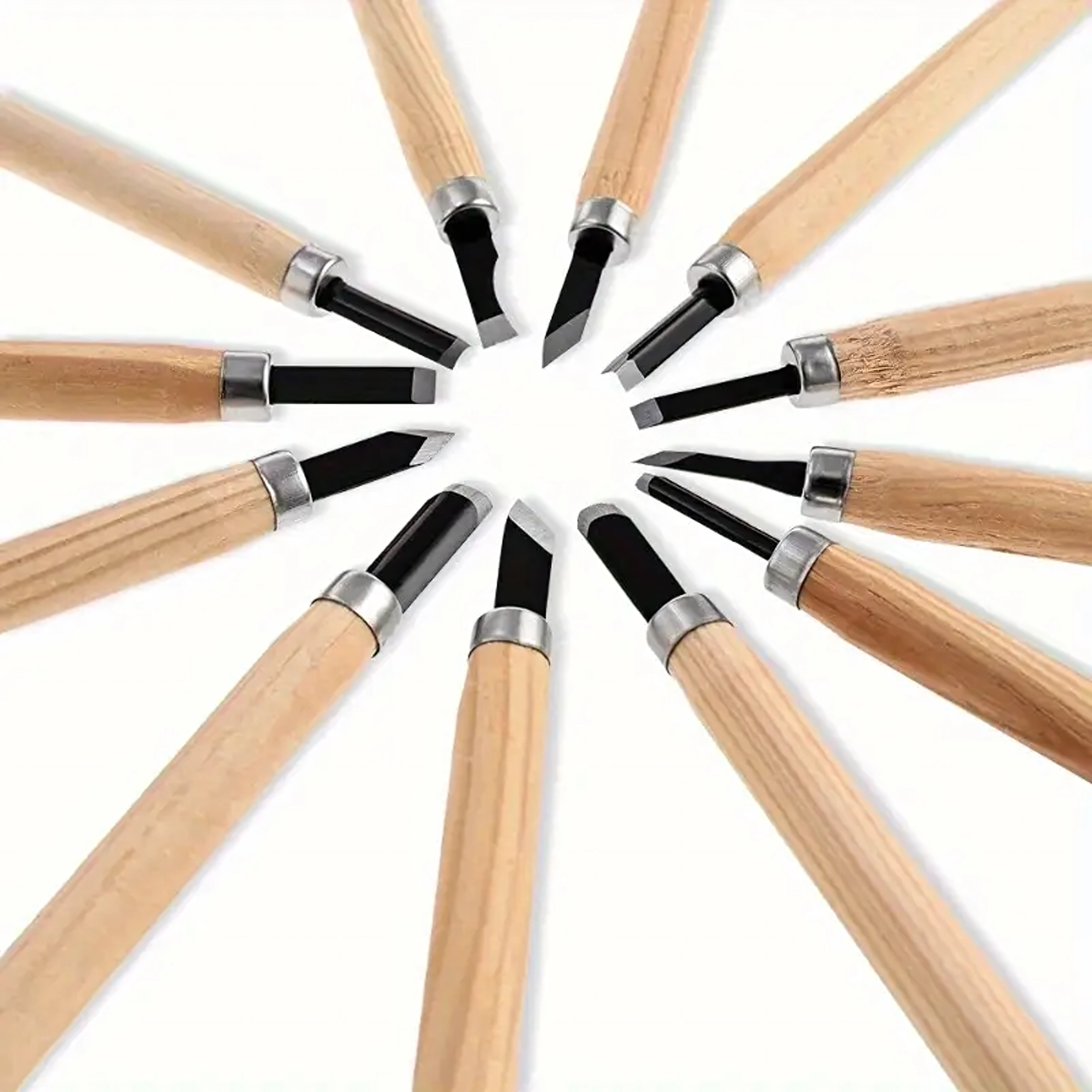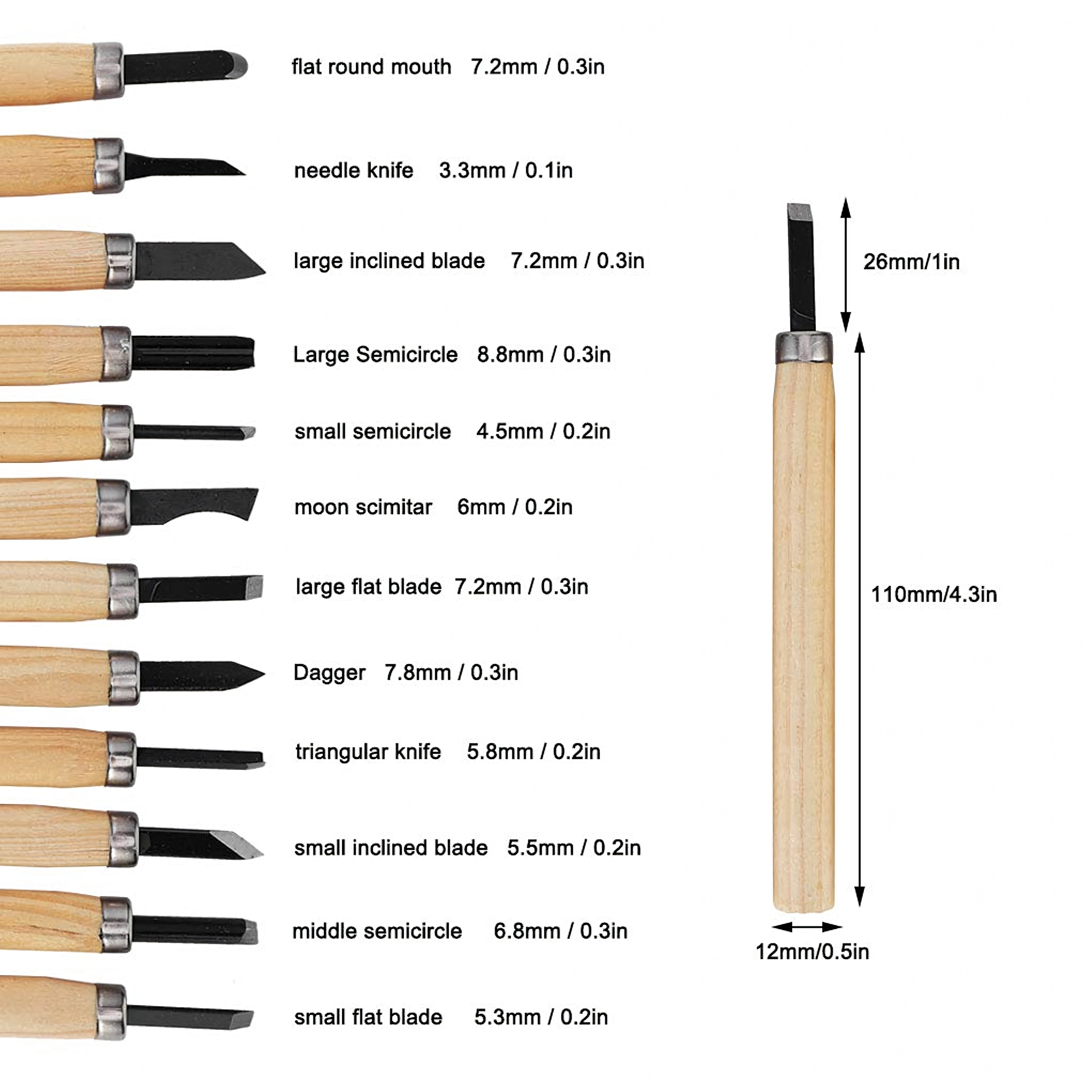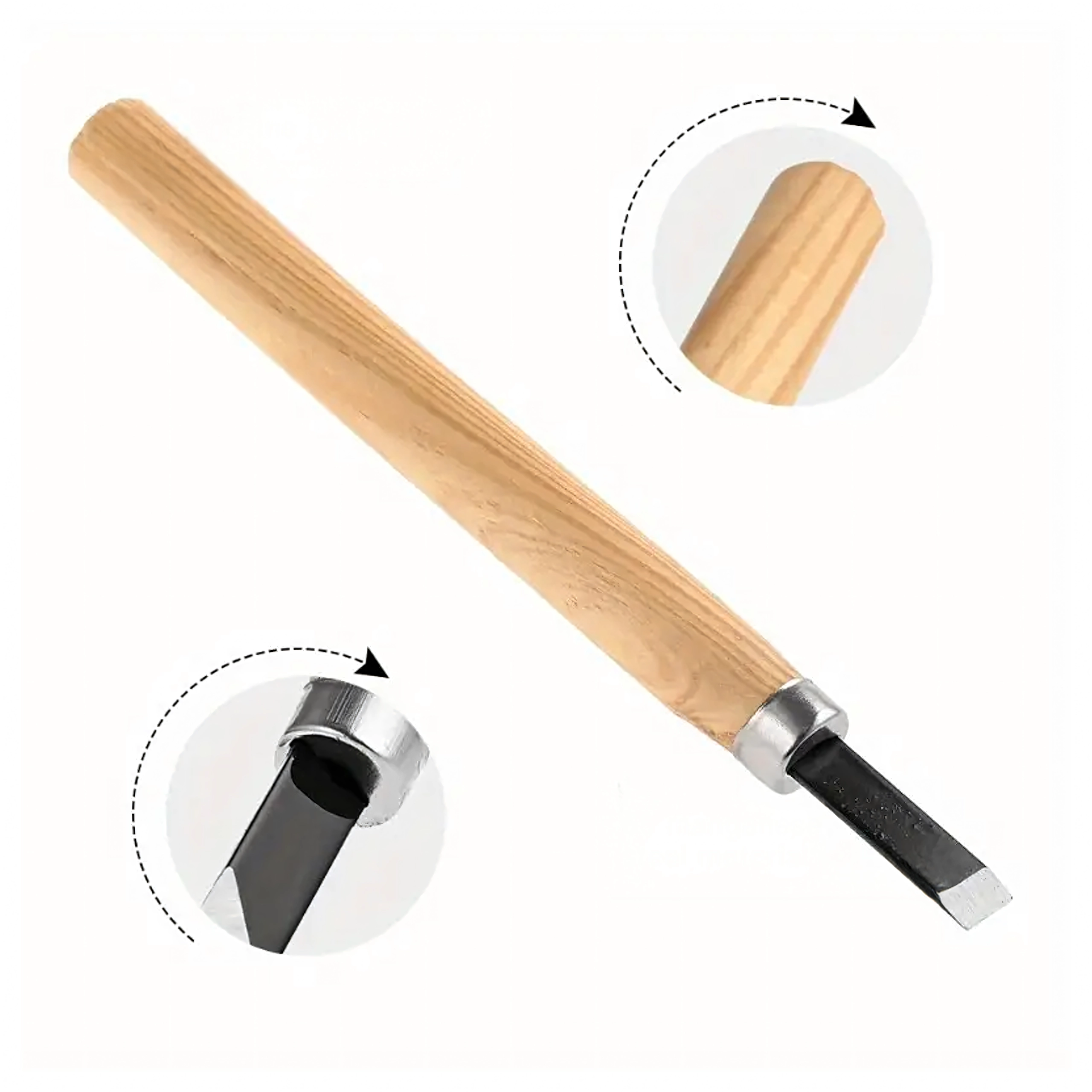 Set uključuje ravna, V i U dlijeta za detalje, udubljenja i ravno skidanje materijala – sve što trebate za rezbarske projekte.