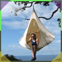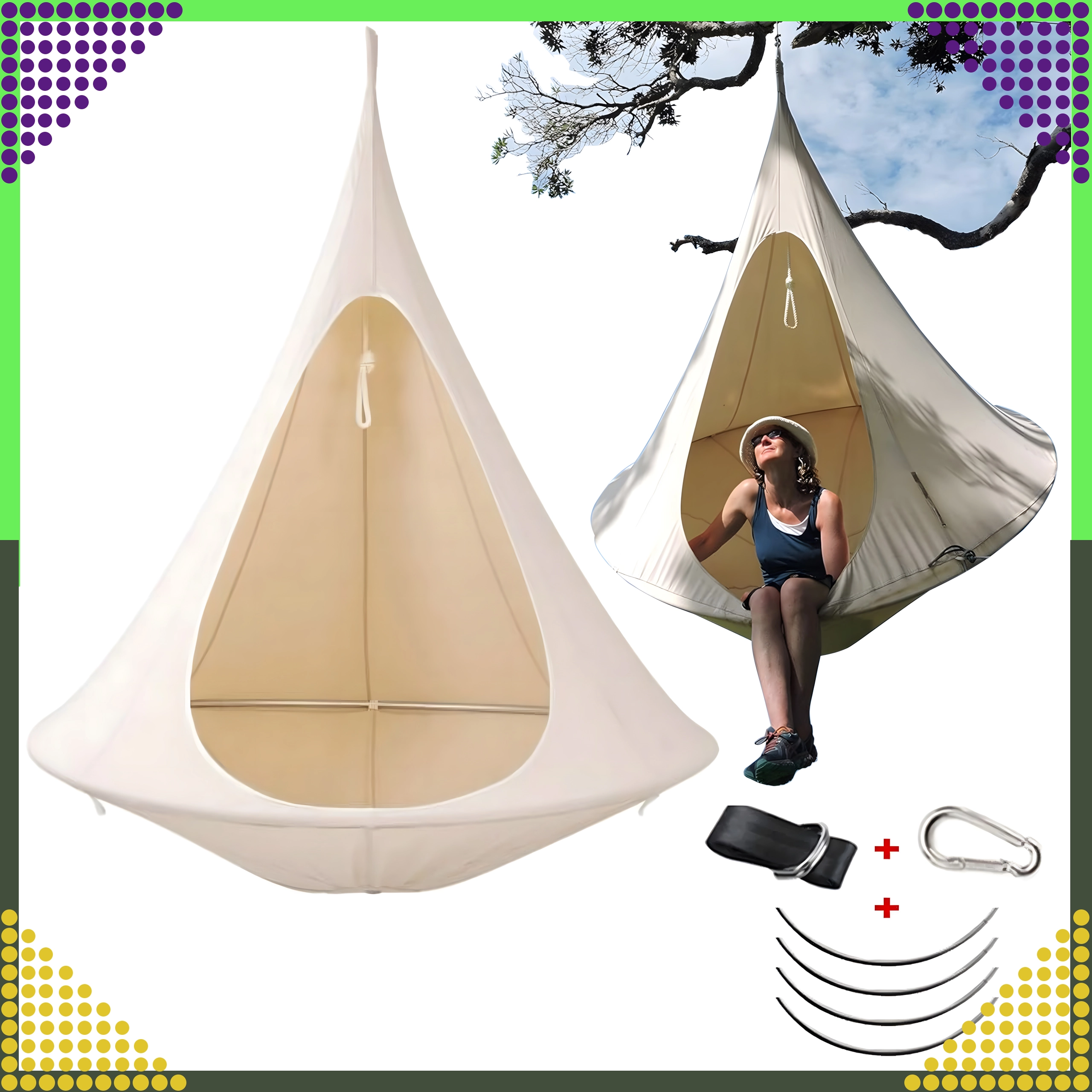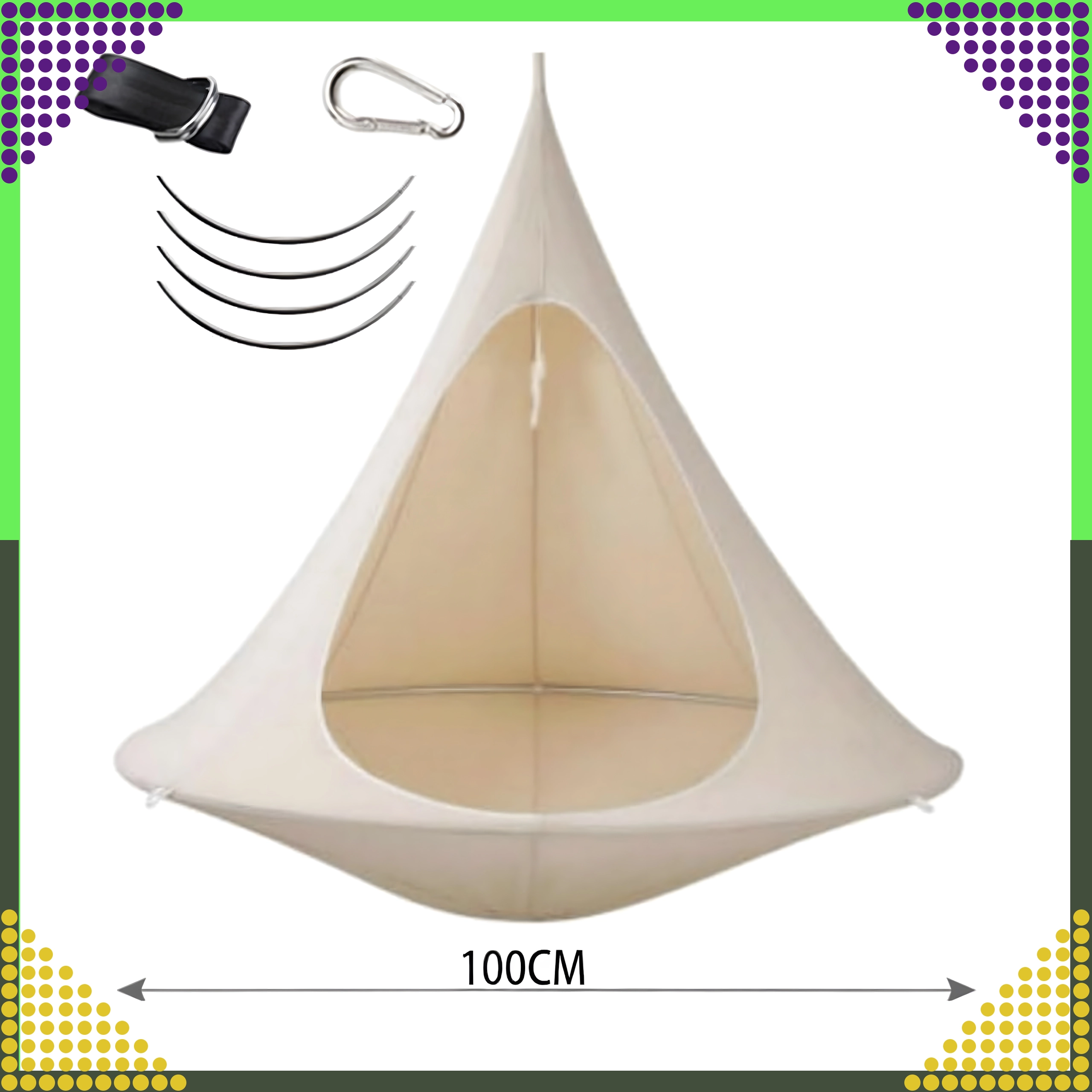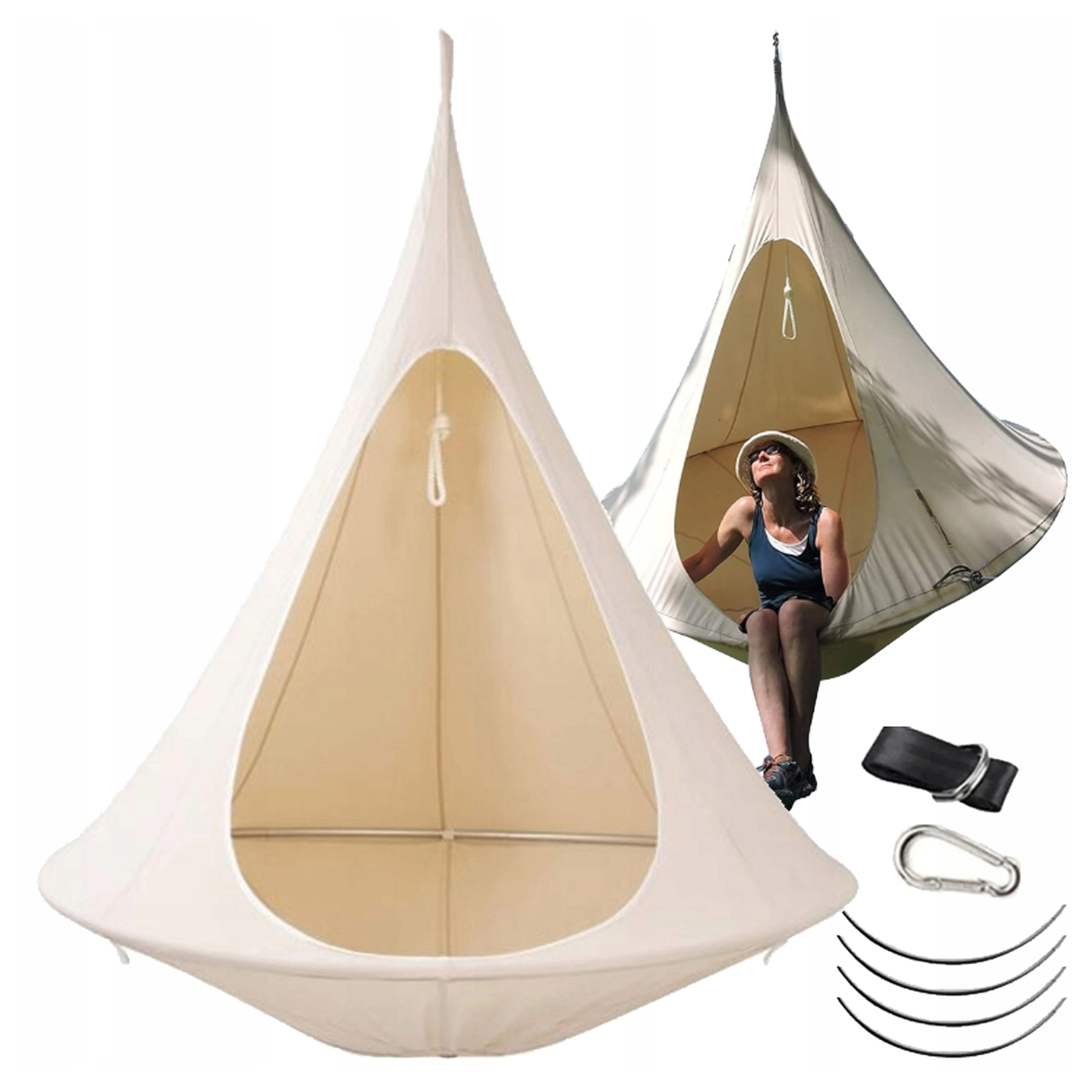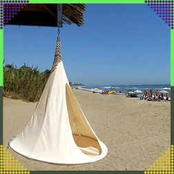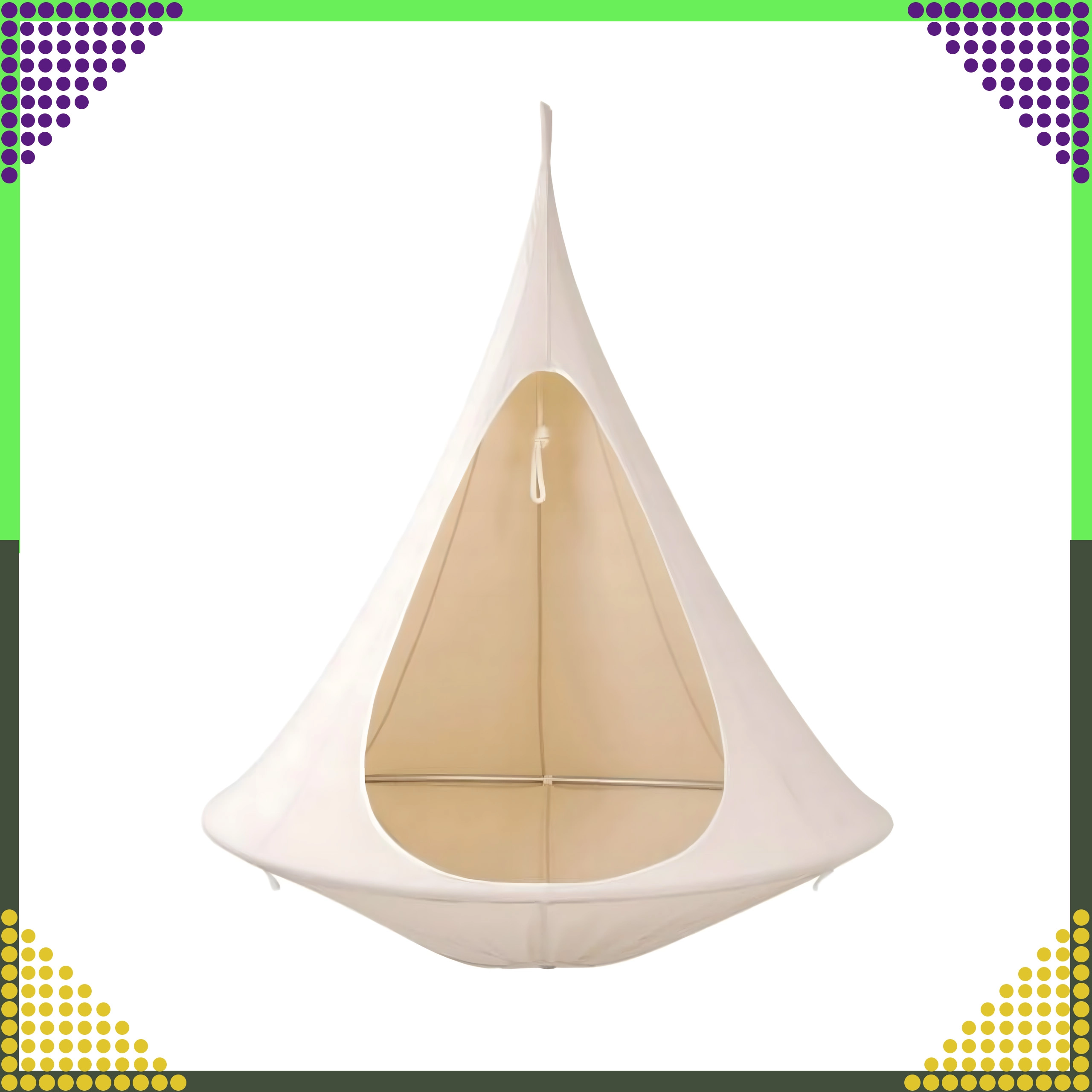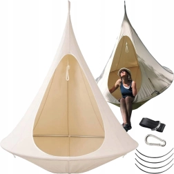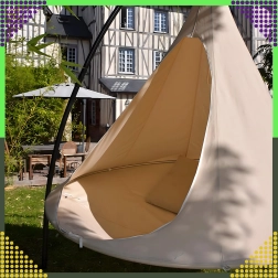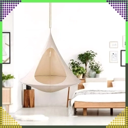 Viseća hamaka u obliku kokona stvara ugodno, sigurno i mirno utočište za čitanje, odmor ili popodnevni drijemež. Zahvaljujući prozračnom materijalu i otpornom ovjesu na jednoj točki prikladna je za dječju sobu, dnevni boravak ili vrt ispod stabla. Bež boja lako se uklapa u svaki stil.
