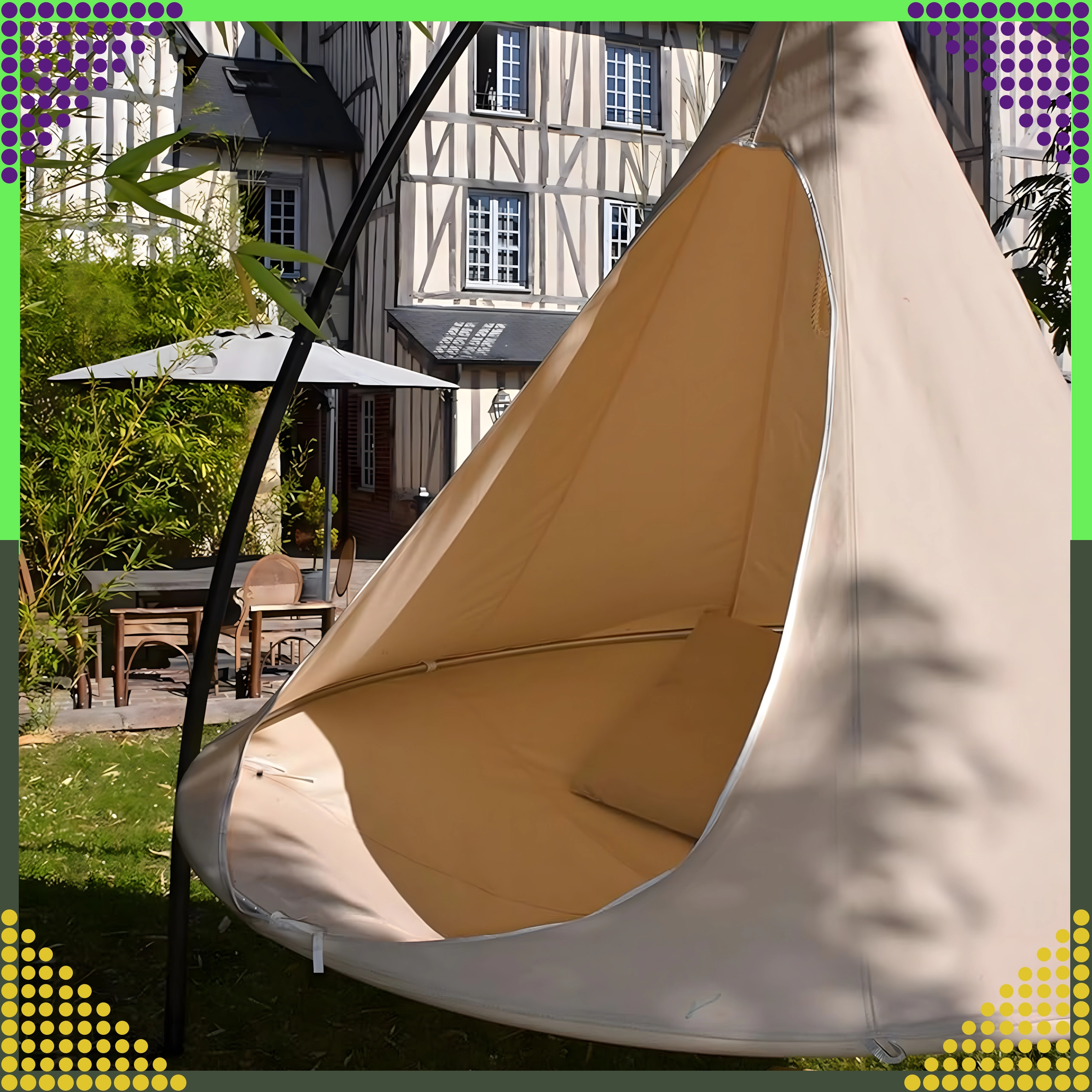 Uživajte u savršenom odmoru u visećoj hamaci tipa kokon koja spaja stilski dizajn, čvrstu konstrukciju i maksimalnu udobnost. Ovaj udoban “kokon” idealan je za vrt, terasu, balkon i interijer, a zahvaljujući nosivosti 150 kg razveselit će i djecu i odrasle. Prozračan materijal i jednostavno održavanje čine ga sjajnim mjestom za opuštanje tijekom cijele godine.