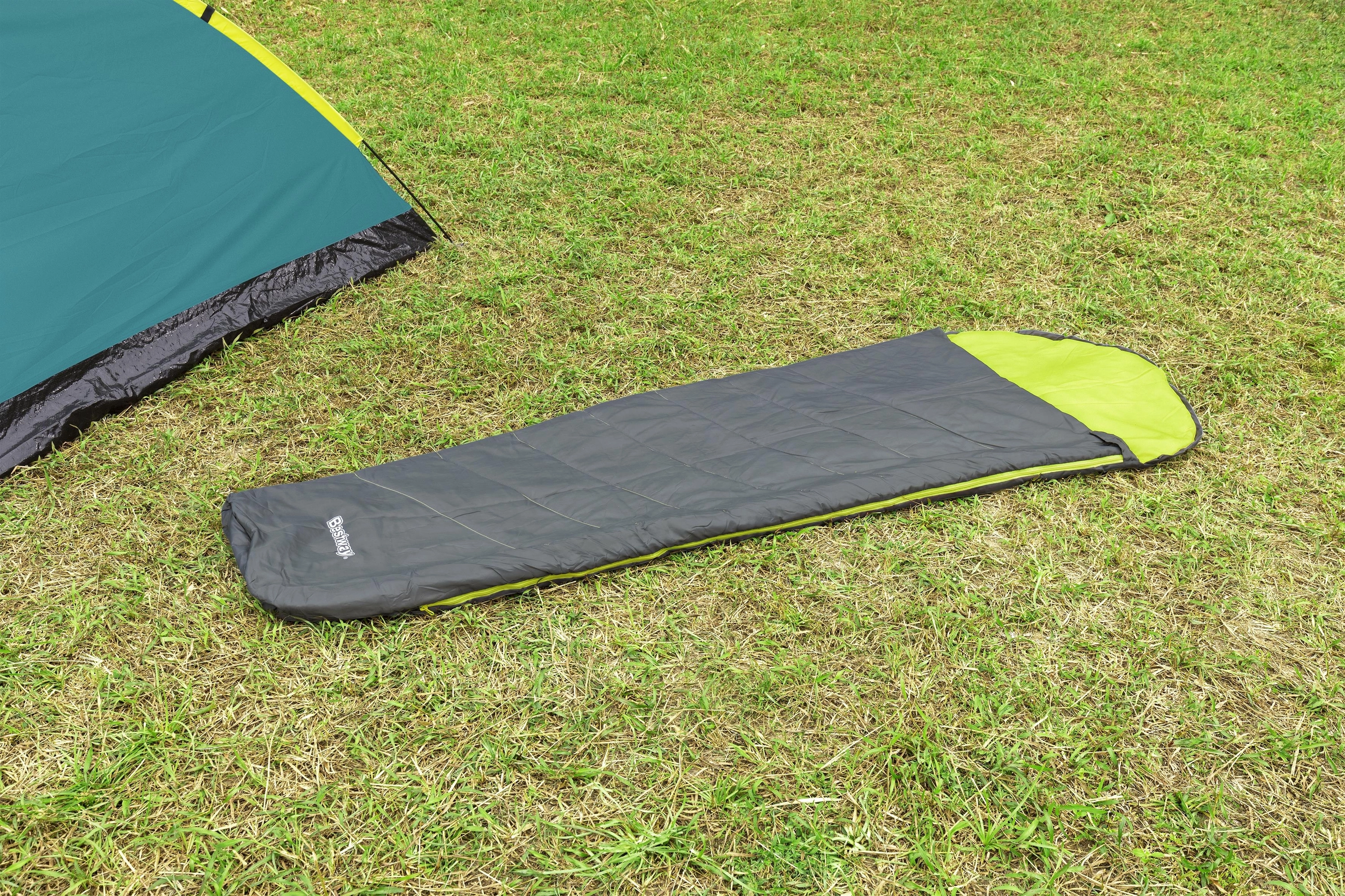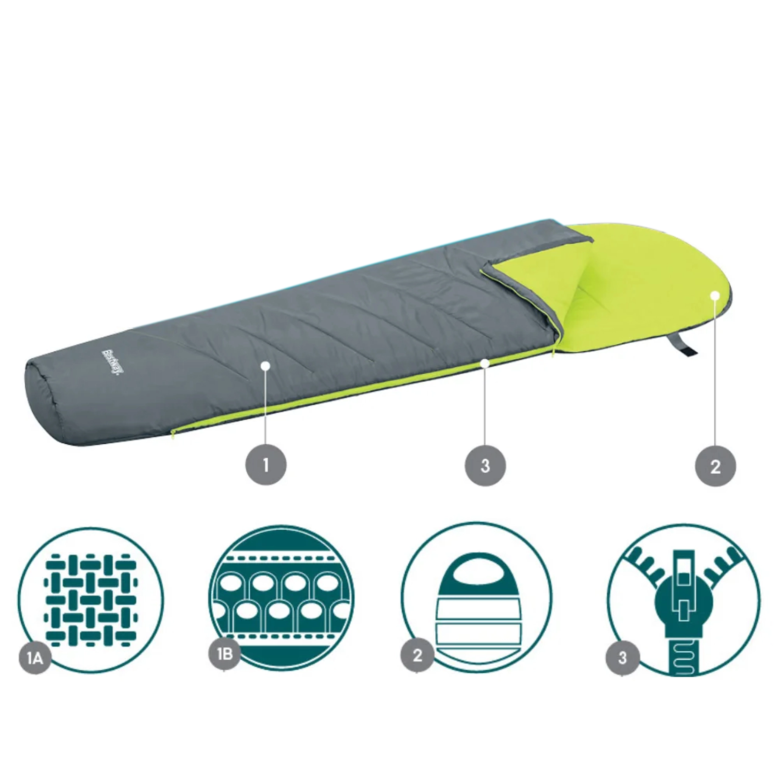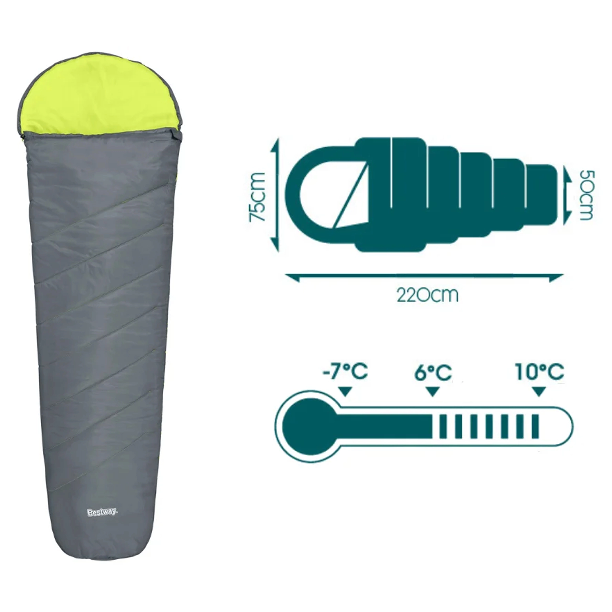 Uživajte u mirnom snu u prirodi s Bestway mumija vrećom za spavanje koja kombinira nisku težinu, izdržljive materijale i pouzdanu toplinsku izolaciju. Polukružna kapuljača štiti glavu i vrat od hladnoće, dok čvrst vanjski materijal od poliestera 170T odolijeva vlazi i trošenju.