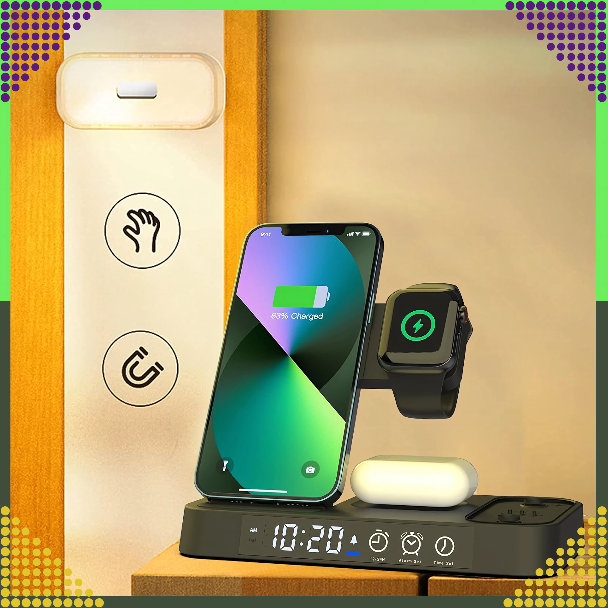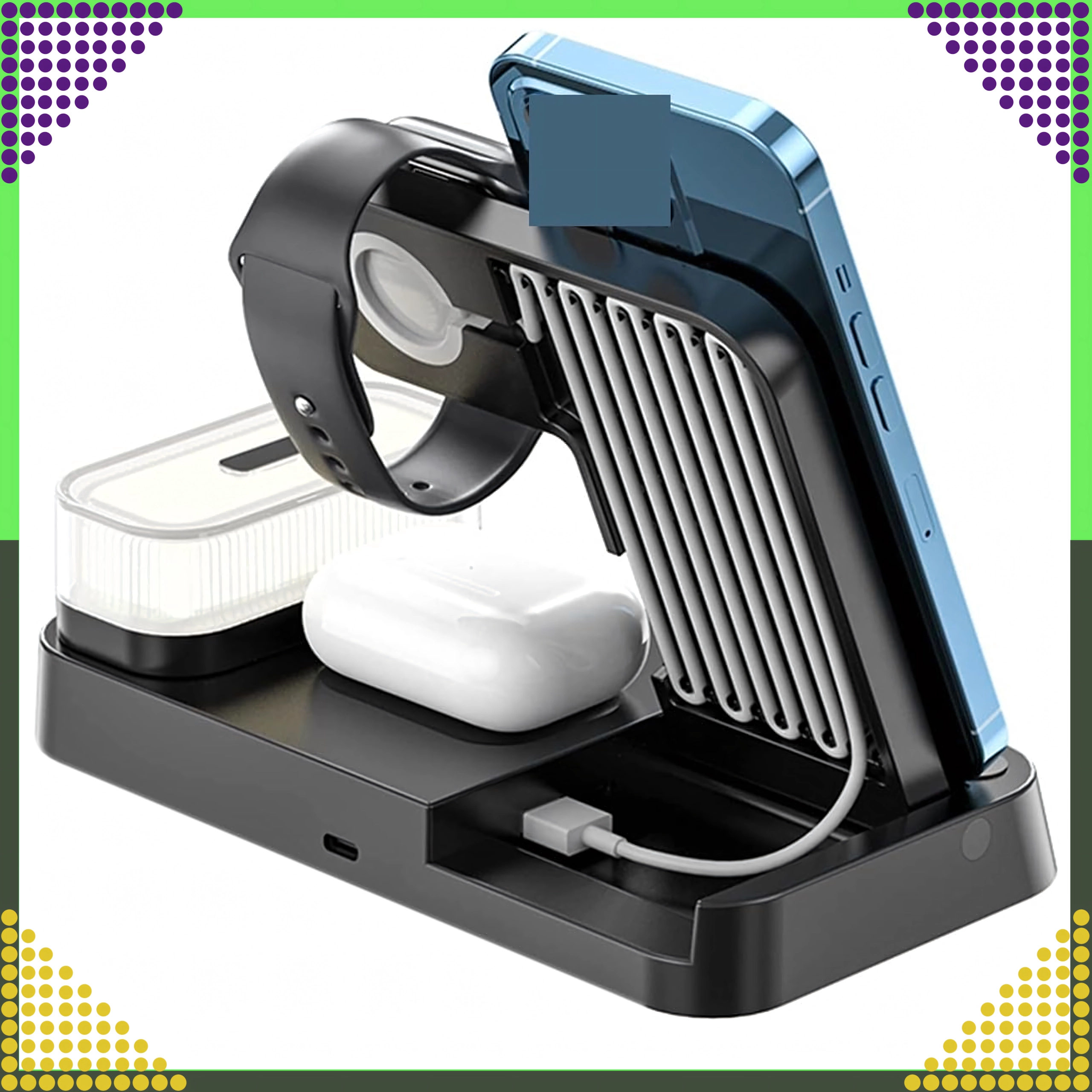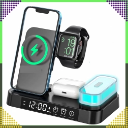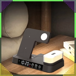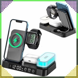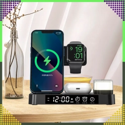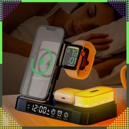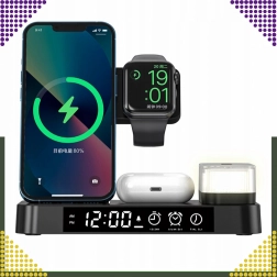 Ovaj moderan bežični punjač 4-u-1 omogućuje praktično istovremeno punjenje telefona, pametnog sata i bežičnih slušalica. Podržava standard Qi do 15 W za brzo i sigurno punjenje, a zahvaljujući magnetskom držanju čvrsto drži kompatibilan pametni telefon u uspravnom položaju.