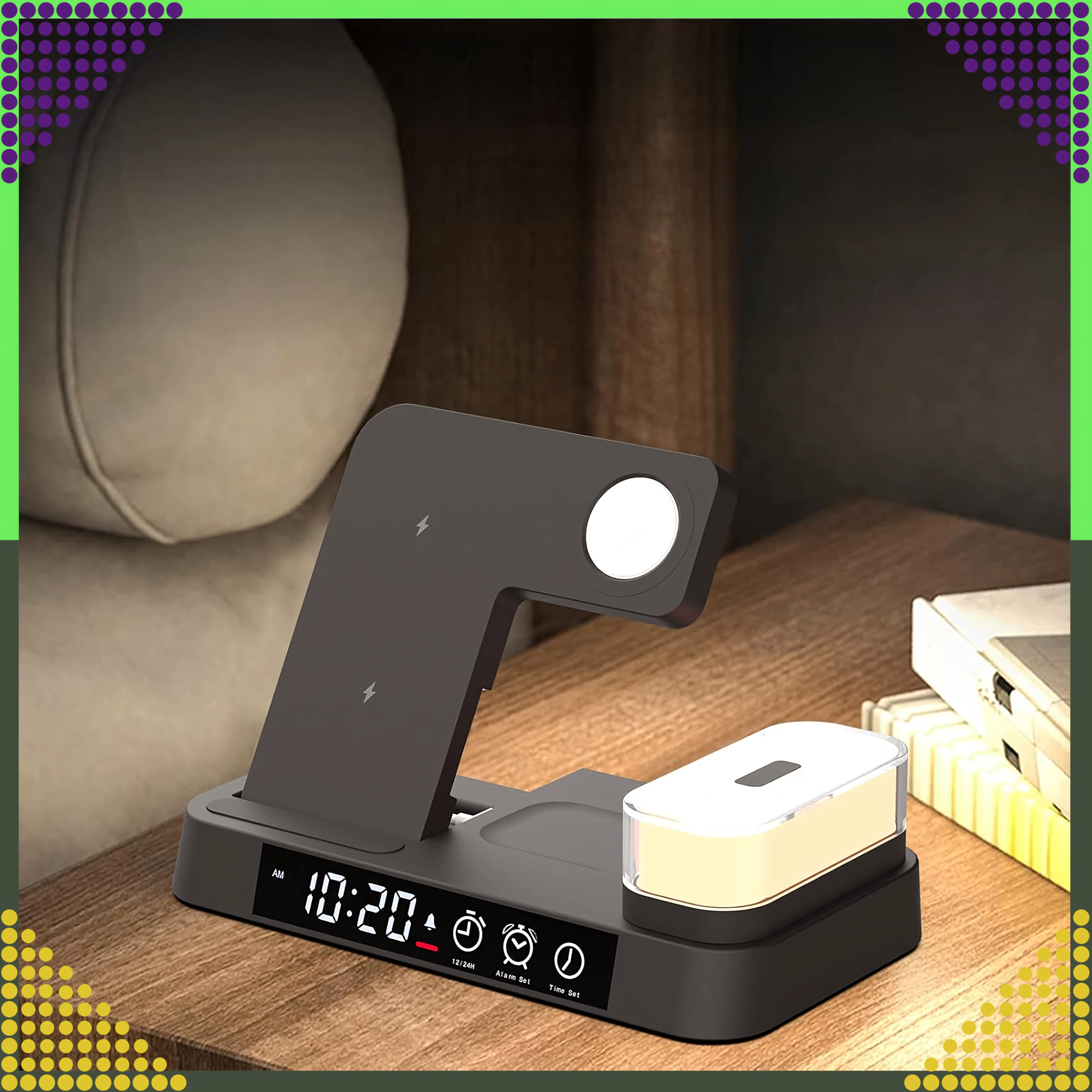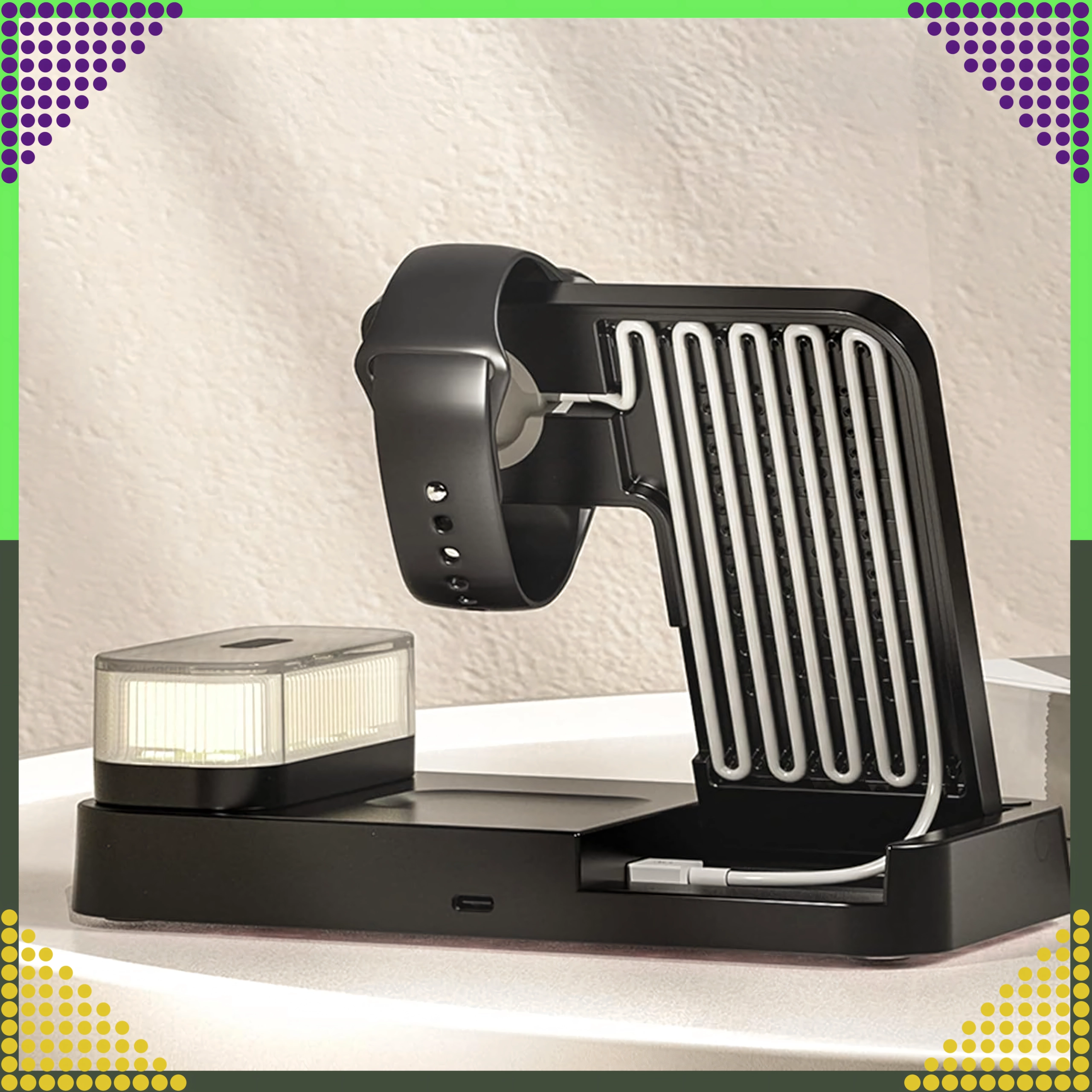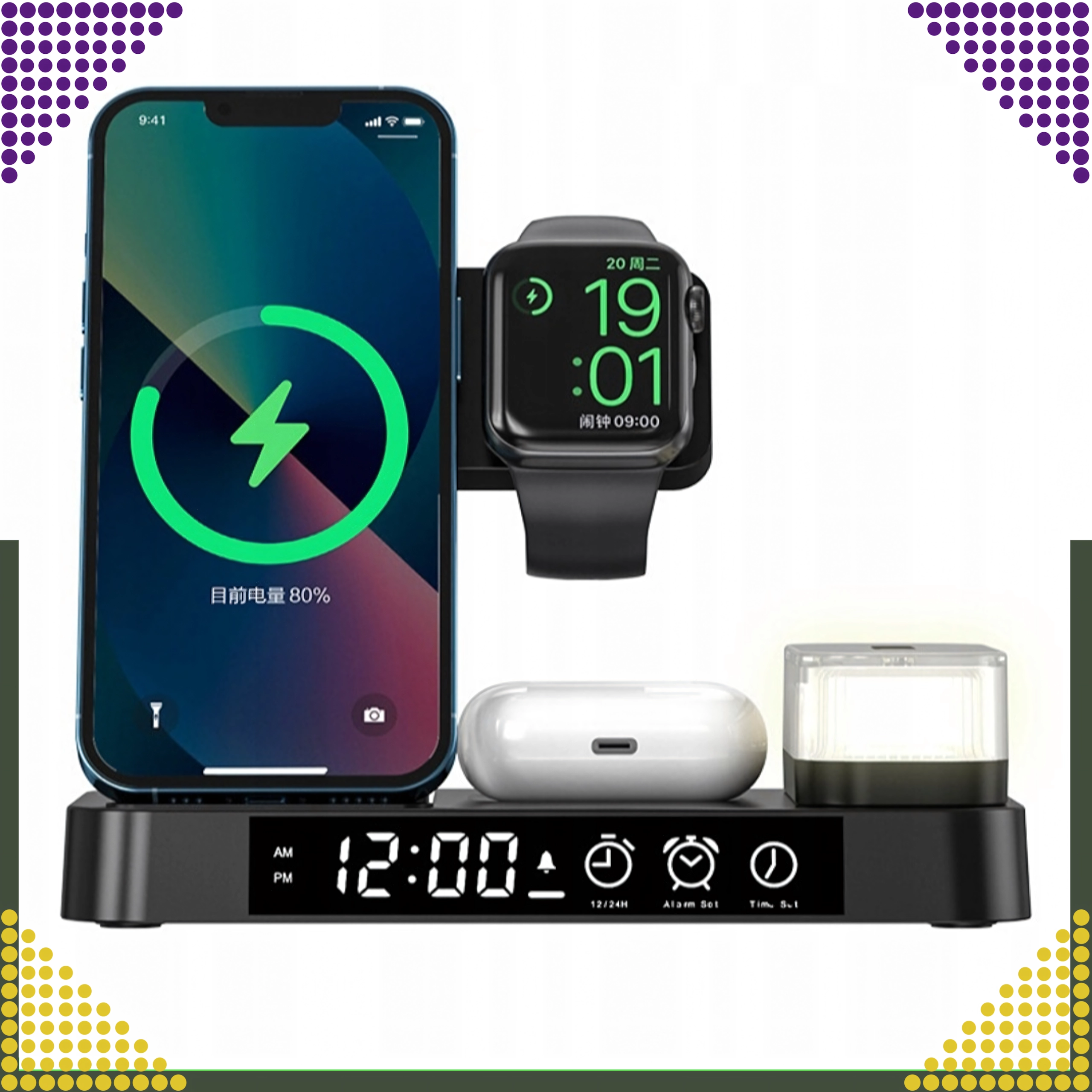 Punite istovremeno pametni telefon, Apple Watch i slušalice. Integrirani stalak drži telefon pod idealnim kutom za obavijesti i video pozive.