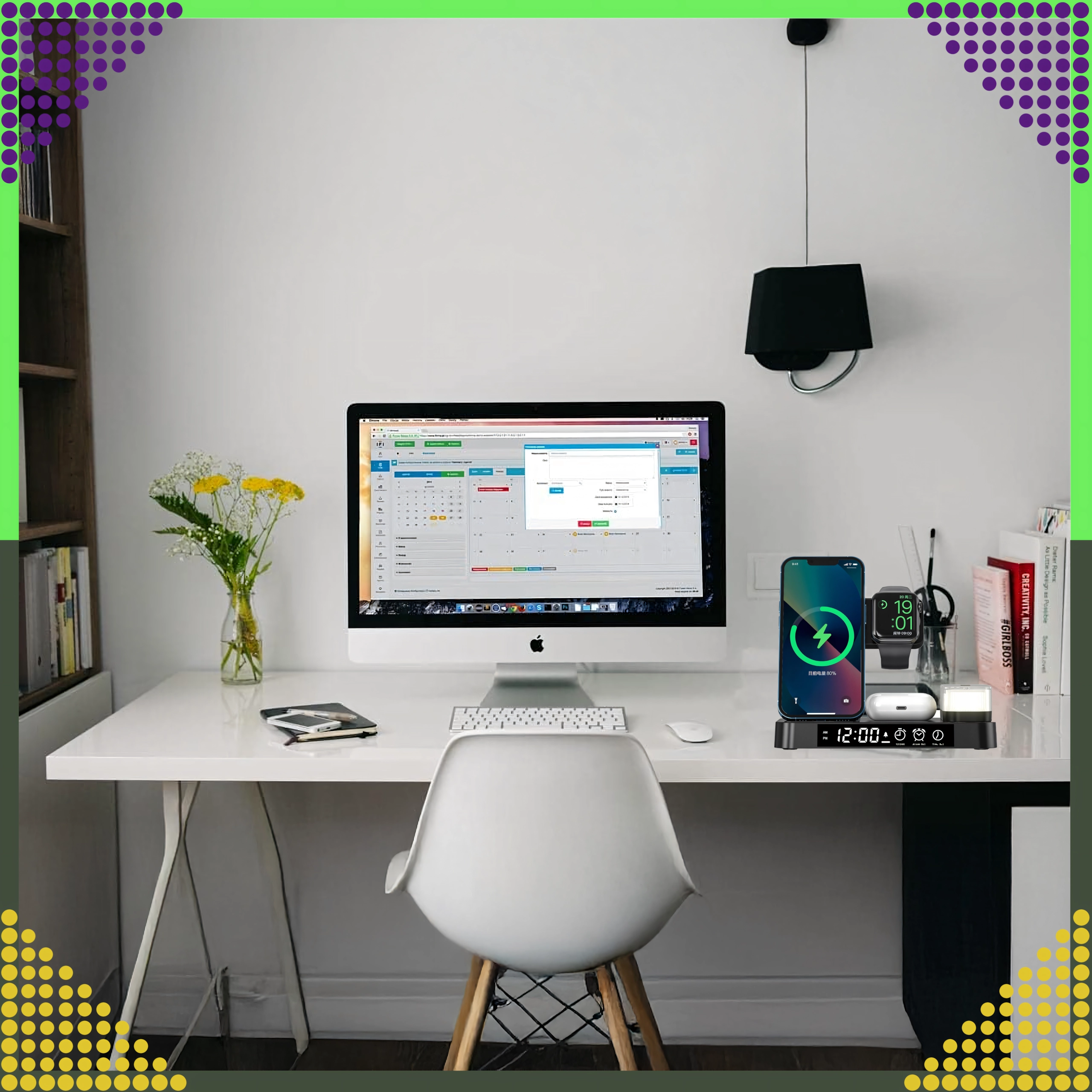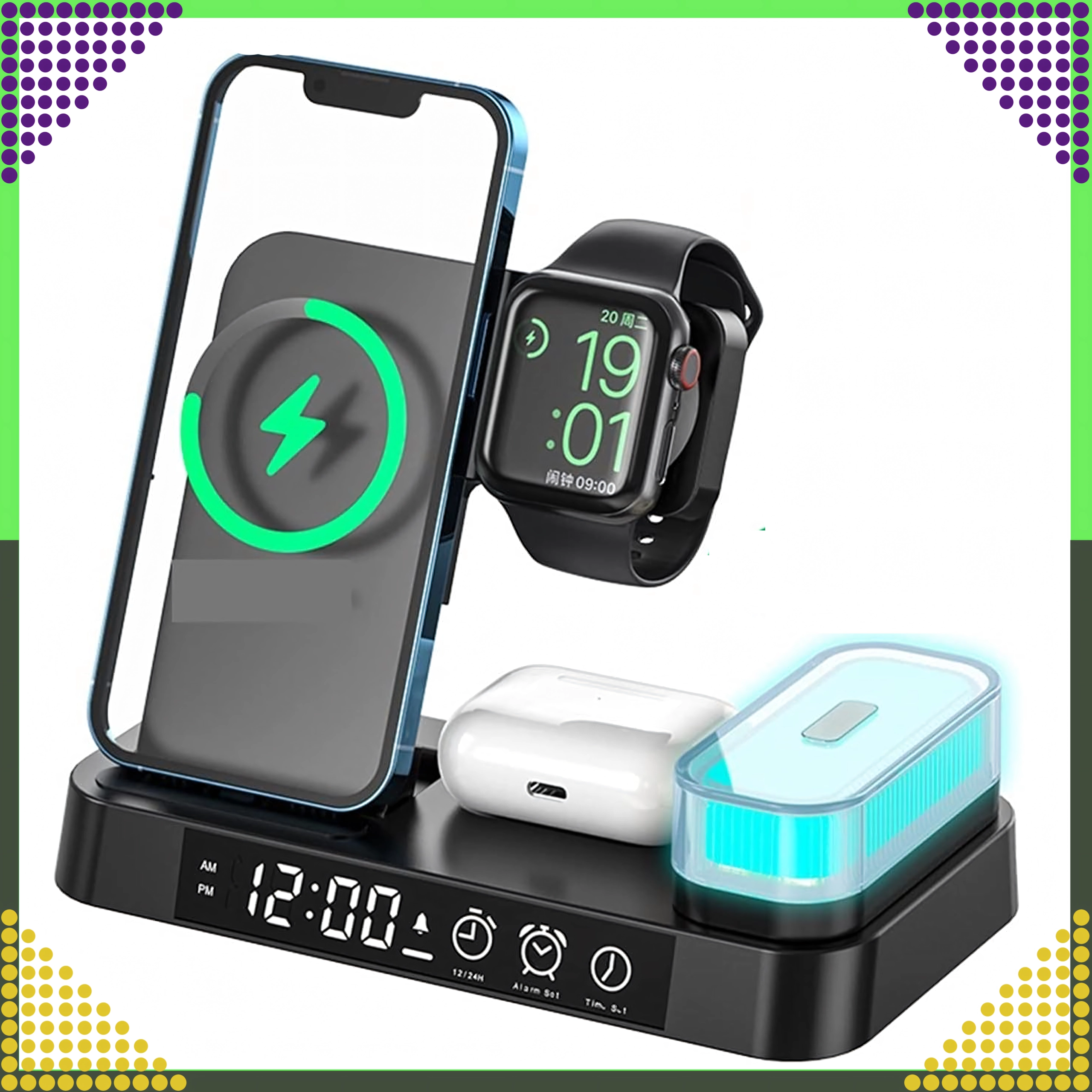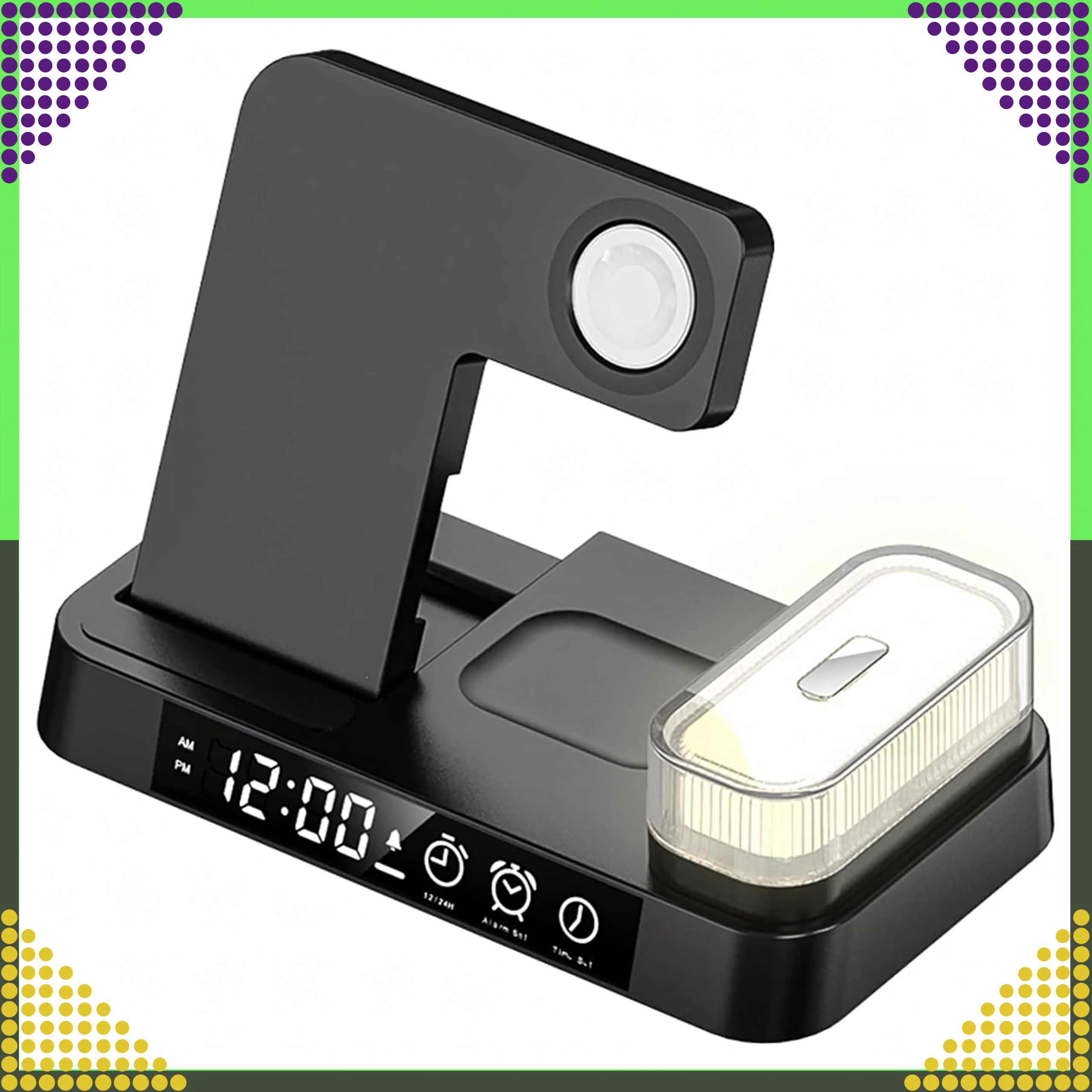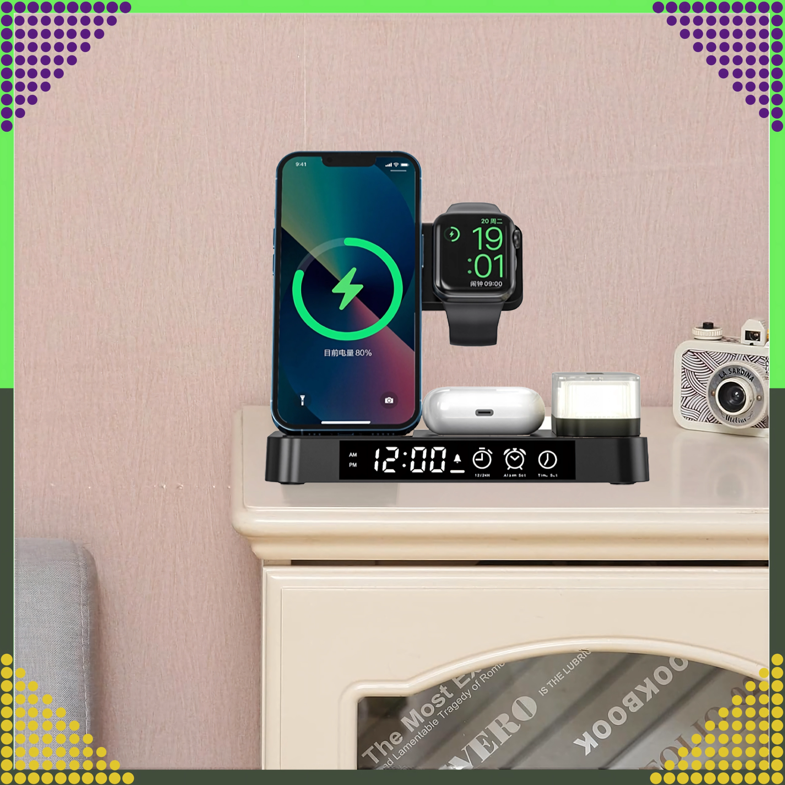 Punite istovremeno pametni telefon, Apple Watch i slušalice. Integrirani stalak drži telefon pod idealnim kutom za obavijesti i video pozive.
