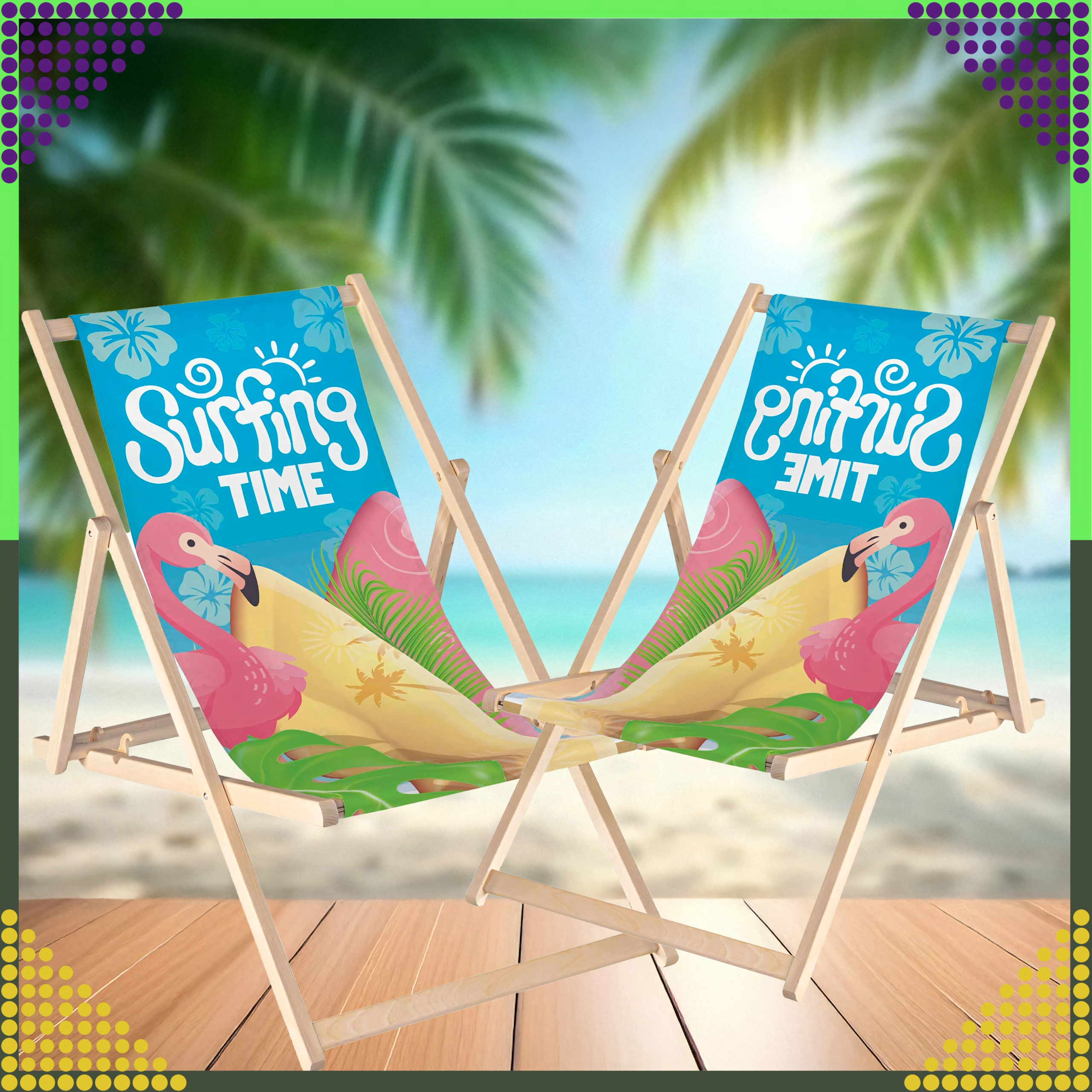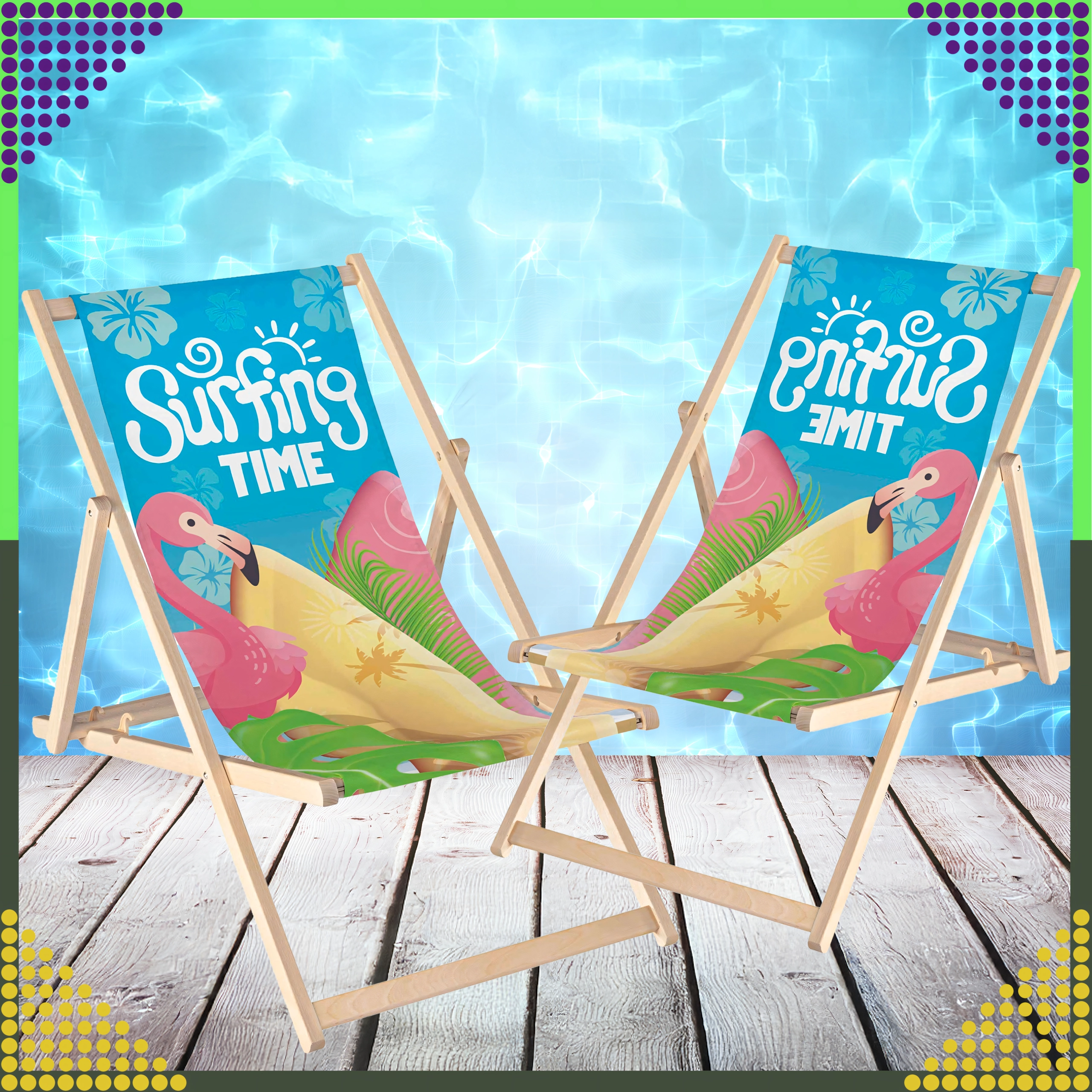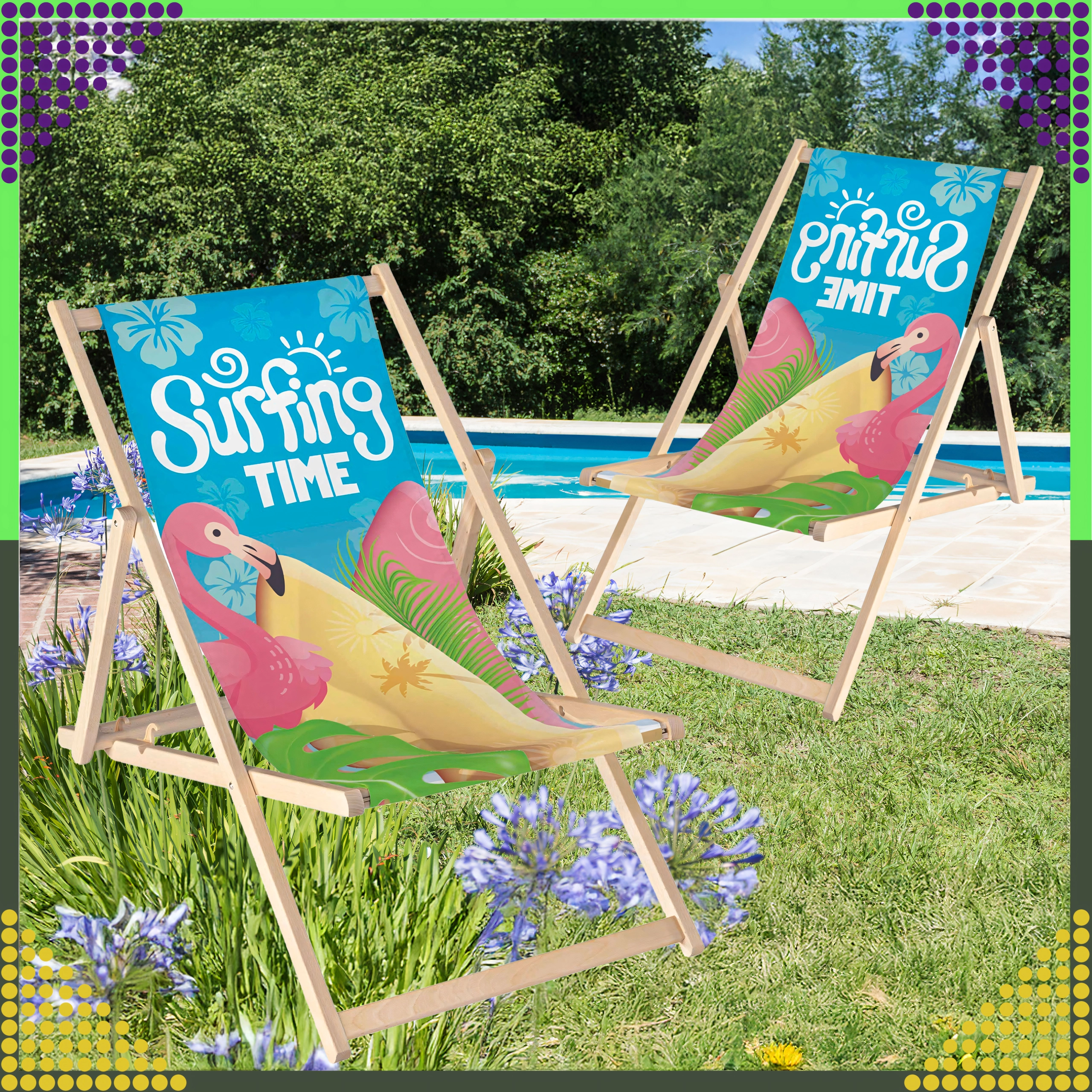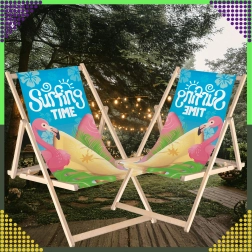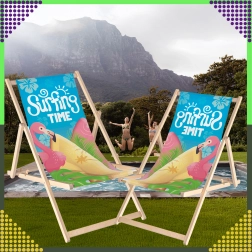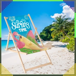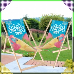 Set dviju sklopivih ležaljki kombinira prirodno drvo s izdržljivom platnenom tkaninom i šarenim printom flaminga „Surfing Time“. Zahvaljujući višepoložajnom mehanizmu lako ćete podesiti udoban kut sjedenja ili ležanja. Lagana konstrukcija omogućuje jednostavno prenošenje i skladištenje kod kuće i na putovanjima.