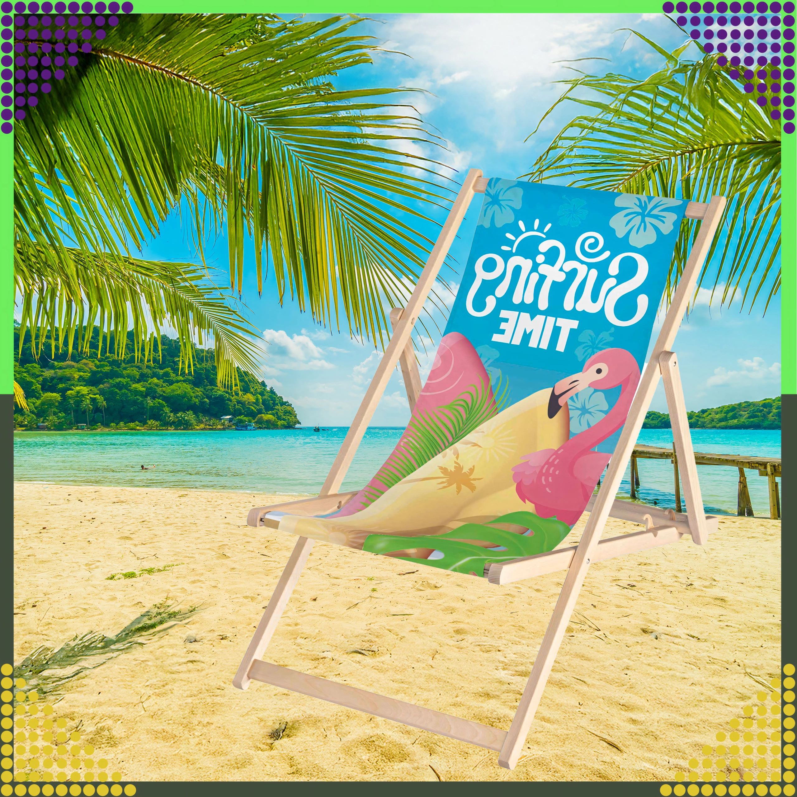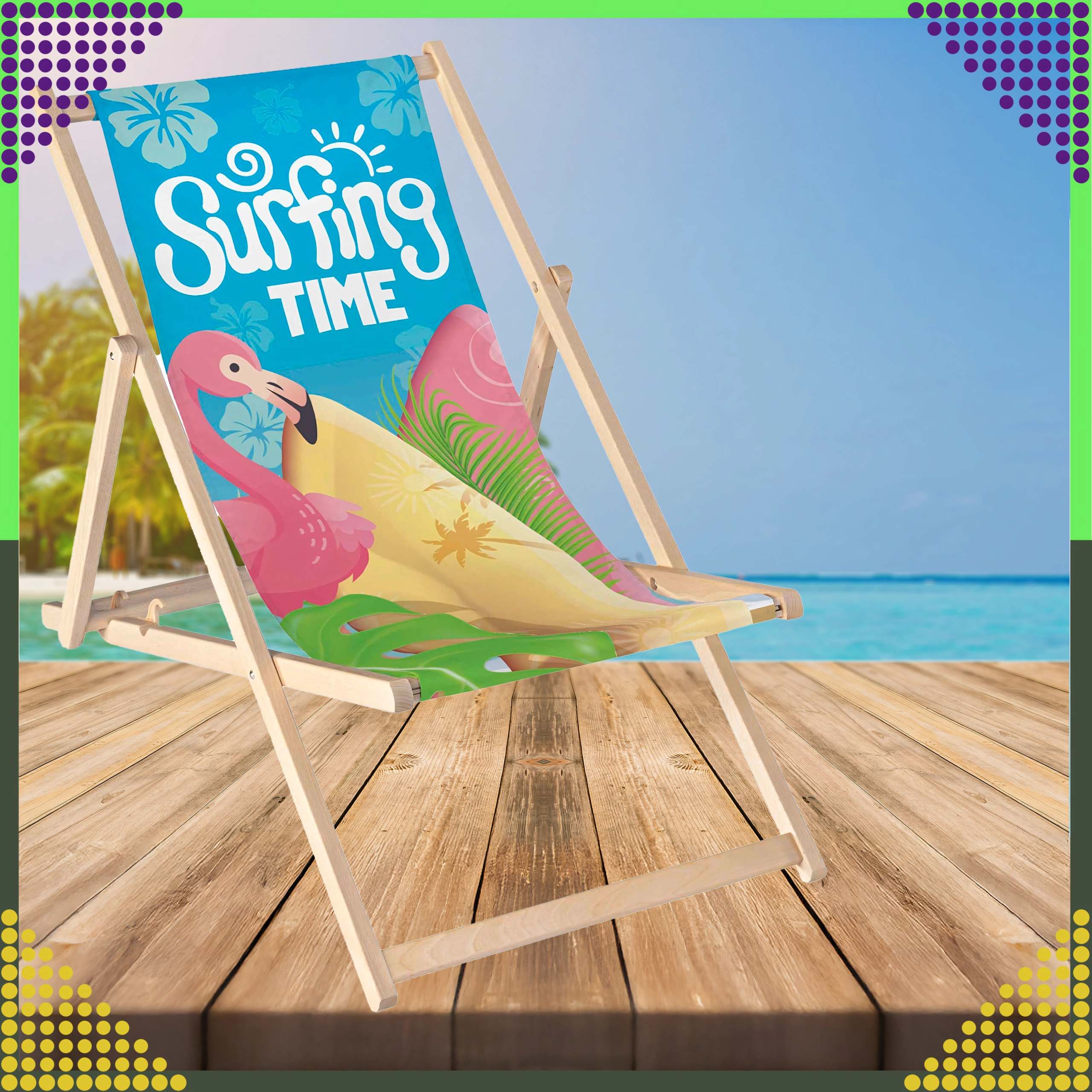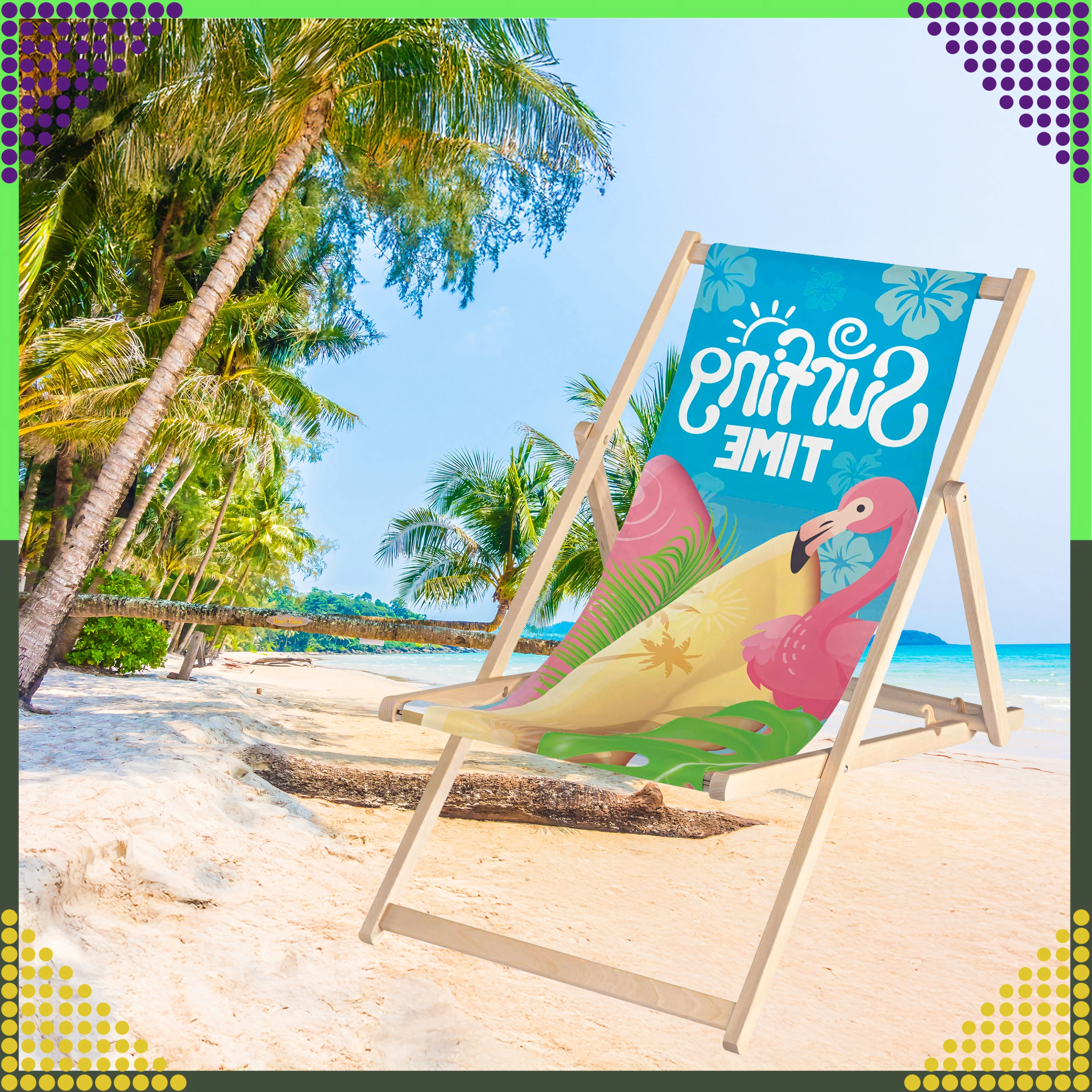Set dviju sklopivih ležaljki kombinira prirodno drvo s izdržljivom platnenom tkaninom i šarenim printom flaminga „Surfing Time“. Zahvaljujući višepoložajnom mehanizmu lako ćete podesiti udoban kut sjedenja ili ležanja. Lagana konstrukcija omogućuje jednostavno prenošenje i skladištenje kod kuće i na putovanjima.