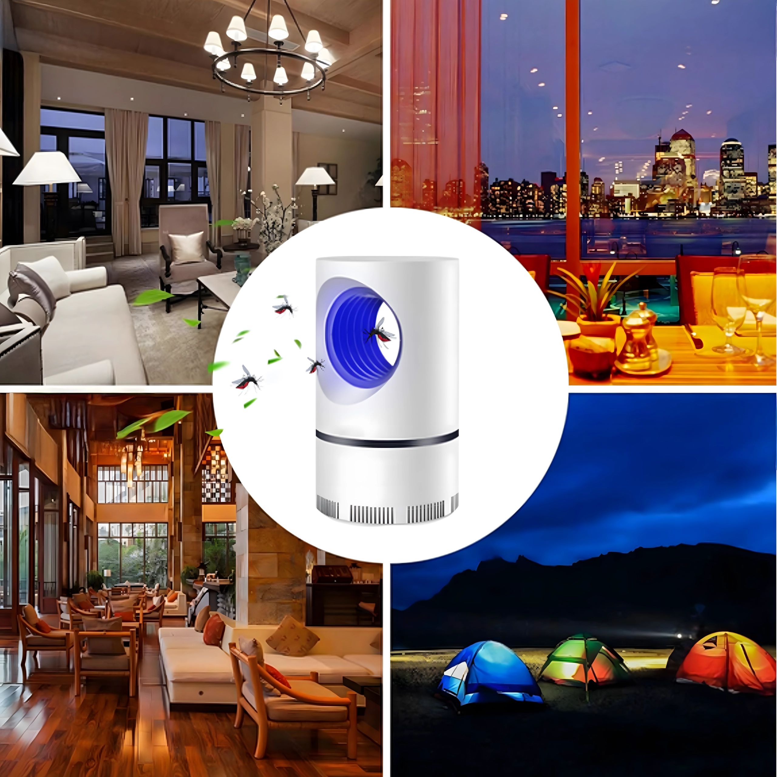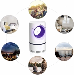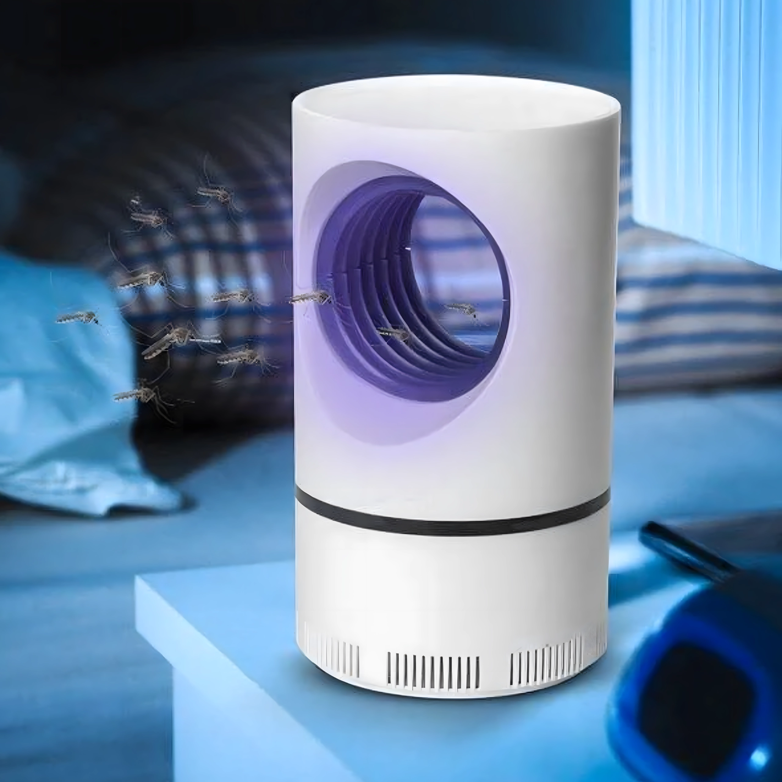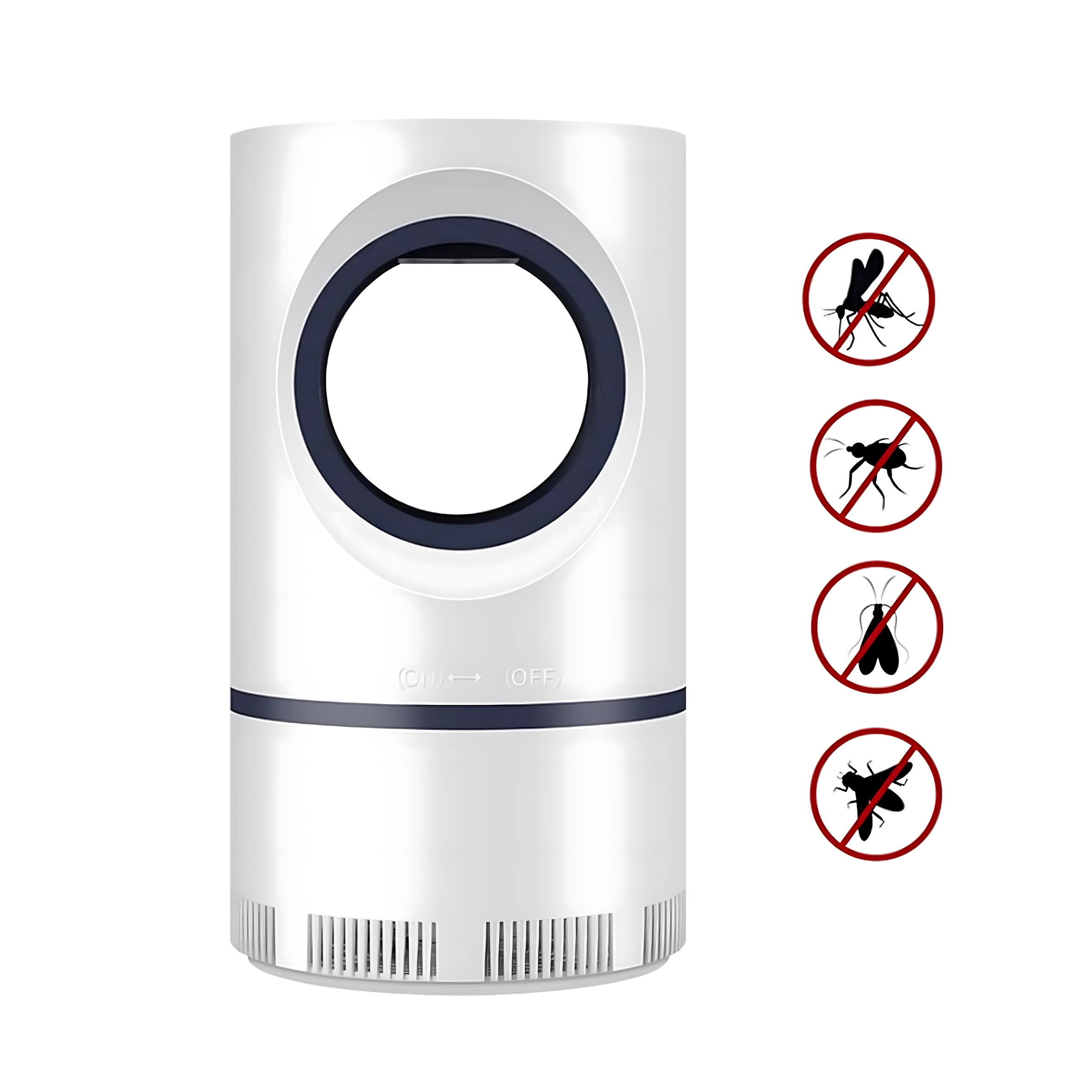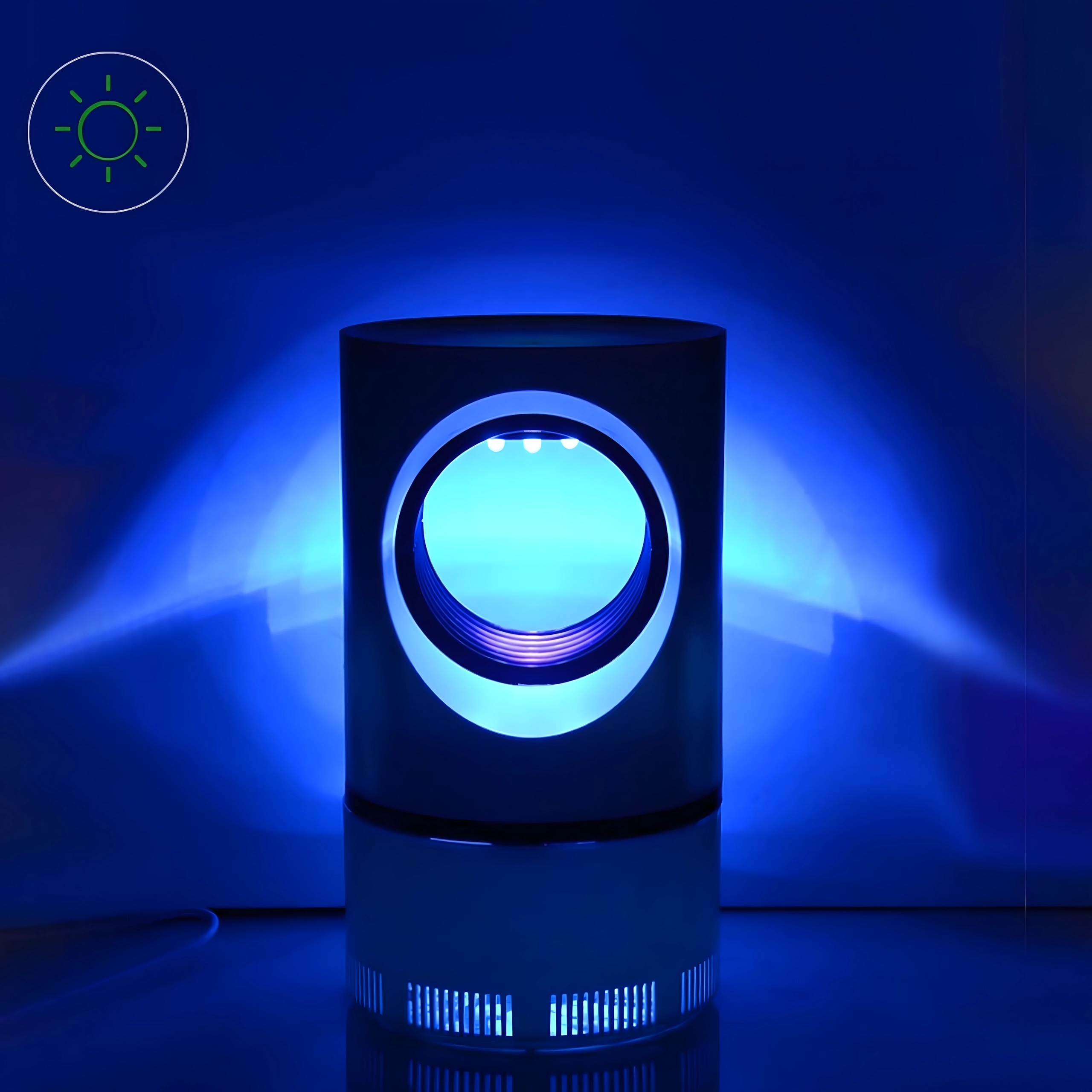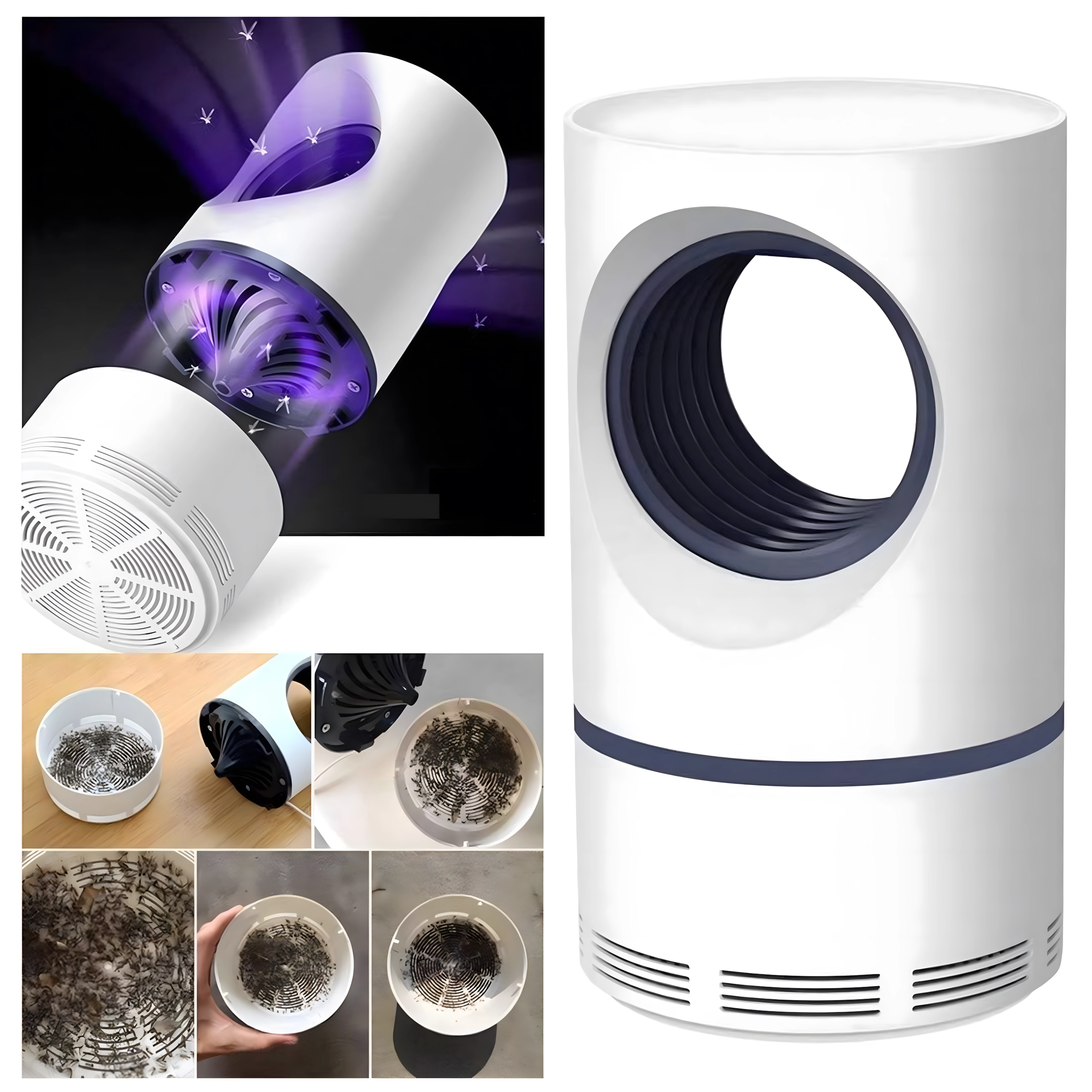 UV svjetlo privlači insekte, a ugrađeni ventilator ih uvlači u sabirnu komoru – bez kemikalija, mirisa i električnih ispusta. Pogodno za spavaću sobu i za djecu.