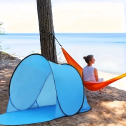 Uživajte u sjeni i privatnosti bilo gdje uz vodu i u prirodi. Ovaj plažni pop-up šator rasklopi se doslovno jednim pokretom, a jednako brzo ga ponovno sklopite u plosnatu okruglu torbu. Zahvaljujući elastičnoj konstrukciji stabilan je, a pritom ostaje vrlo lagan i jednostavan za prenošenje.
