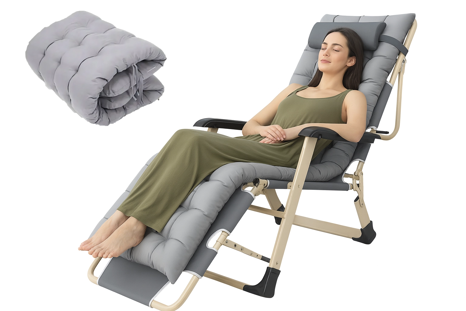 Podesivi naslon za leđa i noge omogućuju vam pronaći idealan položaj za opuštanje, čitanje ili spavanje. Odvojivi jastučić rasterećuje vratnu kralježnicu i povećava udobnost.