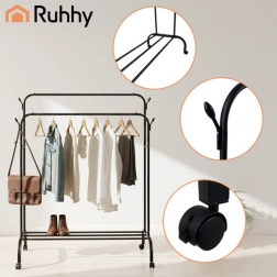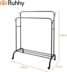 Tražite praktično i prostorno učinkovito rješenje za odjeću, obuću i dodatke? Stalak RUHHY s dvije šipke pruža dovoljno mjesta za košulje, kapute i haljine bez gužvanja. Okretni kotačići s hodom od 360° i kočnicom omogućuju lako premještanje i sigurnu stabilnost, dok donja polica nosi nekoliko pari cipela ili spremnik-kutija.