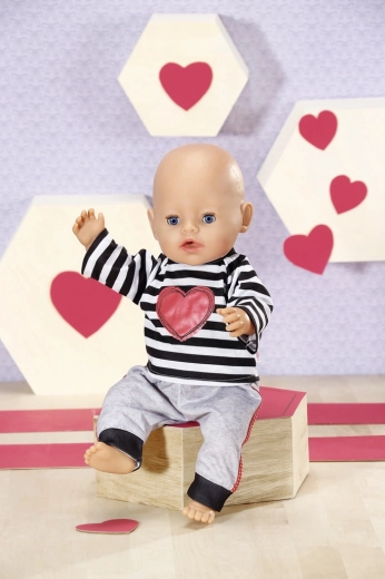 Odjeća Dolly Moda osmišljena je tako da se lako kombinira i posuđuje između različitih lutaka. Ova prugasta trenirka s majicom i hlačama idealna je za udobnu kućnu igru i za stilske izlete lutki. Upadljivo srce na crno-bijelim prugama i decentne sive hlače s kontrastnim detaljima daju outfitu moderan izgled.