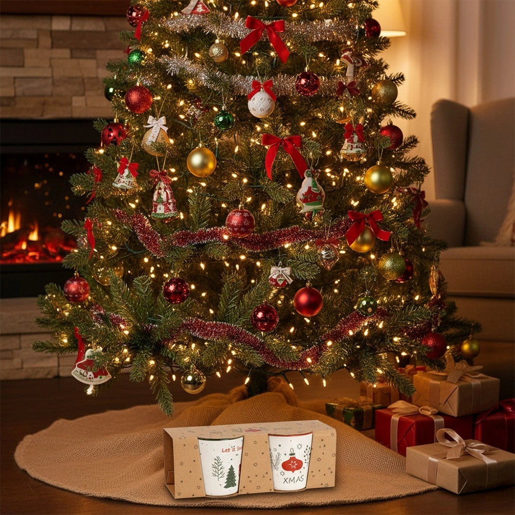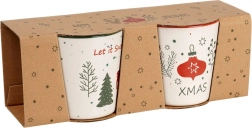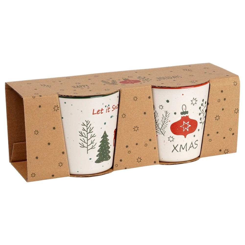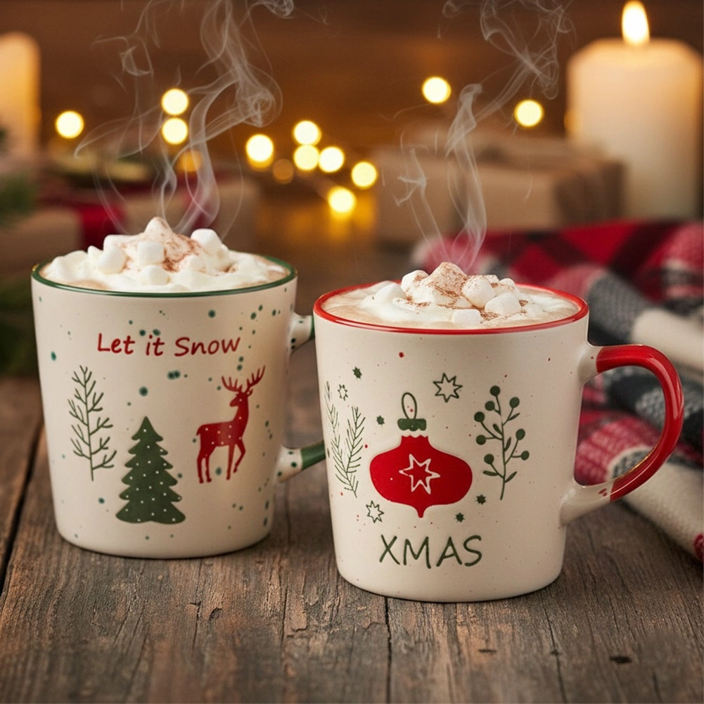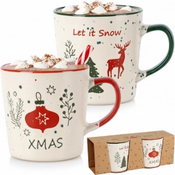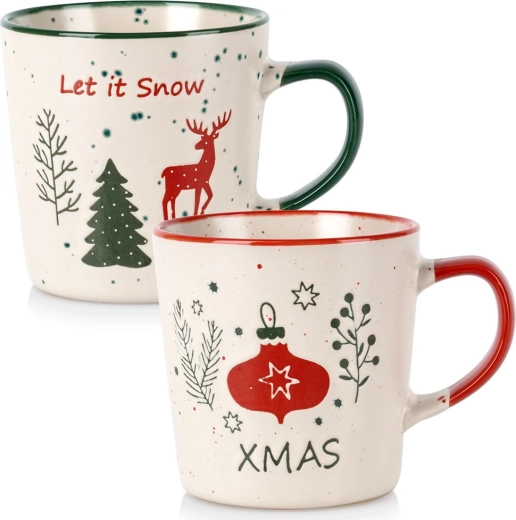 Bež šalice s obojenim rubom i drškom krase motivi LET IT SNOW i XMAS, jelen, borovi i ukrasi – idealne za zimske čajeve i vruću čokoladu.