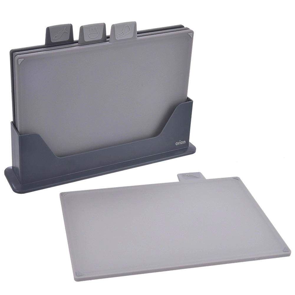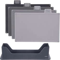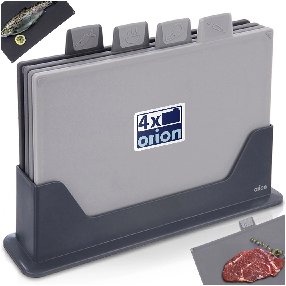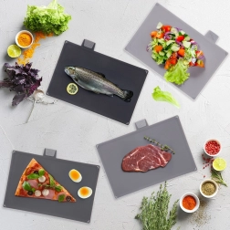 Ovaj set od 4 daske u sivim nijansama dizajniran je za svakodnevno kuhanje s naglaskom na higijenu i organizaciju. Grafičke oznake na gornjim jezičcima jasno označuju upotrebu za povrće, svježe meso, gotova jela i ribu, pa lako održavate čistoću i red pri pripremi obroka.